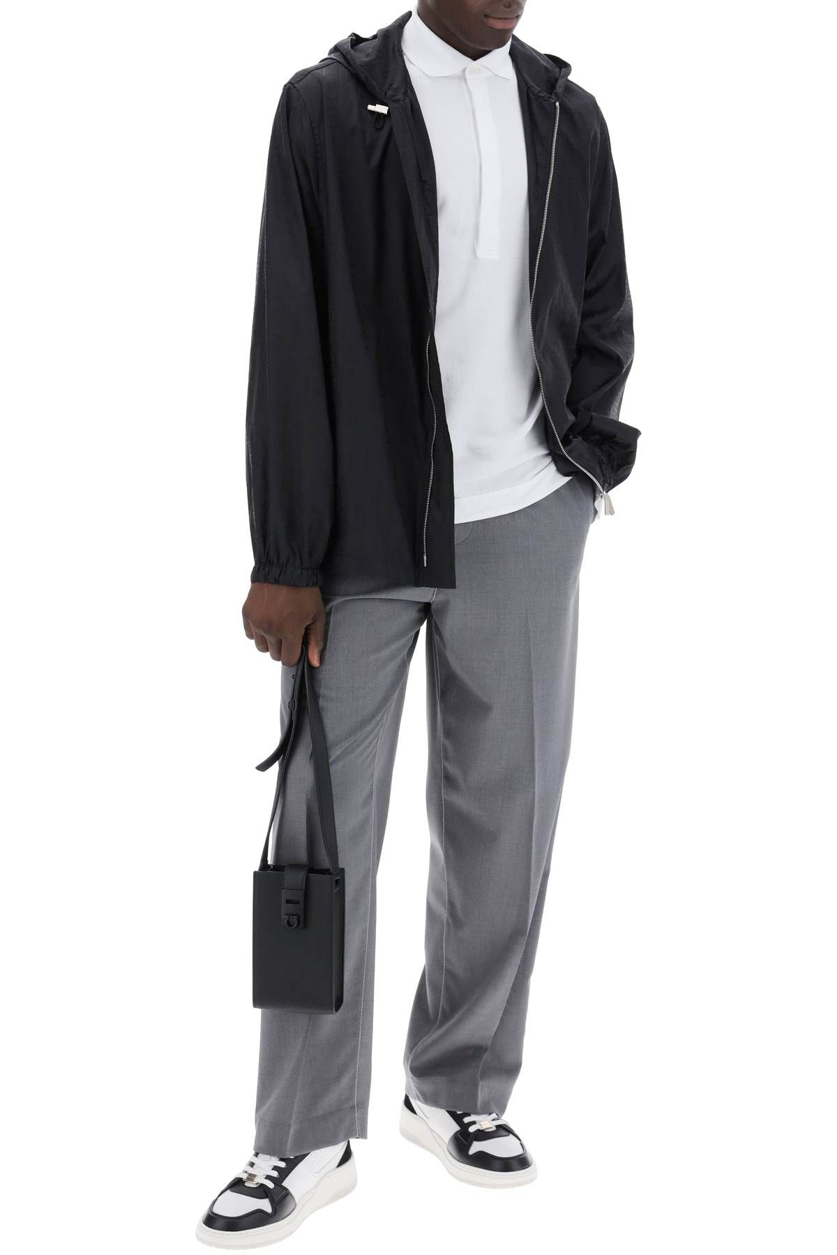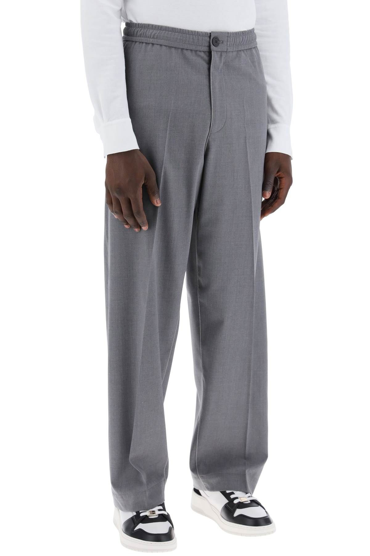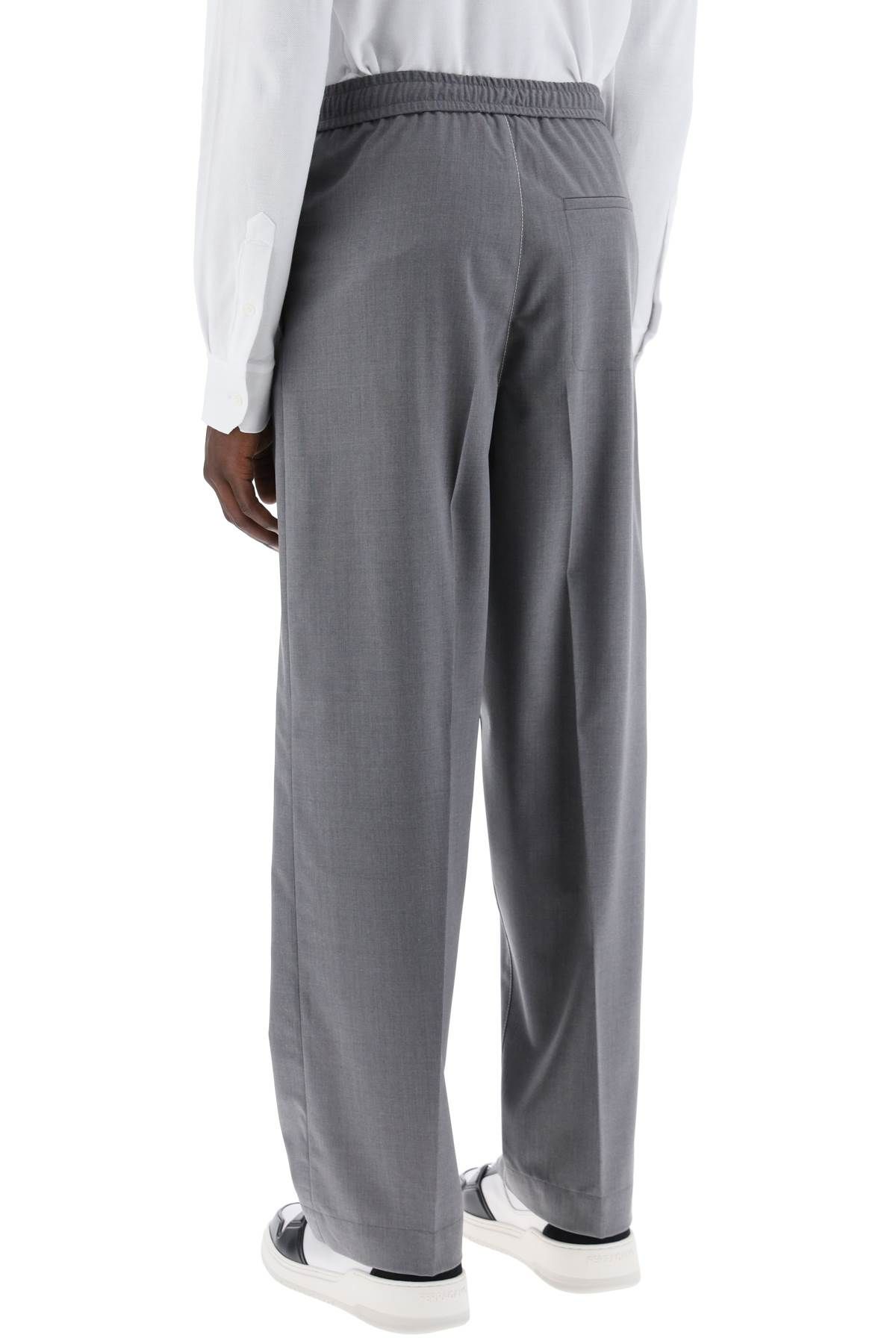 These tailored trousers from FERRAGAMO are made of lightweight virgin wool fabric and feature contrasting stitching. The elasticated waistband has an internal drawstring, while the closure is a button with engraved logo and hidden zip. Side pockets are seamlessly integrated into the seams, and there is also a welt pocket on the back. The front and back creases are inspired by refined men's tailoring, while the relaxed straight leg offers a versatile look. The model is 187 cm tall and wears
