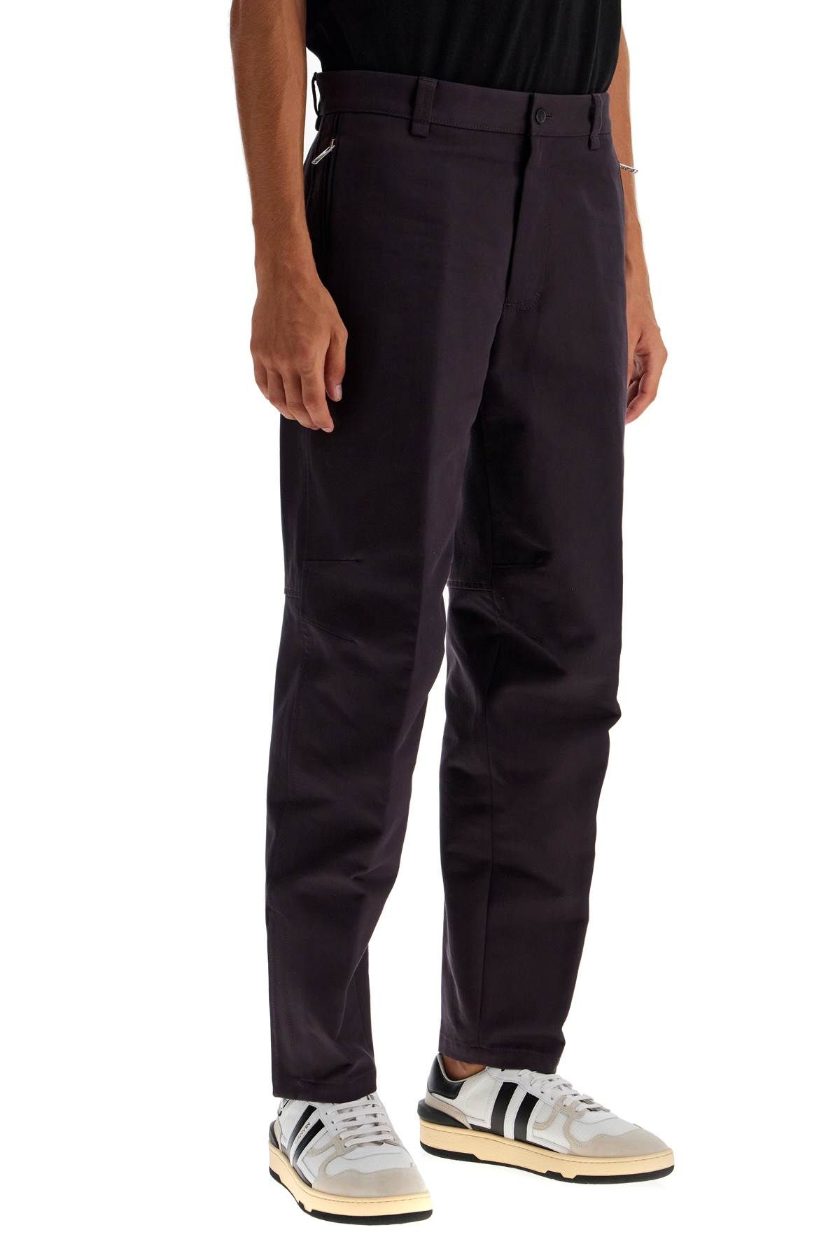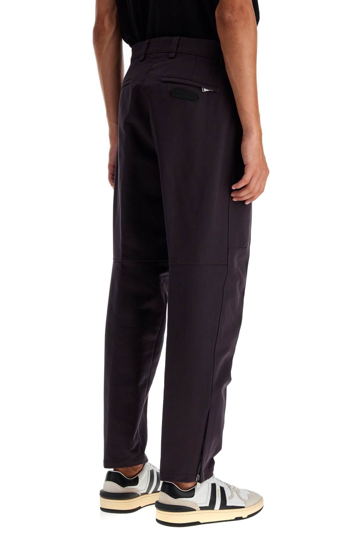 Lanvin biker pants made of cotton gabardine, featuring a straight leg with zippered cuffs, French pockets with zippers and welt pockets on the back. Hidden zipper and button closure. The model is 187 cm tall and wears size IT 48.