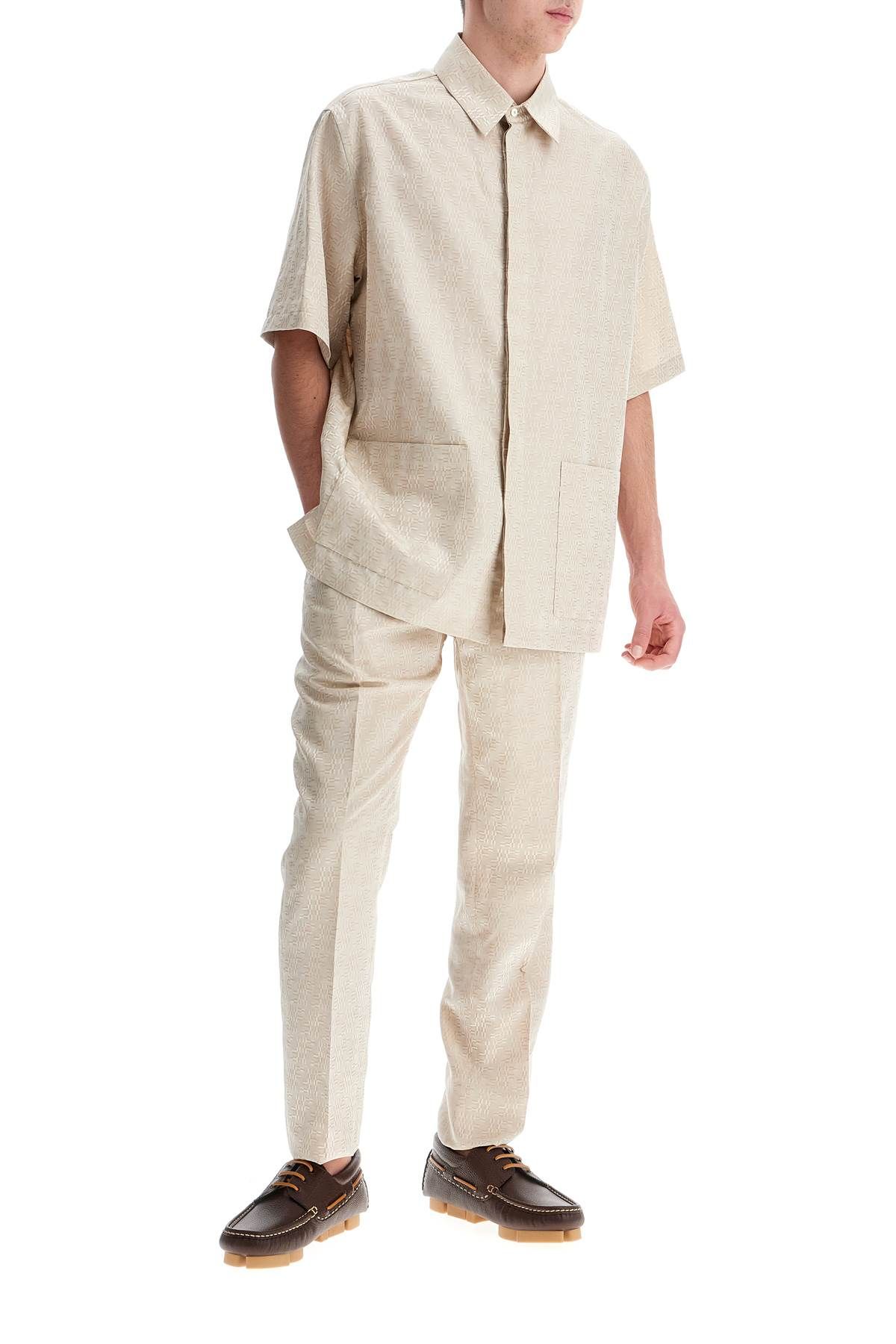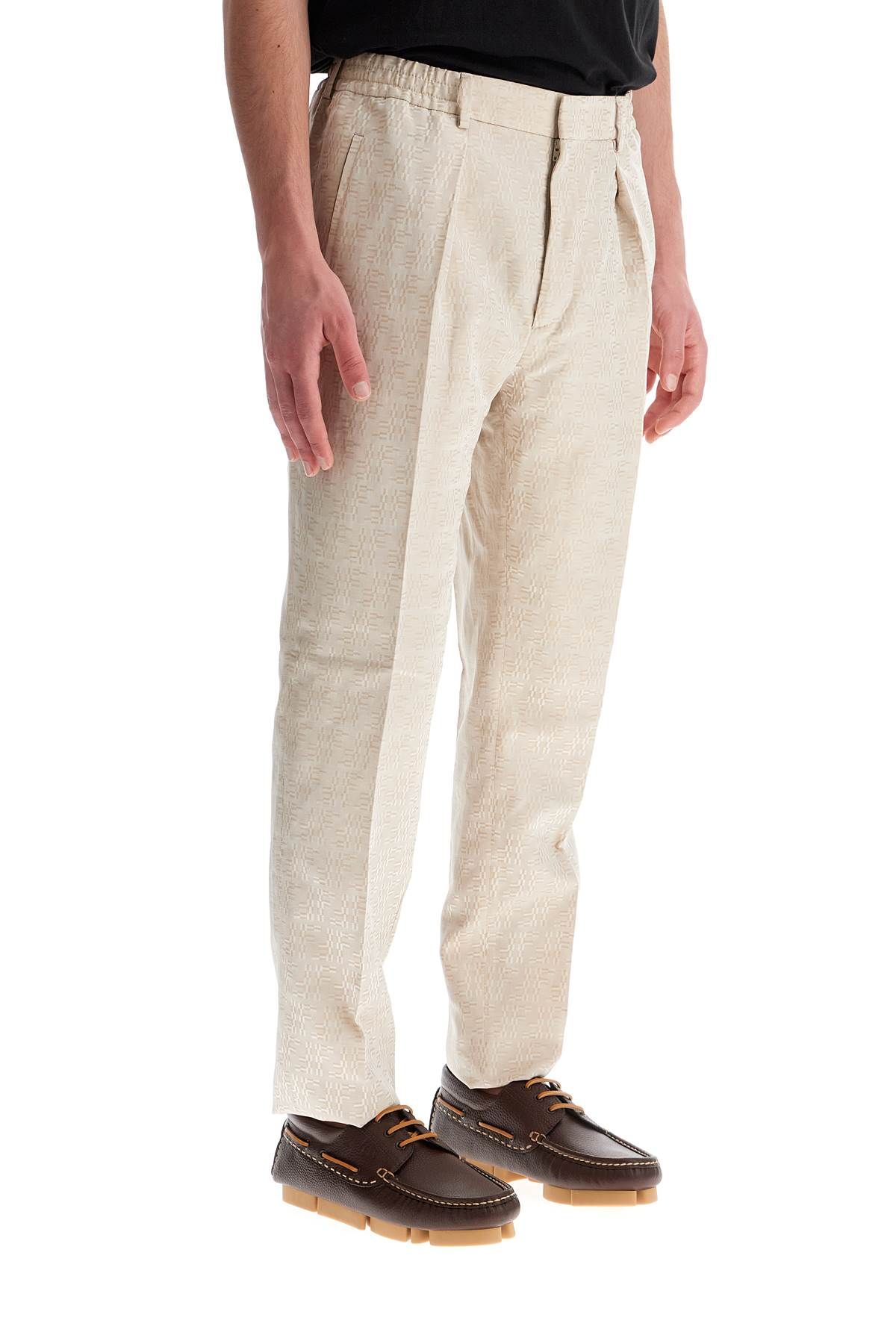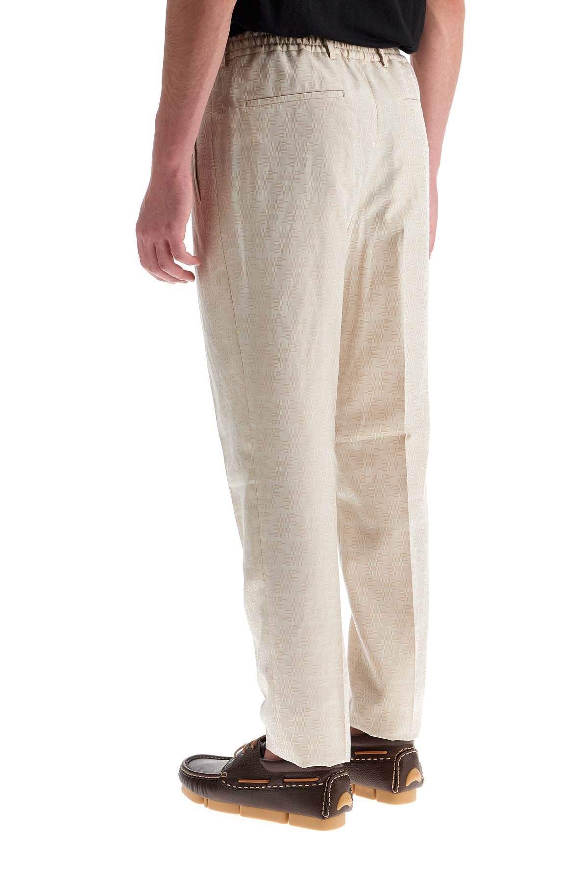 Crafted in jacquard of viscose, linen and wool with the FF Labyrinth pattern, these Fendi tailored trousers have a soft and tapered cut with pleats. They feature four welt pockets, an elasticated waistband with belt loops, and a front closure with hidden zip and hook. The bottom is unhemmed for sartorial finishes. The model is 182 cm tall and wears size IT 48.