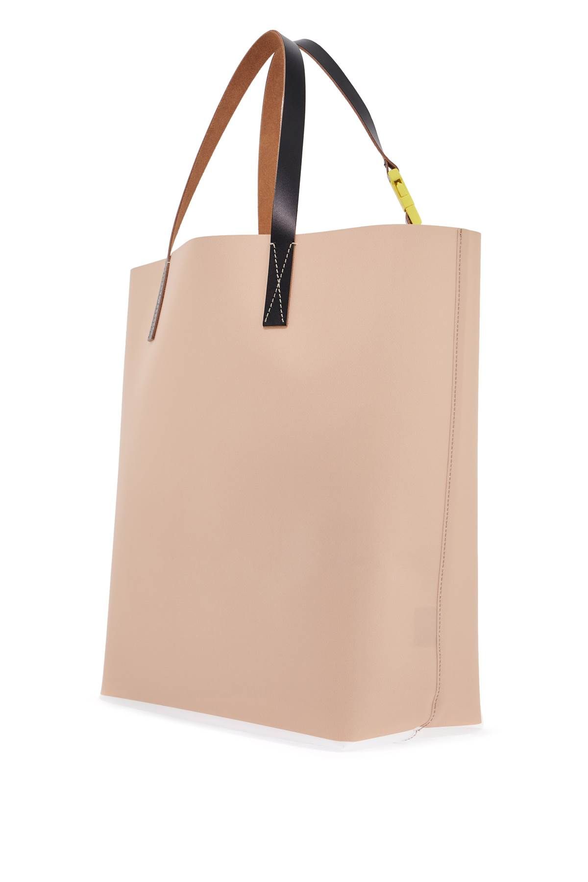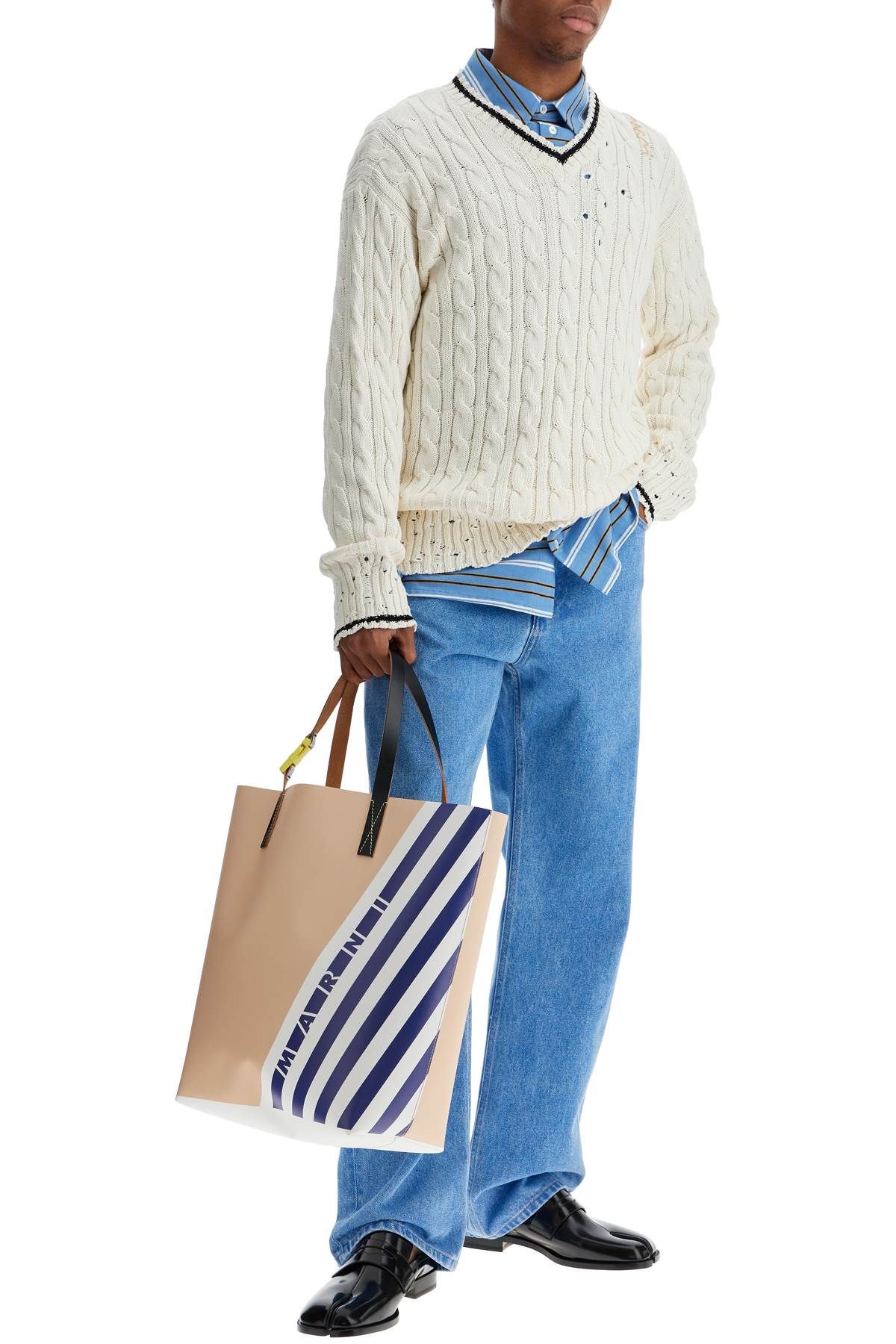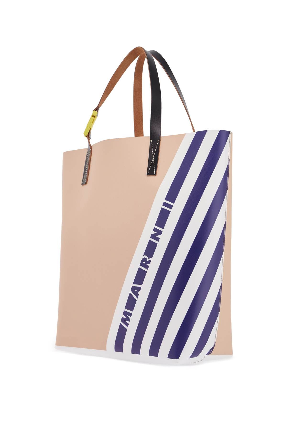 The Tribeca shopping bag by Marni is made of PVC with a striped detail and leather handles, one of which features a buckle. Unlined.