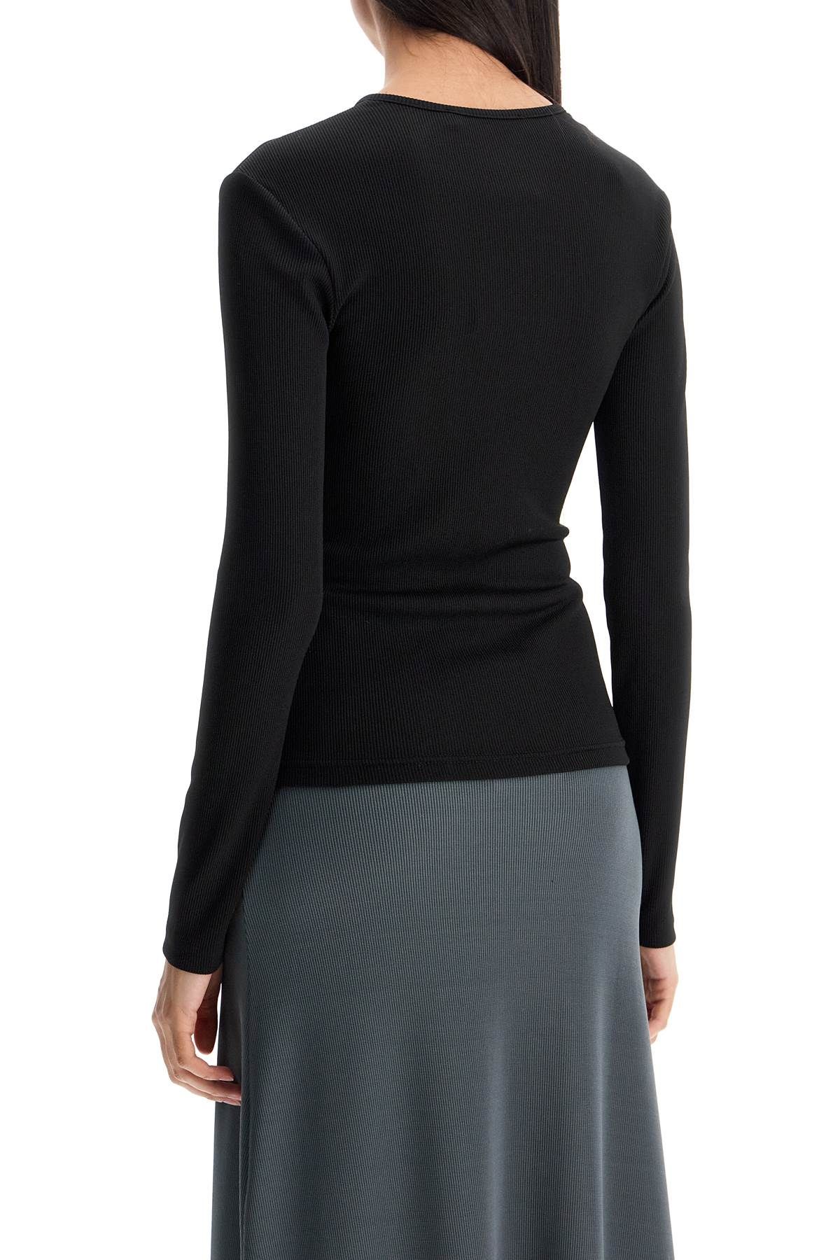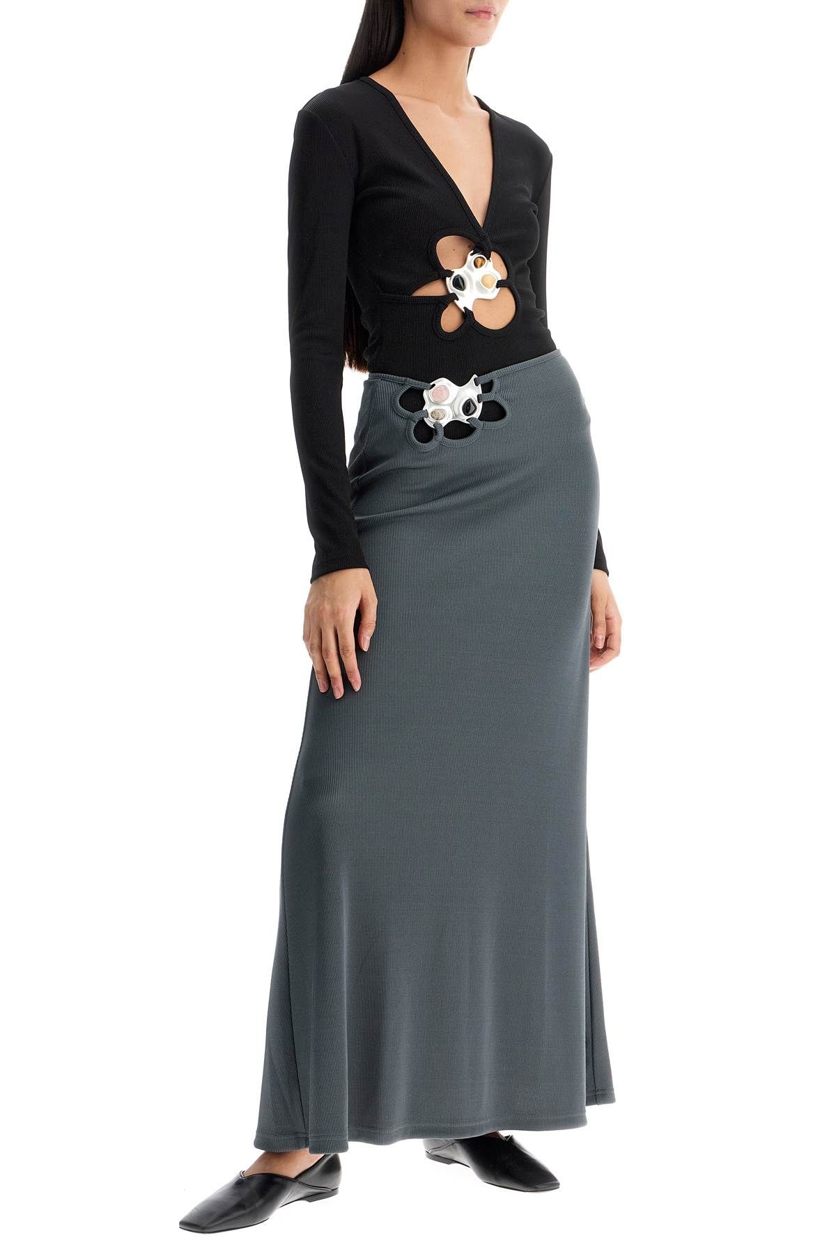 The Christopher Esber long-sleeved top is a fitted piece with a V-neckline, made from soft ribbed stretch fabric. It features a metal and stone accessory on the front, highlighted by cut-out details. The model is 177 cm tall and wears a UK size 6.