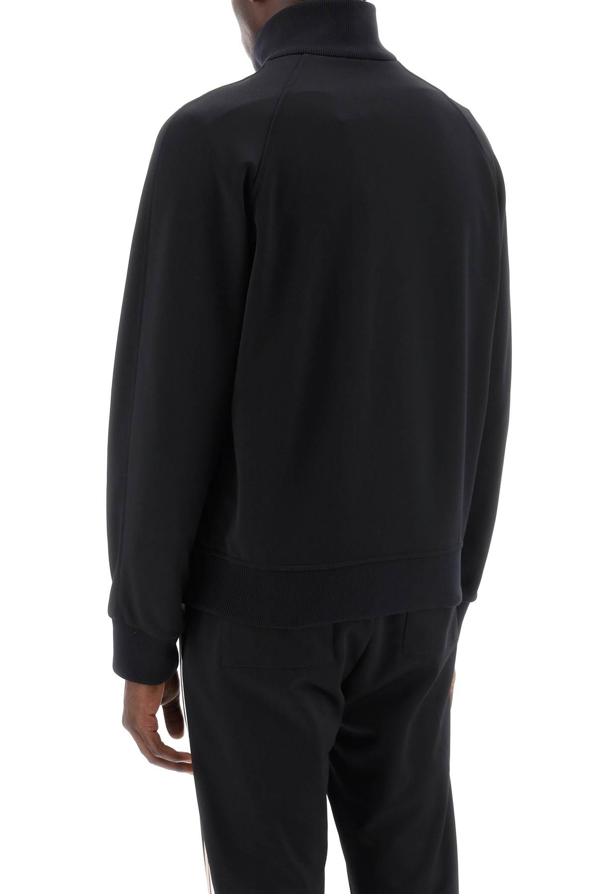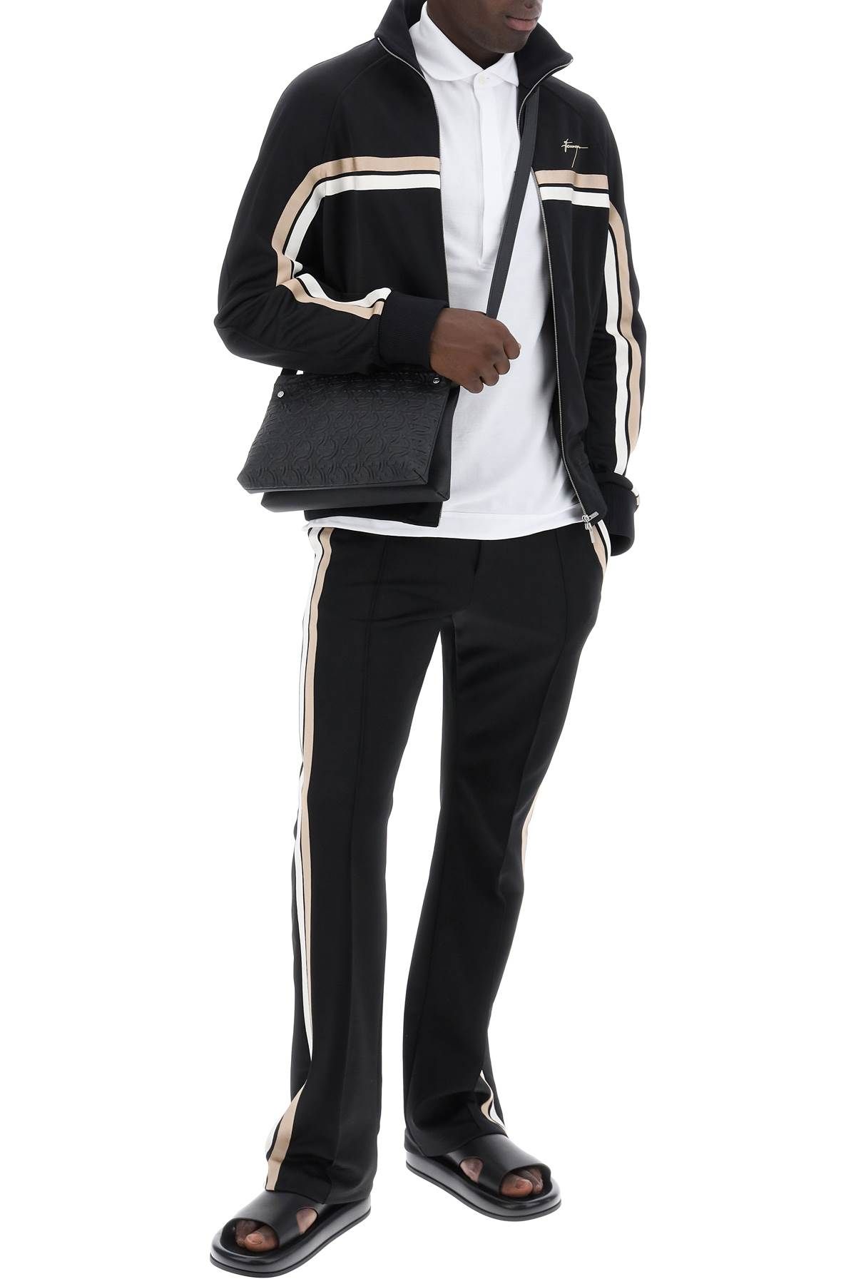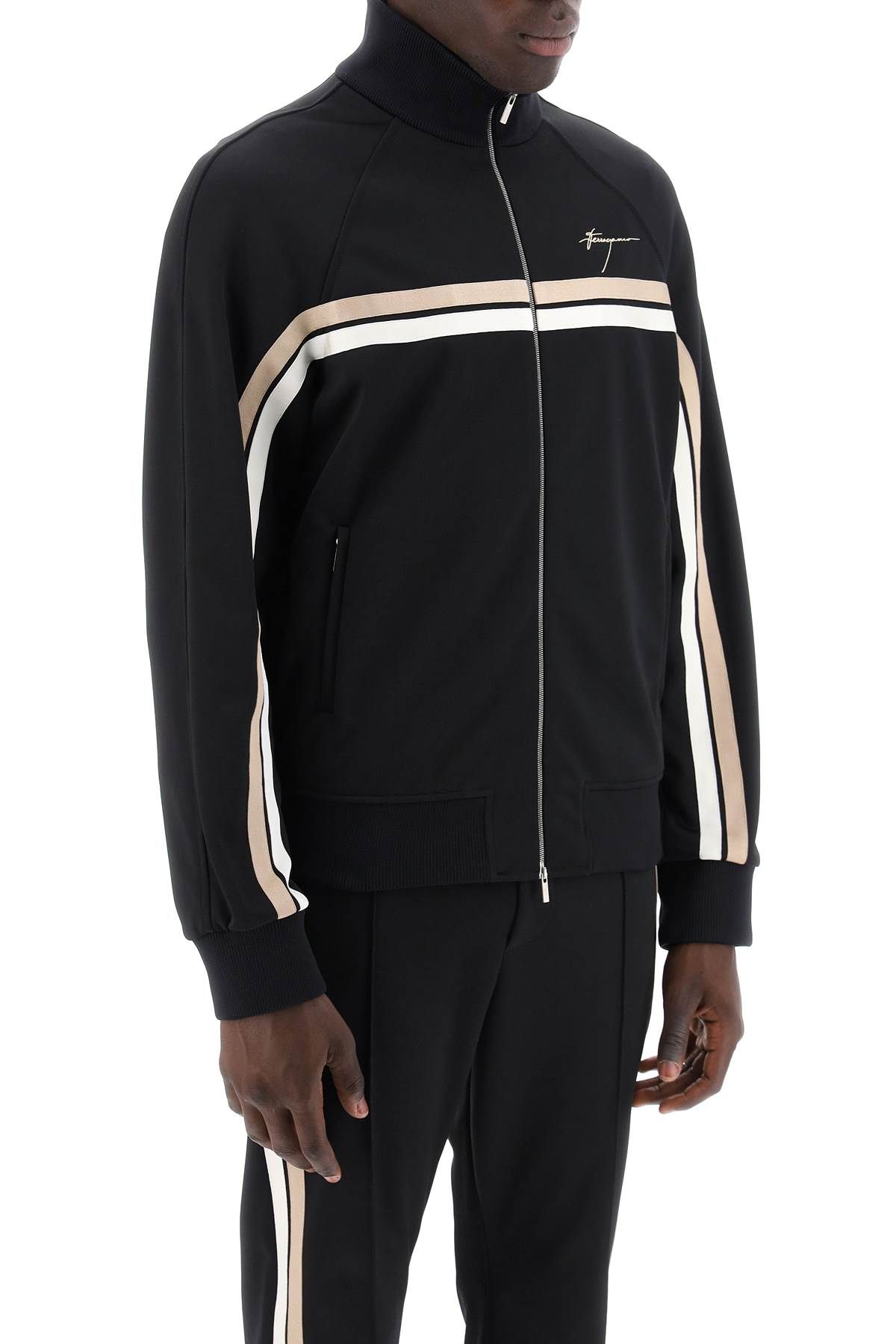 The FERRAGAMO track sweatshirt is made of stretch viscose jersey and decorated with two-tone bands on the chest and sleeves