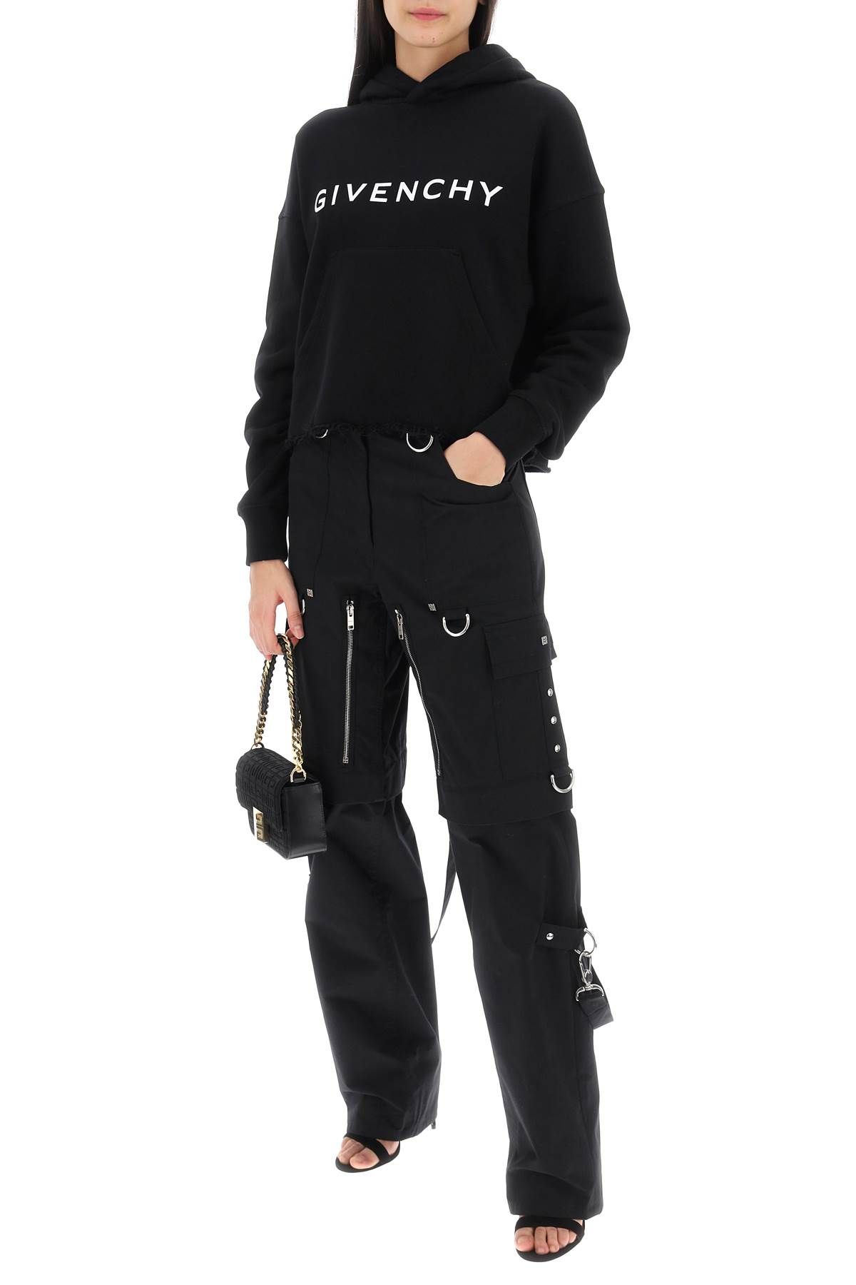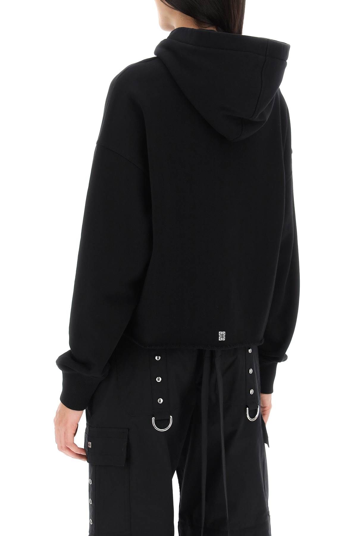 Cropped hoodie by Givenchy crafted in cotton french terry with contrasting logo lettering print on the chest. It features front kangaroo pocket, ribbed hem and cuffs and raw-cut hem. The style is complete with a small 4G print on the back. Loose fit with dropped shoulders. The model is 177 cm tall and wears size XS.