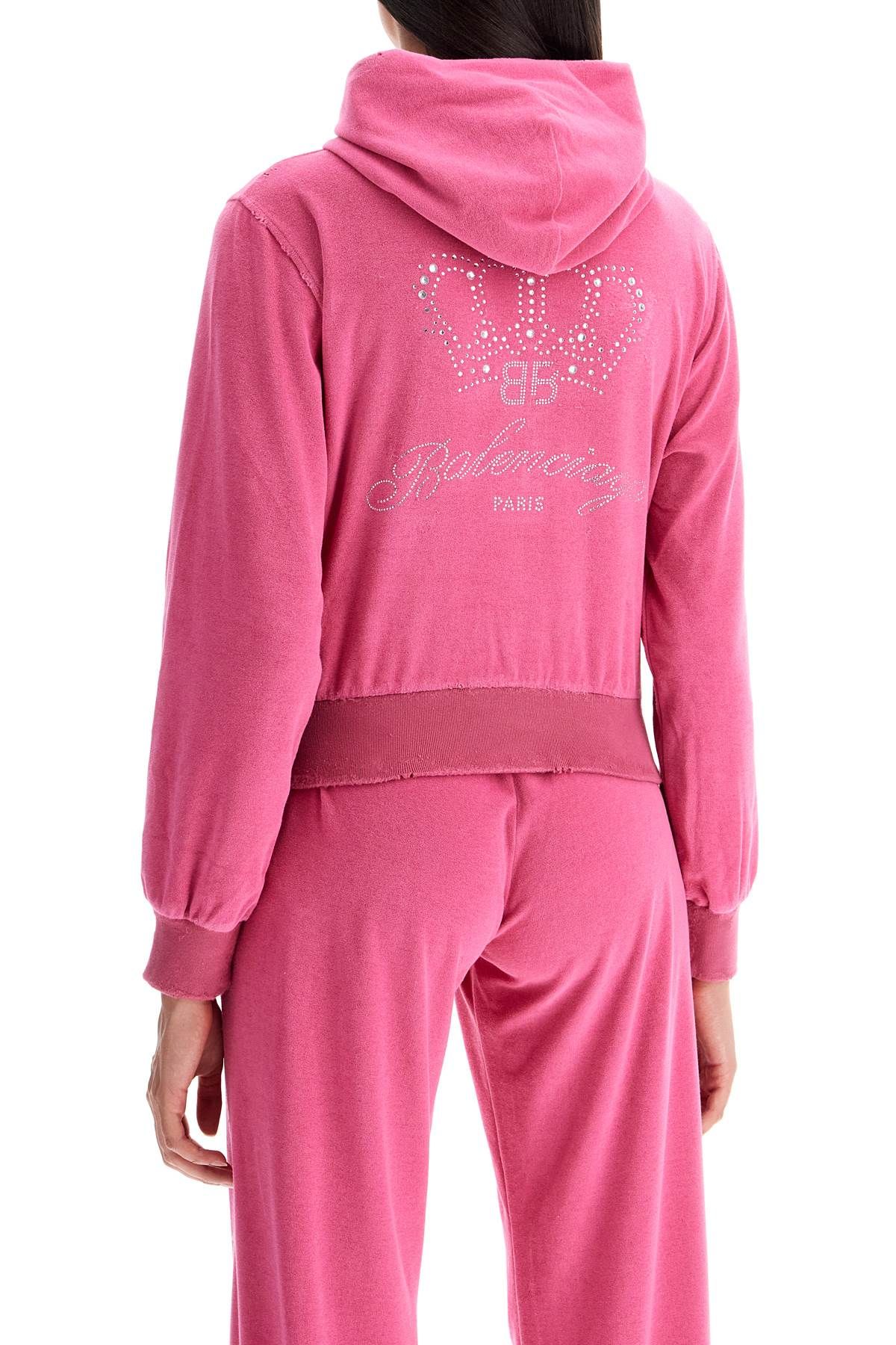 This Balenciaga hoodie is made of Active velvet with a used effect, embellished on the back with BB Motel crystal motif. It features a front zip closure, divided kangaroo pocket and micro ribbed finishes. Regular fit. The model is 177 cm tall and wears a size S.