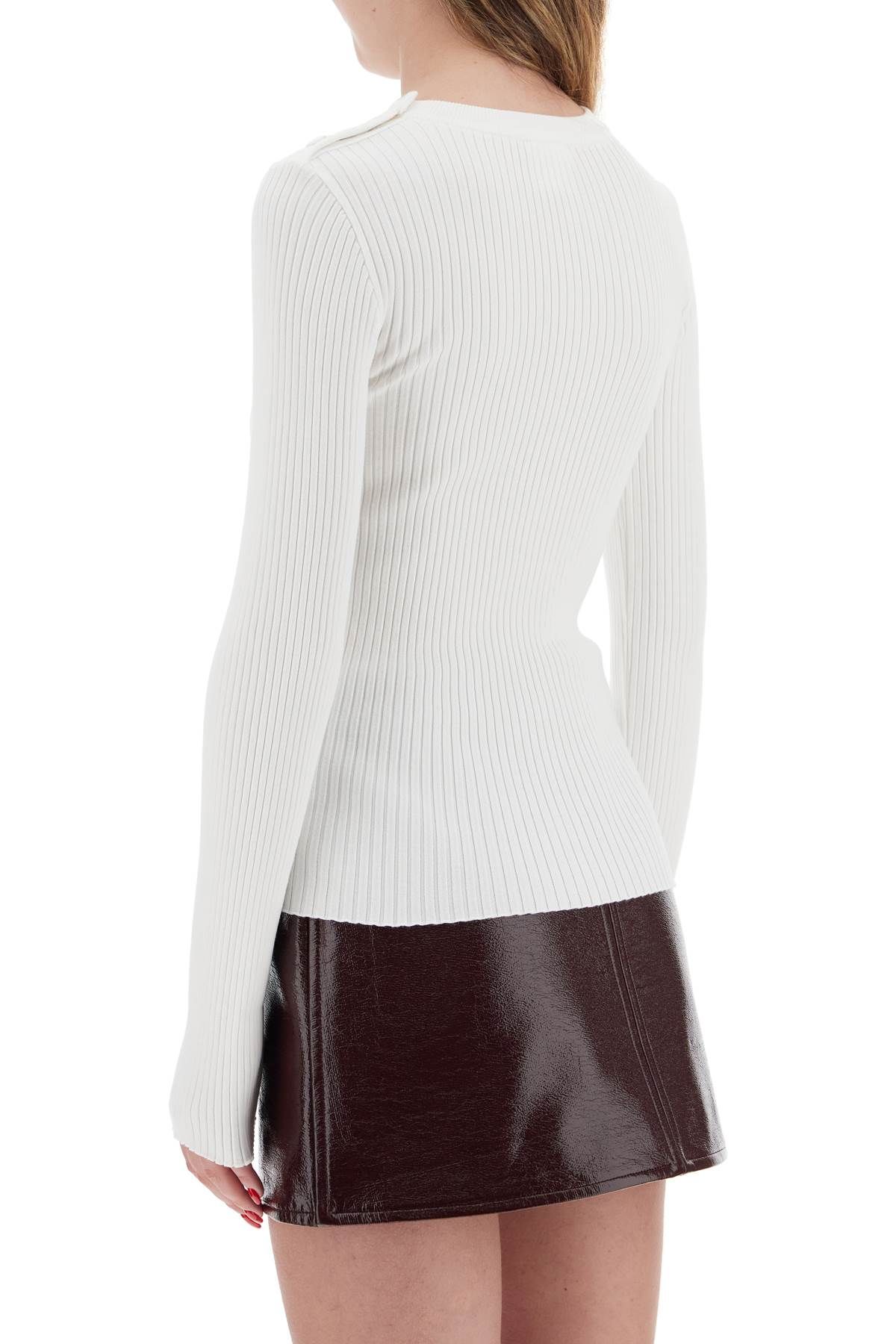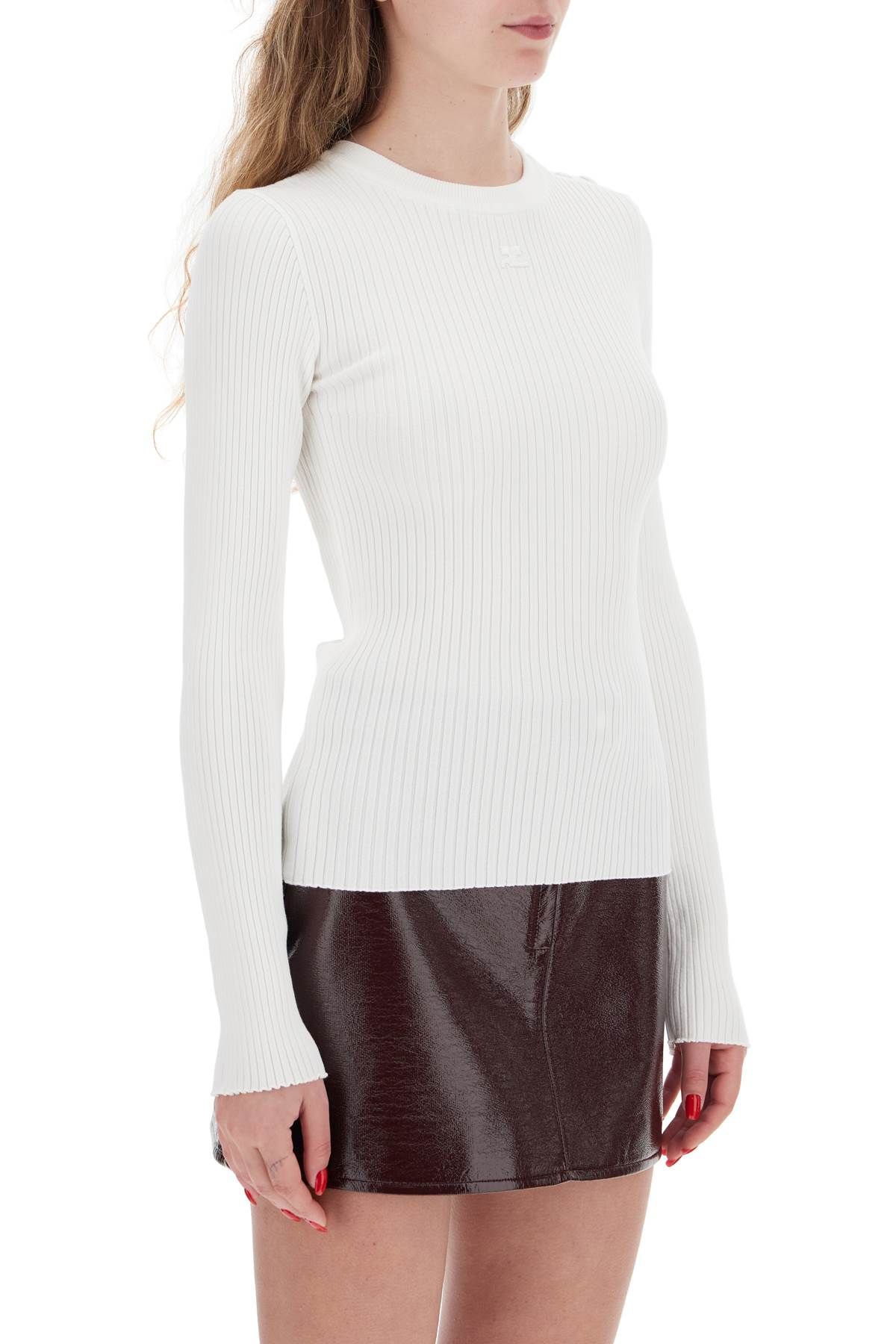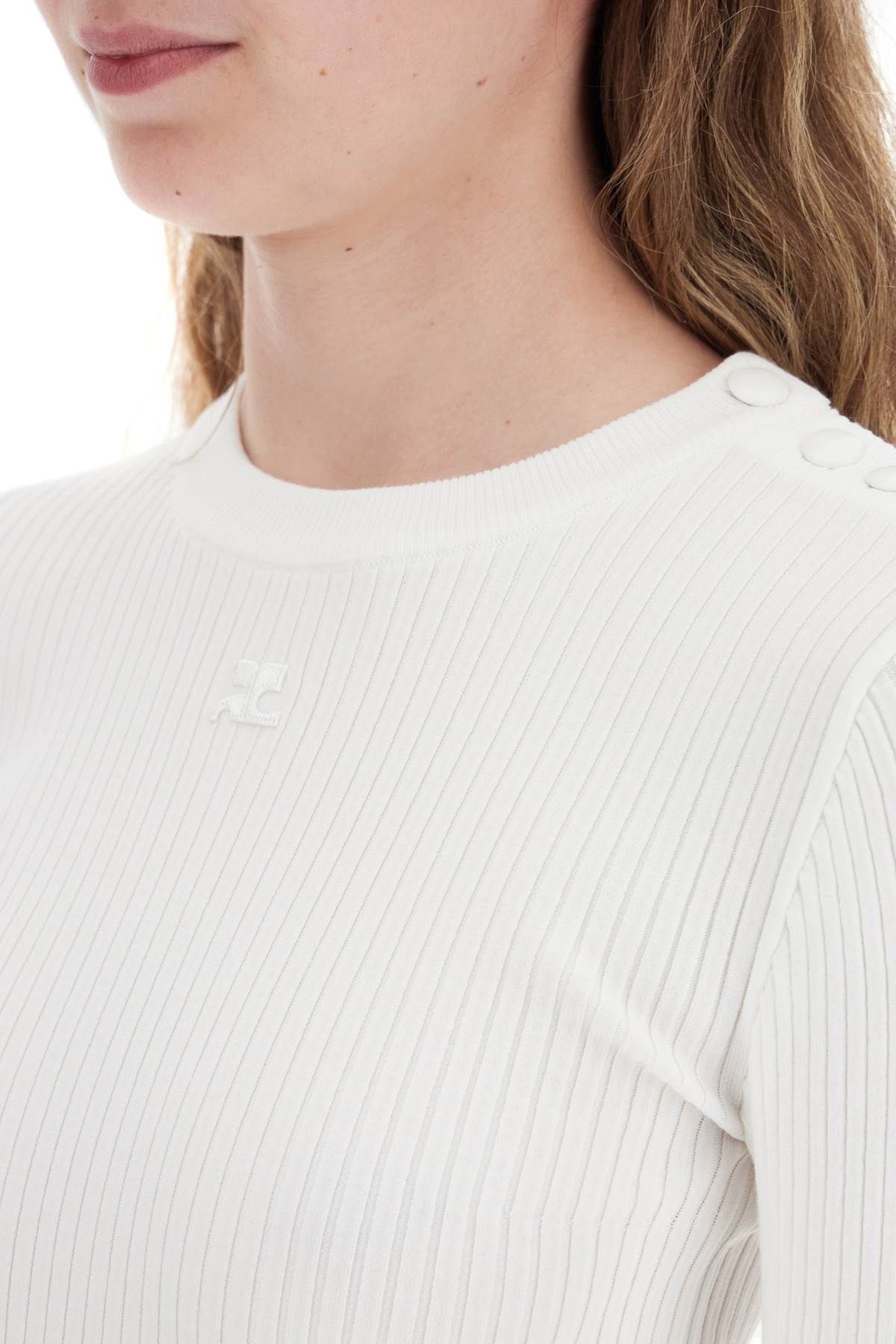 This Courreges long-sleeved pullover is made of ribbed stretch viscose blend and features a snap button opening on the right shoulder and a tonal logo patch applied under the crew neck. It has a slim fit and the model is 177 cm tall and wears size S.
