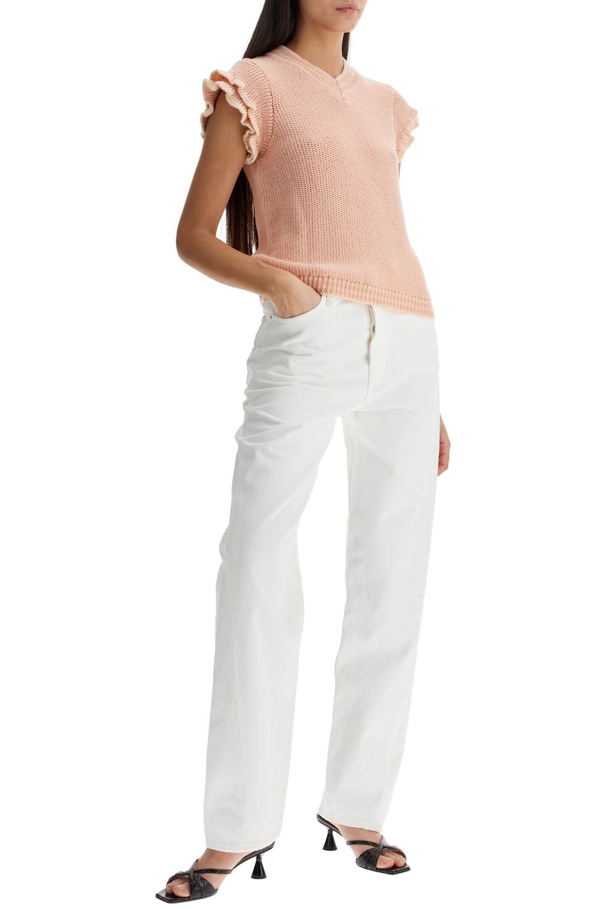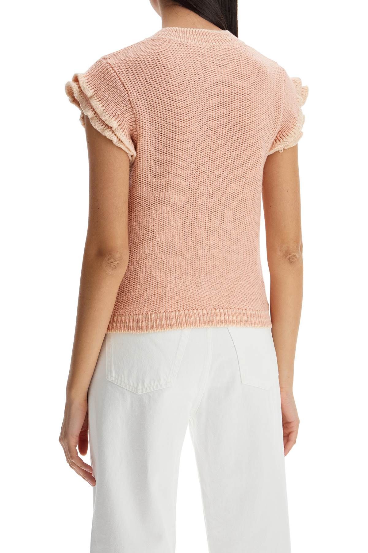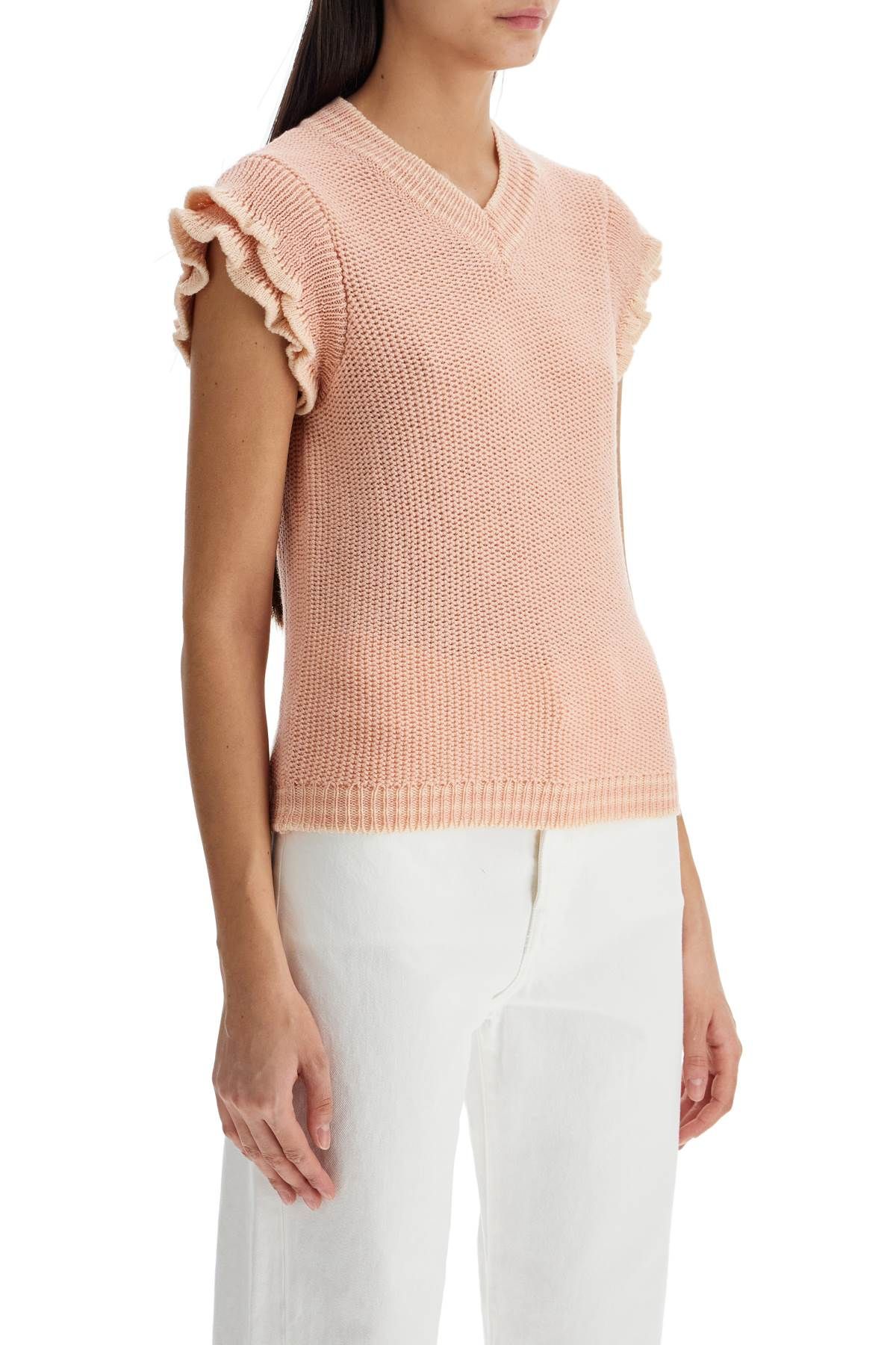 The ChloAⓒ vest is made of soft wool knit with a V-neckline and ruffled details, finished with ribbed edges and contrasting accents