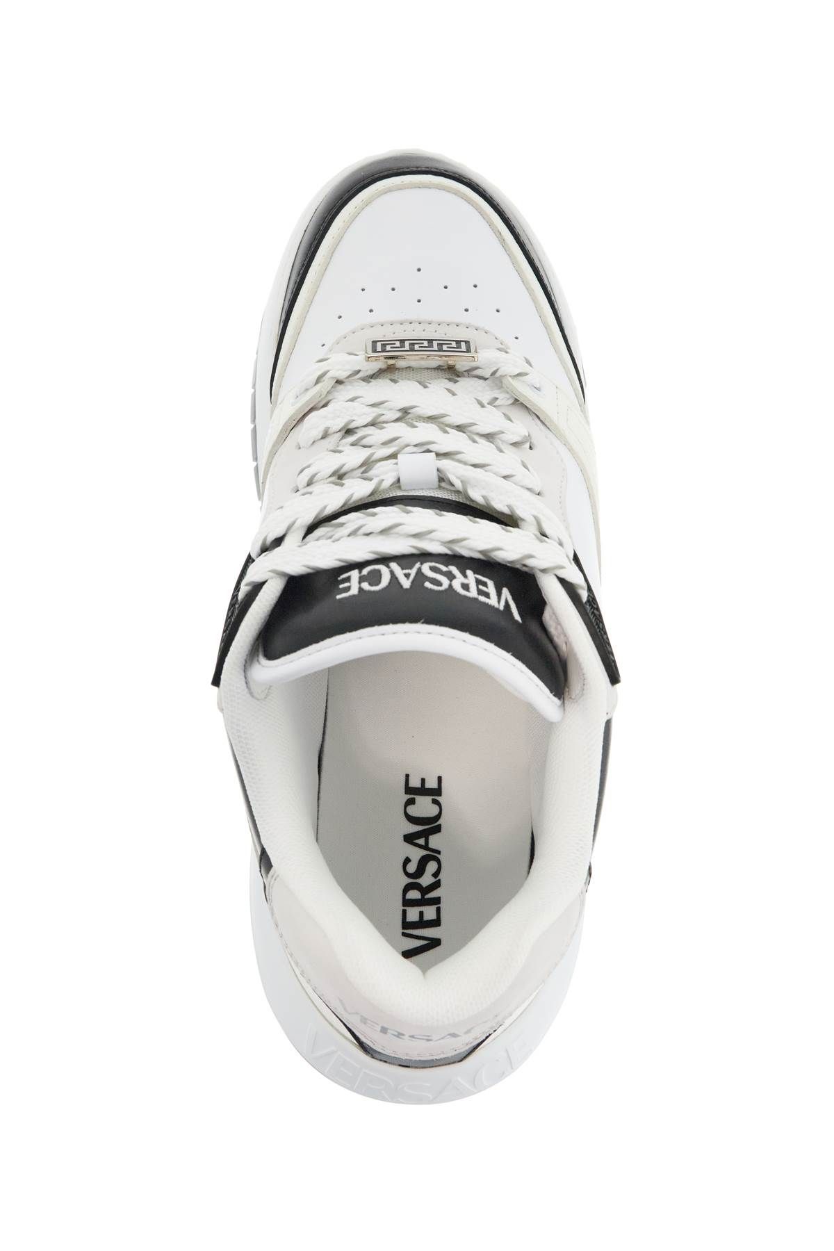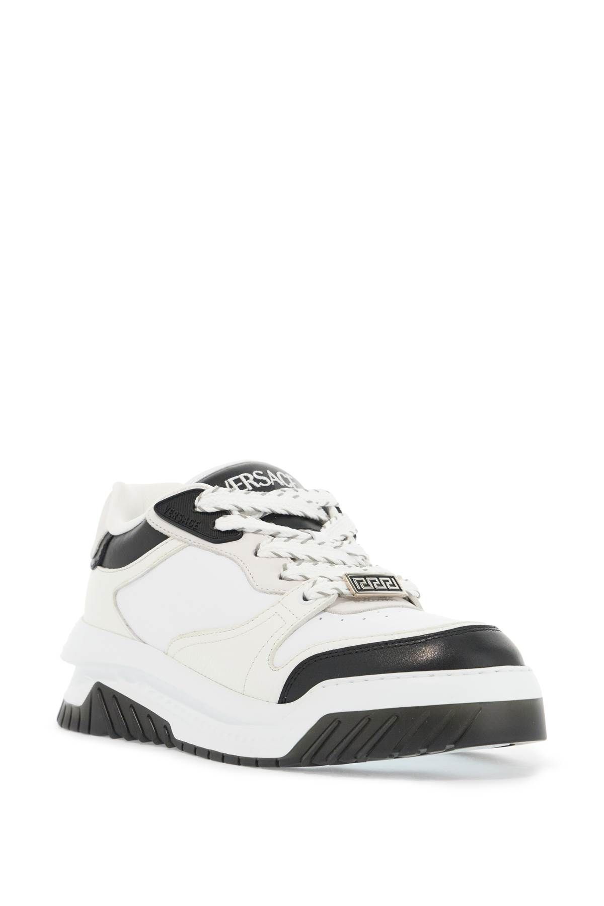 Versace's Odiessea sneakers feature a smooth leather upper with contrasting hammered leather inserts. They have a front lace-up closure with a metallic Greek detail, embroidered logo lettering on the tongue, and perforations on the toe. The spoiler is printed with lettering and the logo is embossed on the back. The interior is made of fabric and has a removable insole. The rubber sole provides traction. These sneakers come with extra laces for customization.