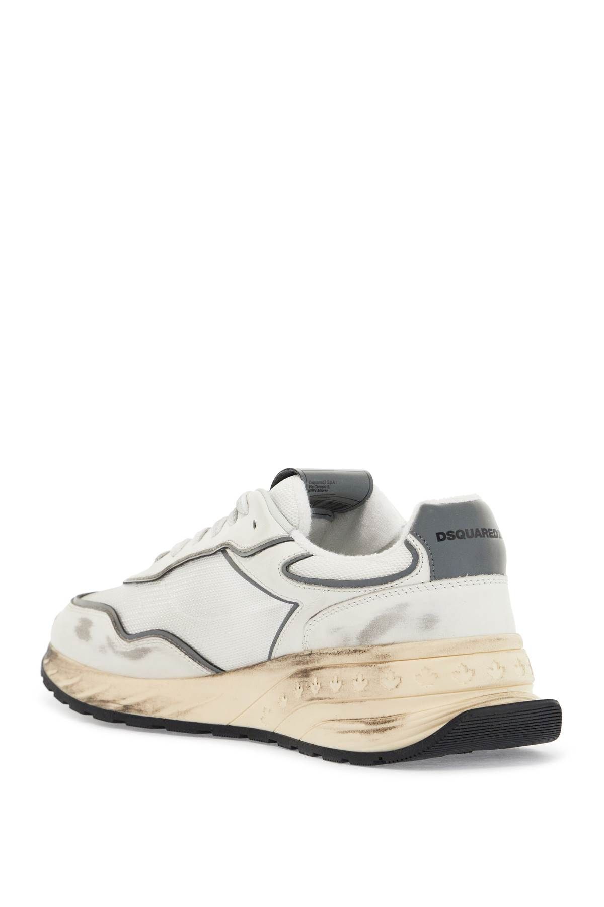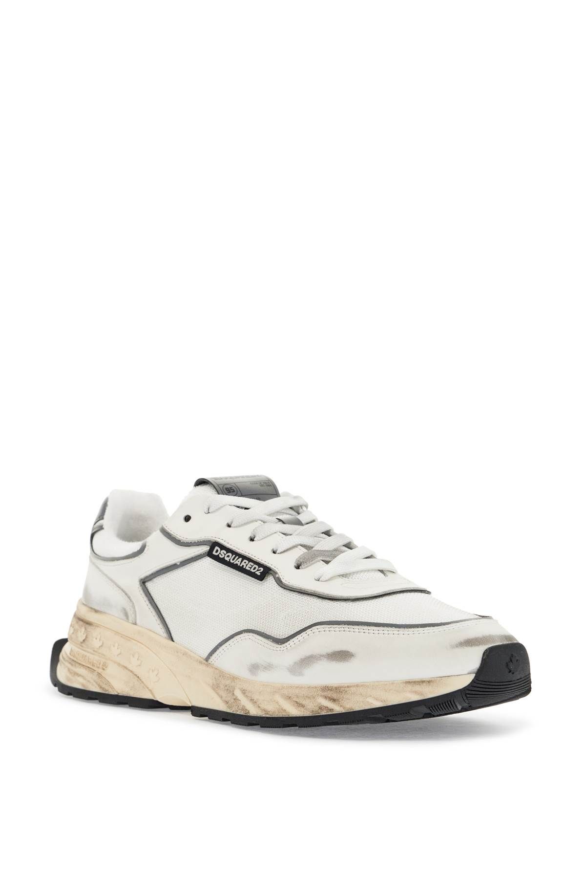 The DSQUARED2 Sprinter sneakers feature a mesh and smooth leather upper with reflective inserts for a vintage effect. They have a front lace-up closure, logo patch on the tongue, sponge lining with a removable leather insole, and a rubber sole.