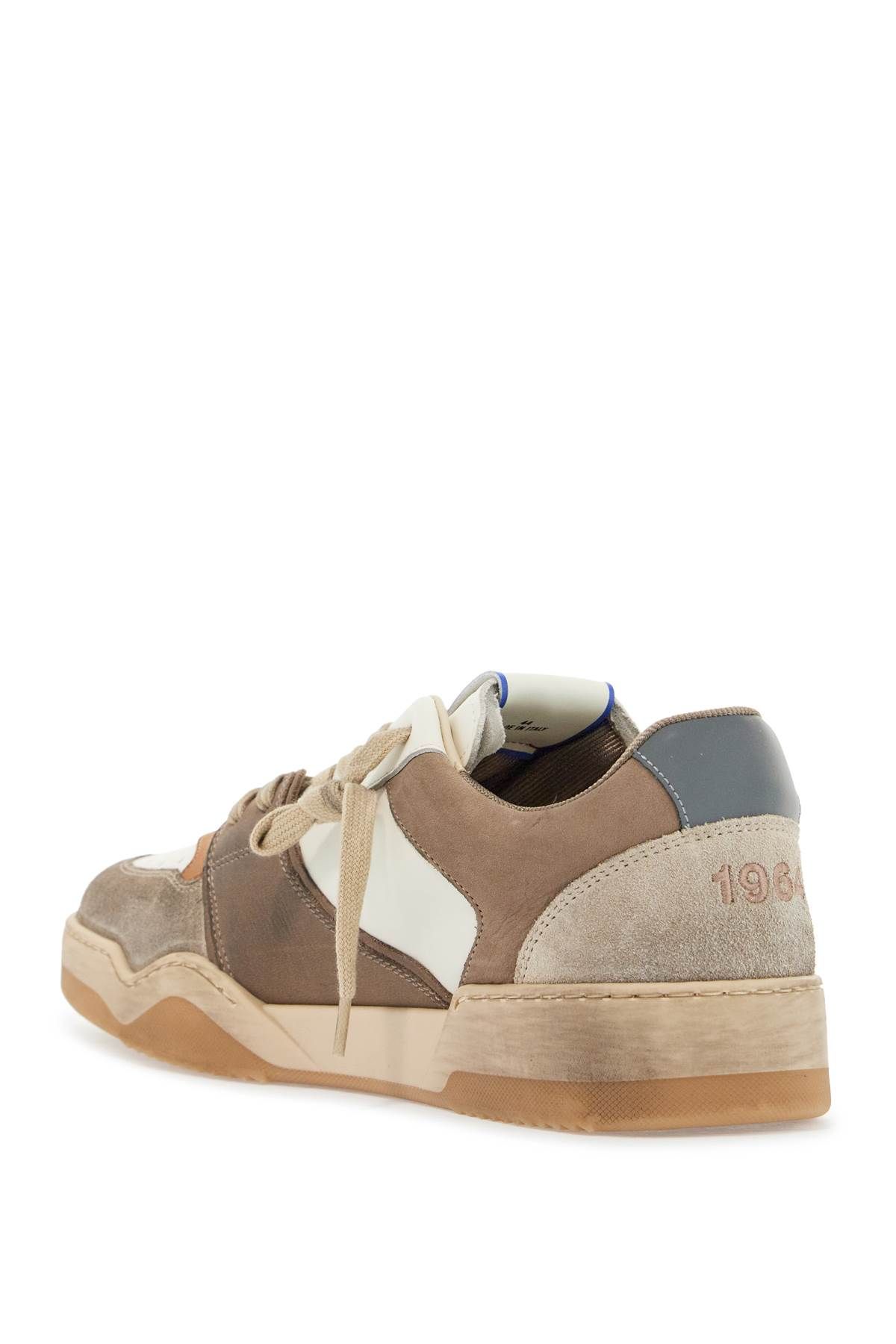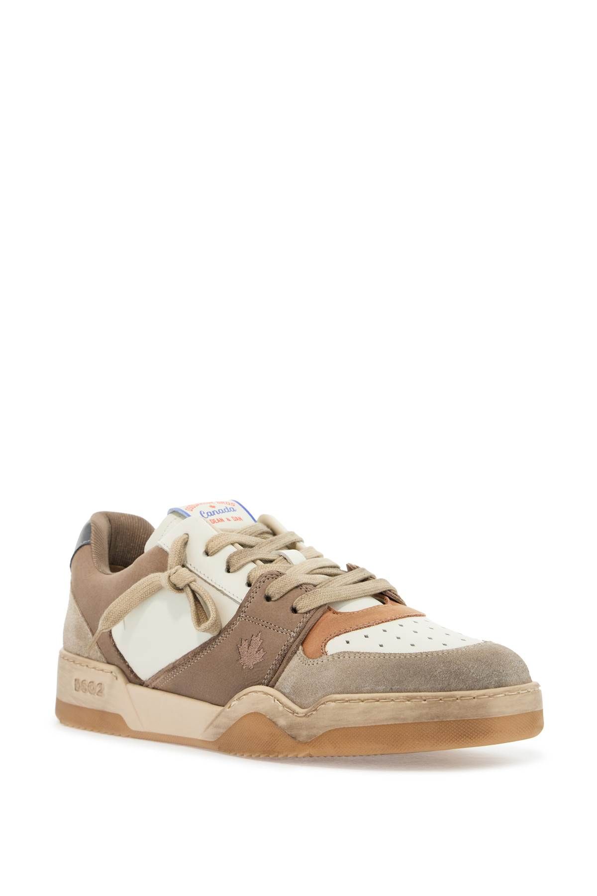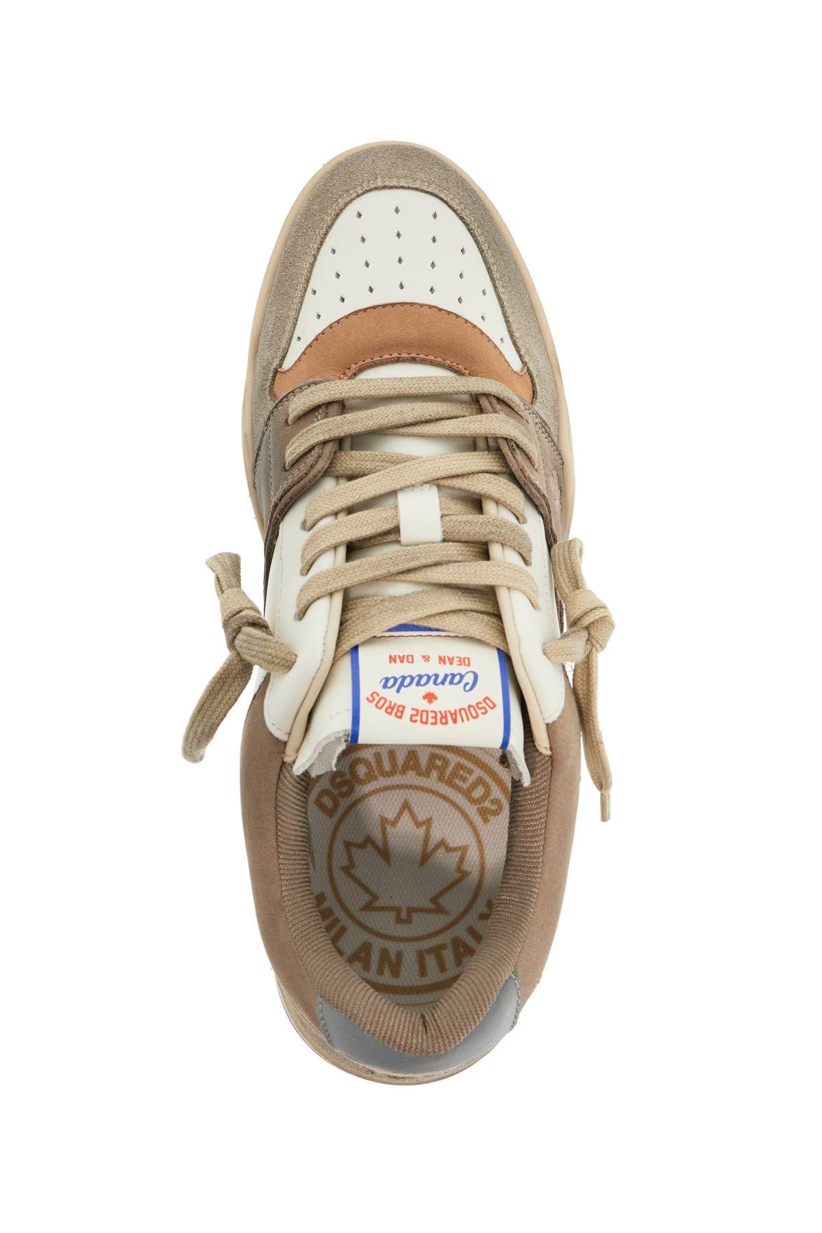 Spiker sneakers by Dsquared2 featuring colorblock upper with contrasting smooth, suede and nubuck leather inserts. Perforated toe, logo label on padded tongue, iconic side maple leaf embroidered, embroidered "1964" on heel. Fabric lining, removable insole, lived in-effect two-tone rubber sole with debossed logo on side.