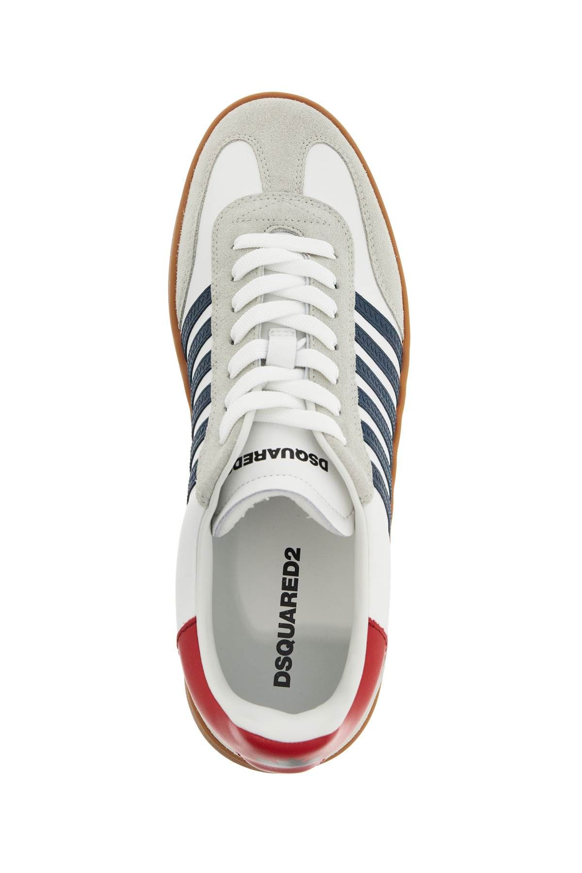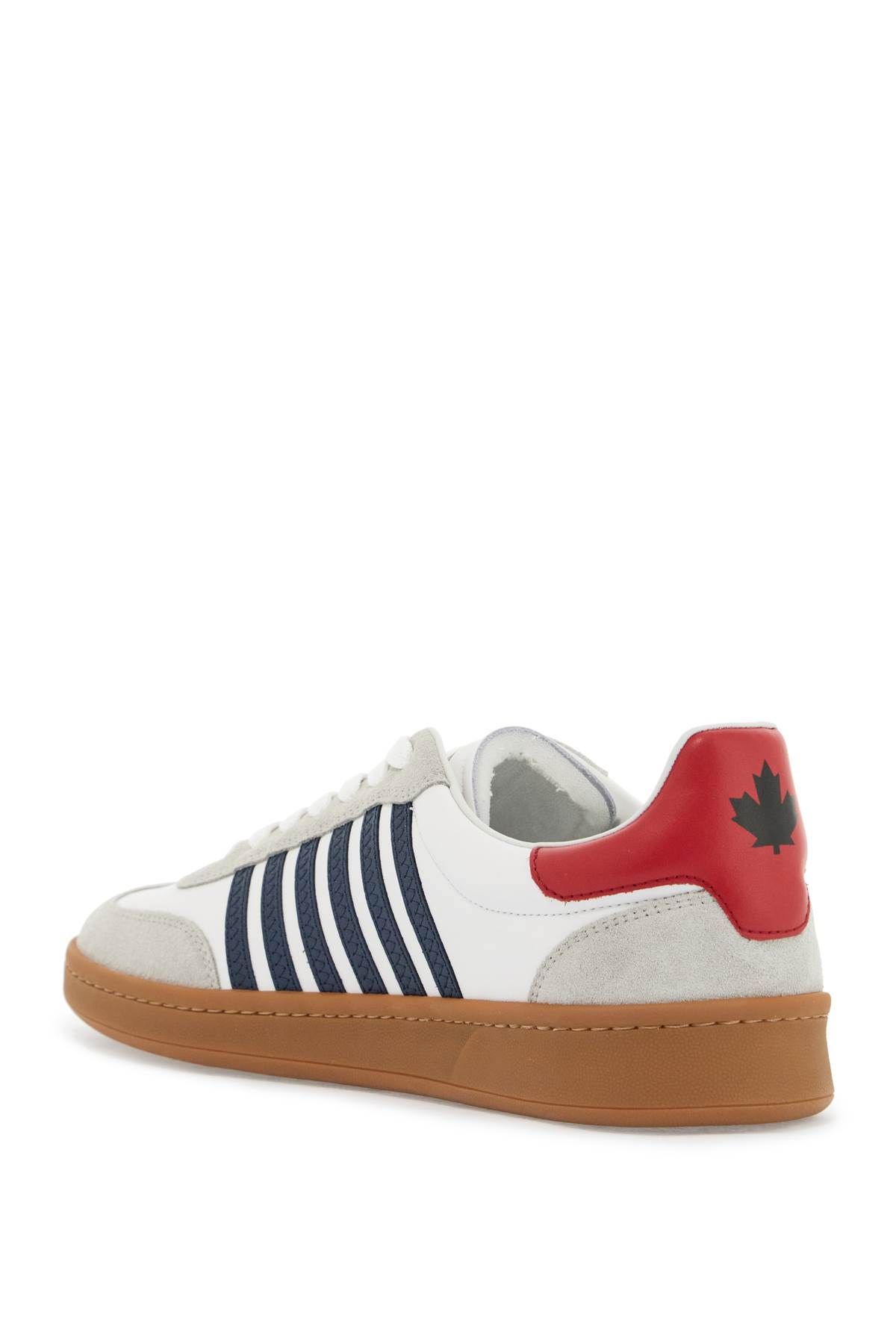 Boxer sneakers by DSquared2 made of smooth leather with suede details and characterized by contrasting stripes stitched to the sides. Canadian leaf printed on the contrasting heel tab, lettering logo print on tongue, name of one of the two designers embroidered on the outer side, terry-lined interior with removable leather insole. The thick midsole creates a platform look, while the rubber outsole features a slip-resistant tread.