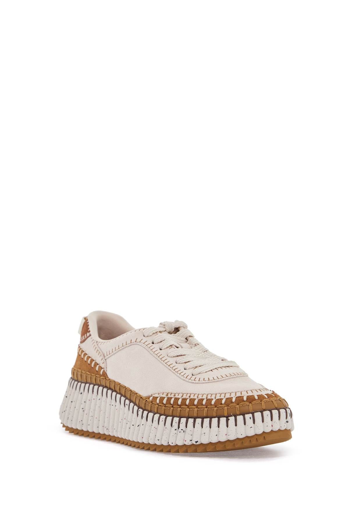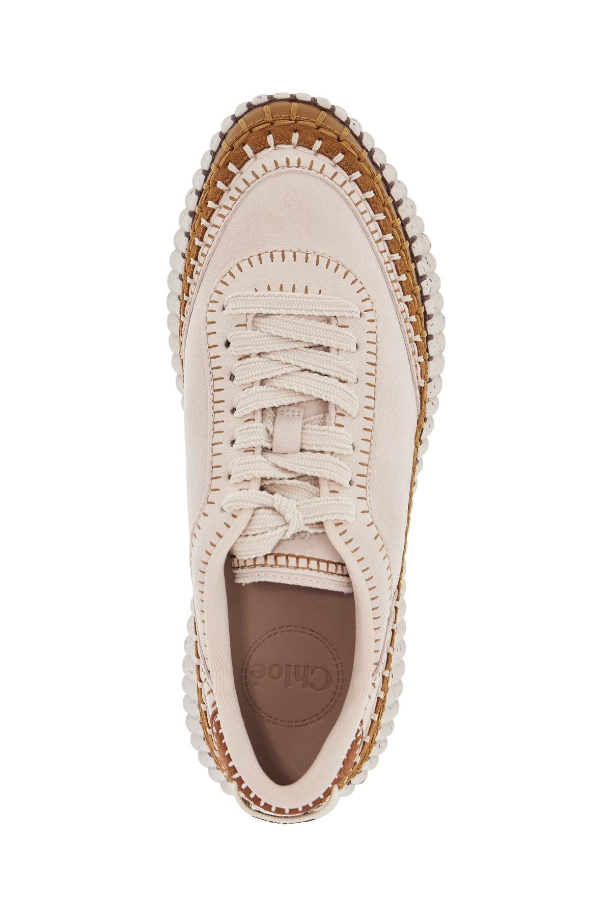 ChloAⓒ's Nama sneakers are made with a combination of suede leather and environmentally friendly materials. They feature a contrasting upper with maxi stitching and an embroidered logo on the tongue and back pull tab. The interior is lined with fabric, and the removable insole is made of leather. The platform sole is made of grooved rubber with a contrasting serrated tread pattern.