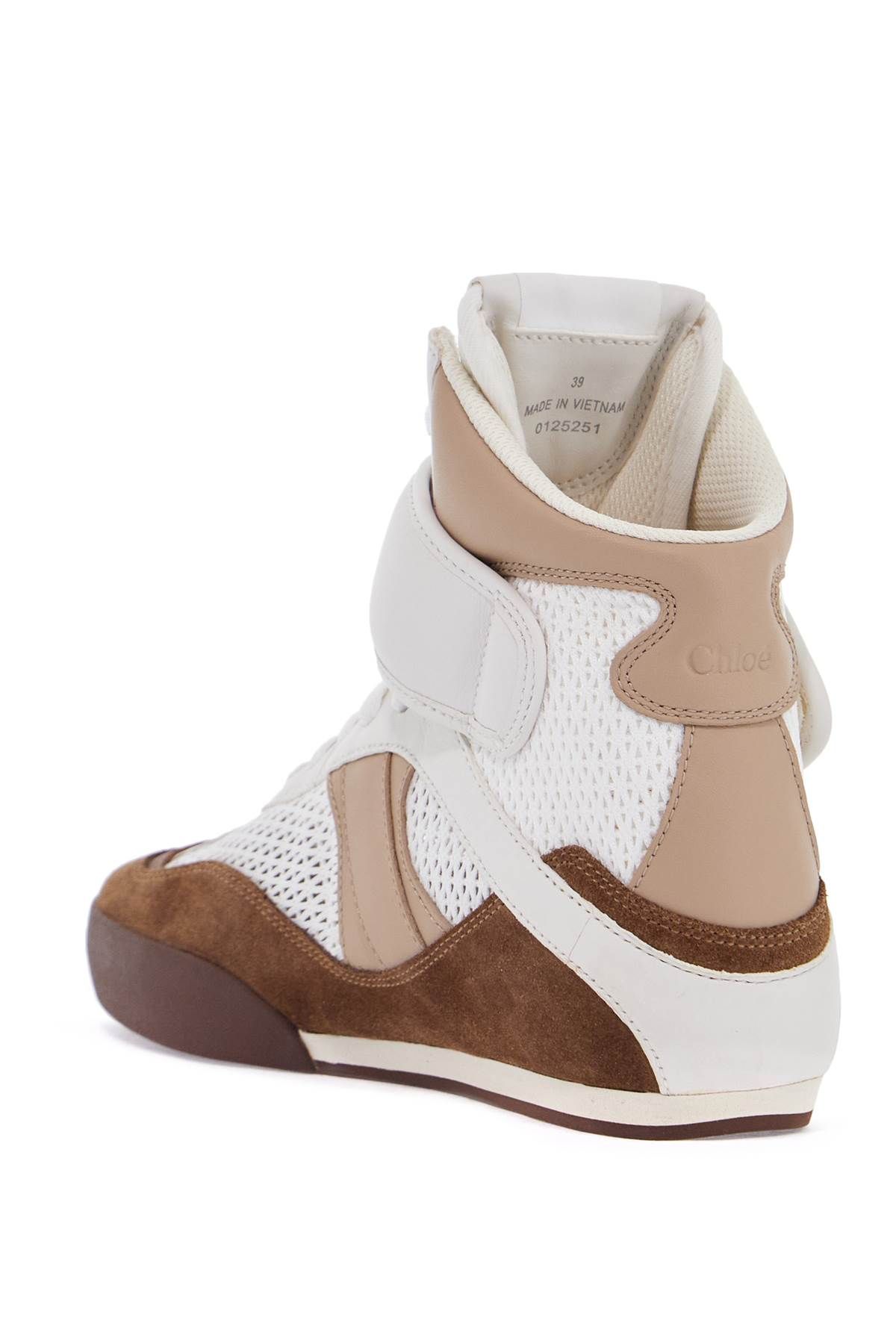 These high-top ChloAⓒ Kick sneakers, inspired by the world of classical dance and boxing, feature a color-block layered upper made of smooth leather, suede, and recycled mesh. They have a lace-up closure and a wide padded leather strap with a velcro fastening. The tongue features a logo patch, while the side and spoiler display an embossed logo. The partially lined interior has a removable wedge insole for added height and support. The rubber sole completes the design.