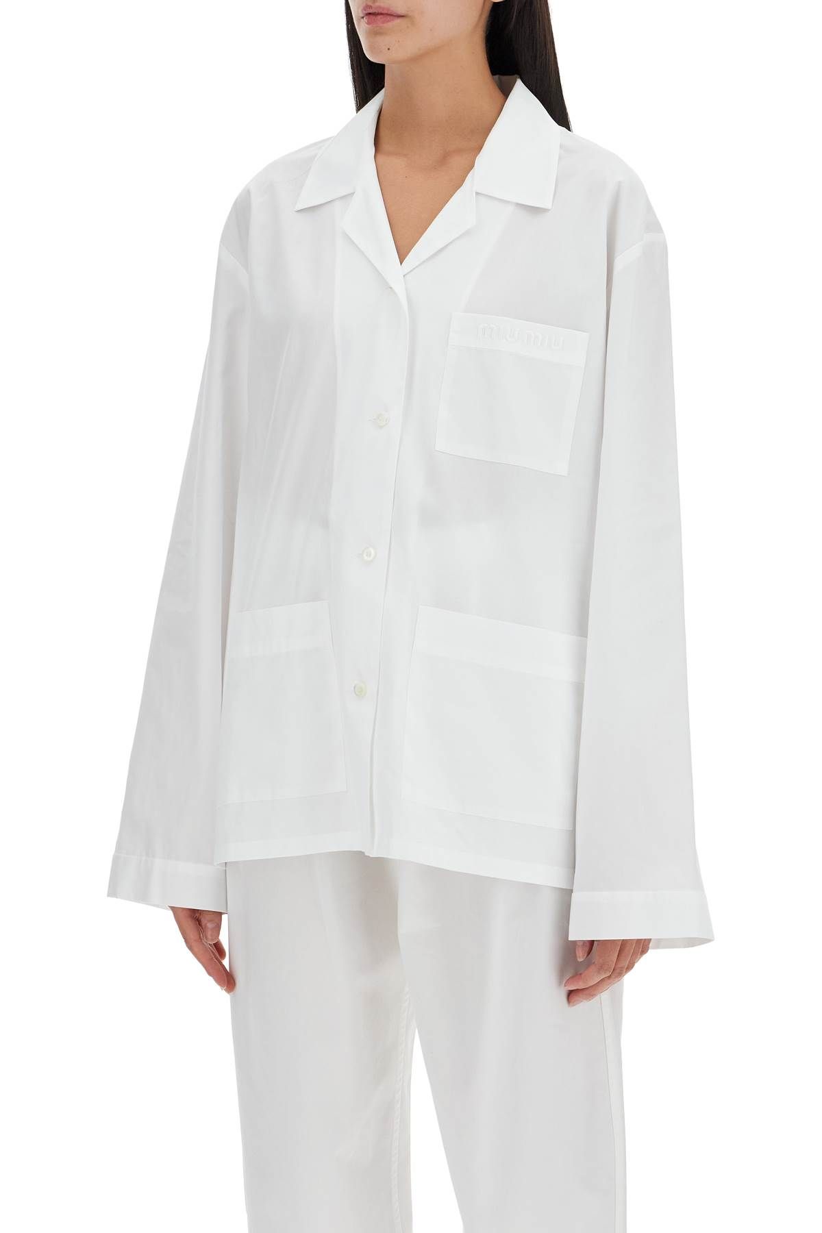 This Miu Miu oversized poplin cotton shirt features wide long sleeves. With a pajama-style design, it has a mother-of-pearl button closure, an open collar, and three patch pockets with embroidered logo detail on the chest. The model is 177 cm tall and wears size IT 40.
