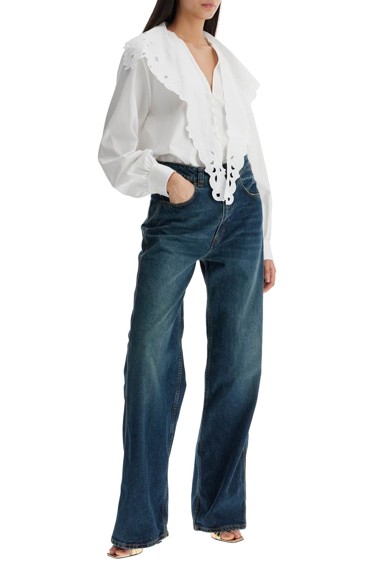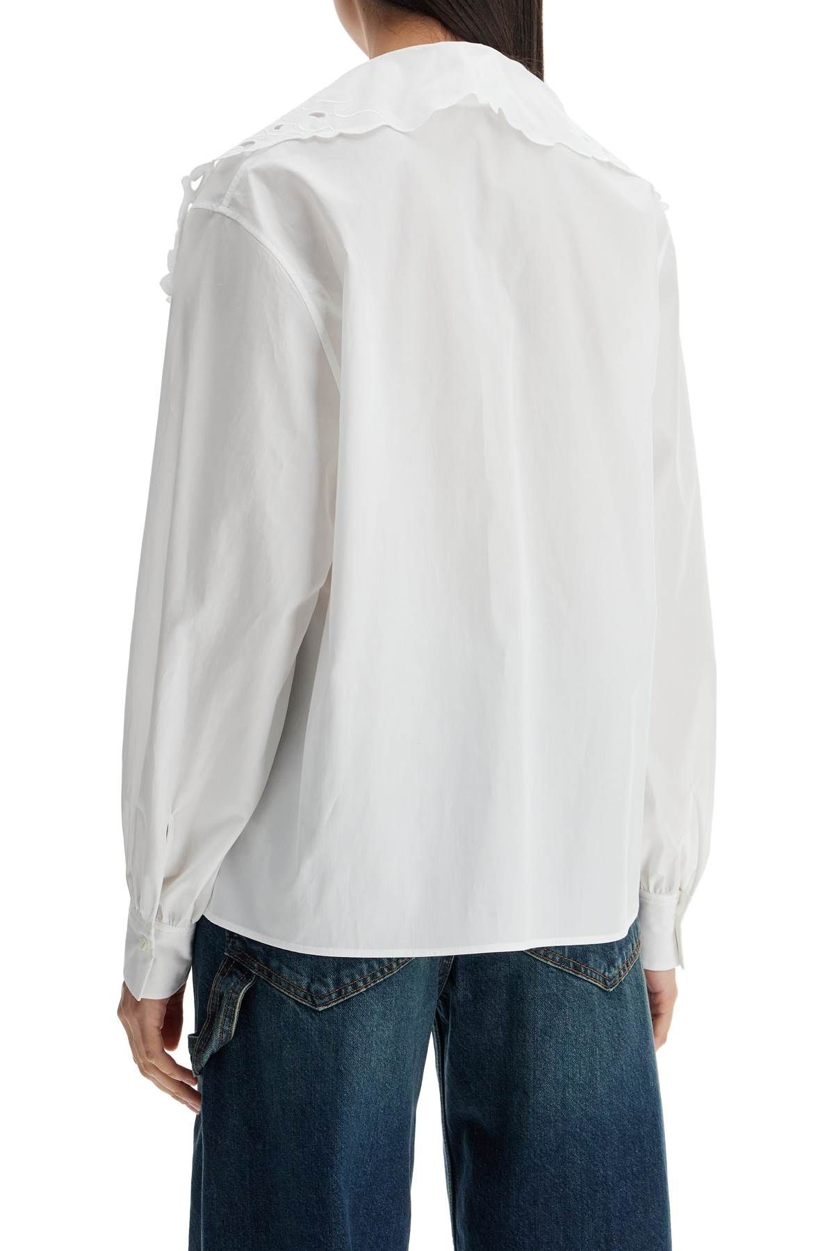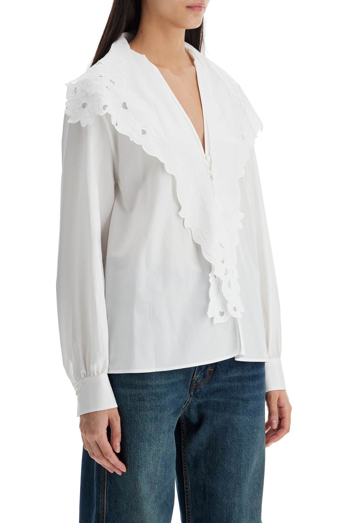 This long-sleeved ChloAⓒ shirt is made of pure cotton poplin, decorated with an embroidered lavalliA¨re collar and complete with delicate mother-of-pearl buttons. It features a V-neckline, single button cuffs, and a relaxed fit. The model is 177 cm tall and wears a size FR 36.