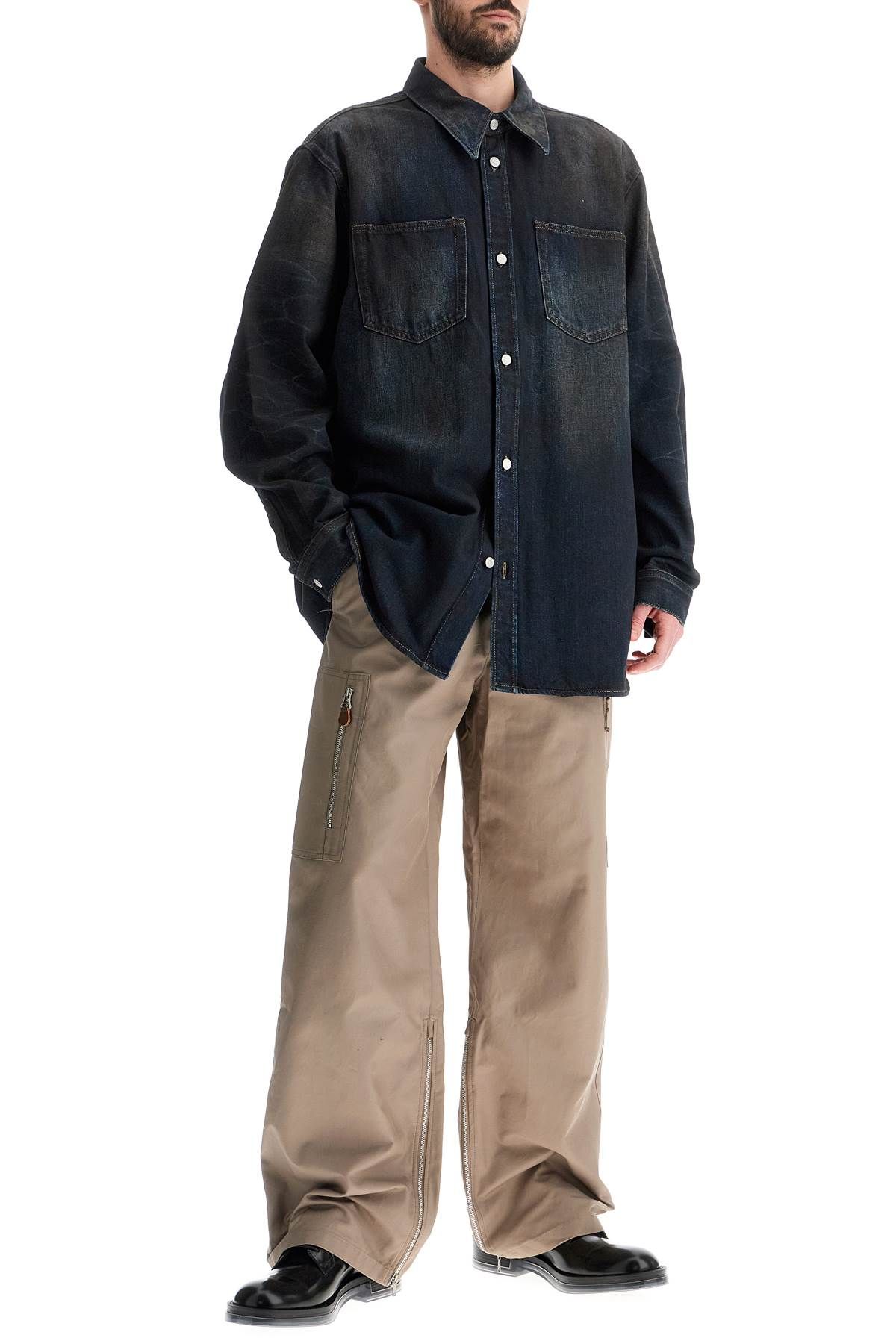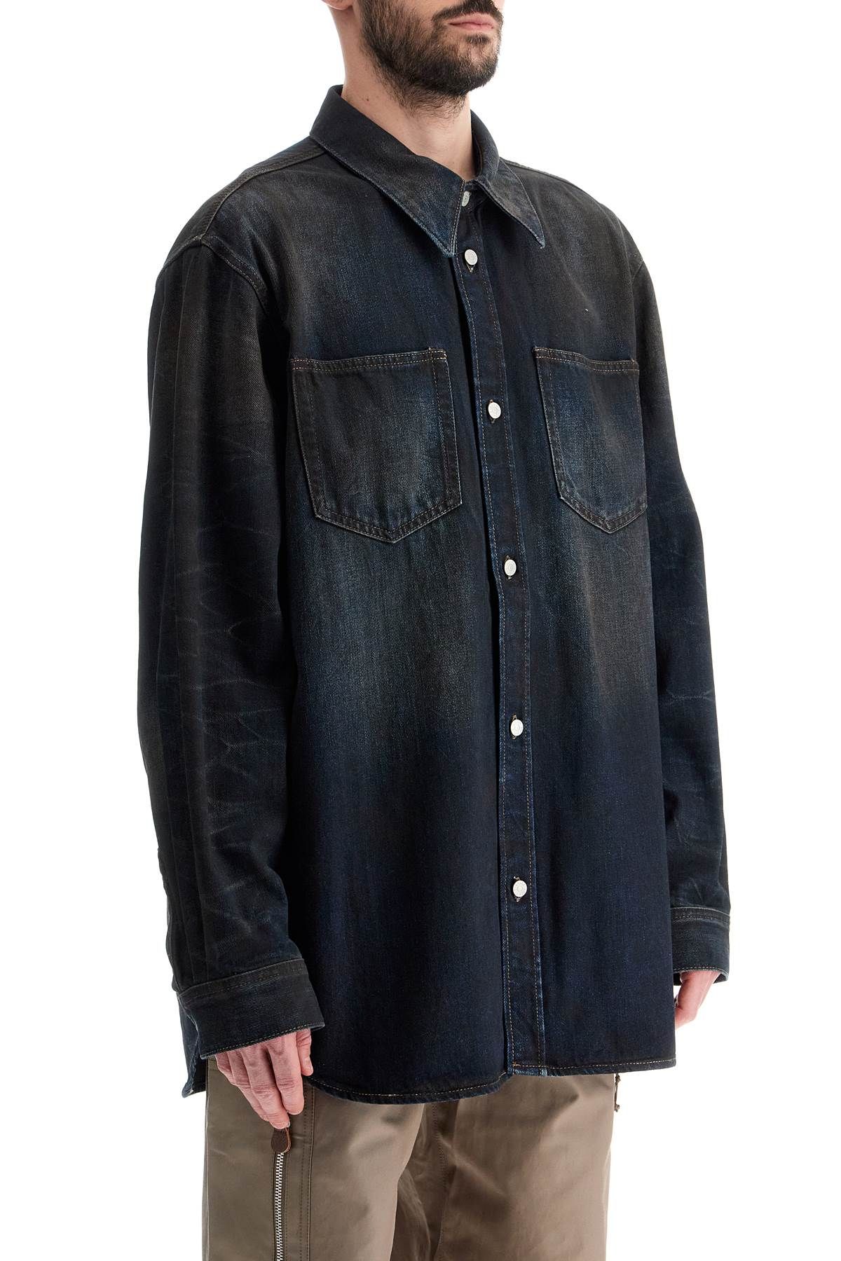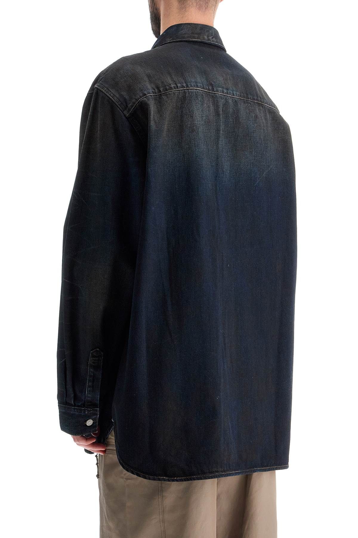 Unisex denim shirt from Acne Studios featuring a distressed wash for a unique look. It has a classic design with a collar and branded buttons, two patch pockets on the chest, and buttoned cuffs. The fit is relaxed. The model is 187 cm tall and wears size L.