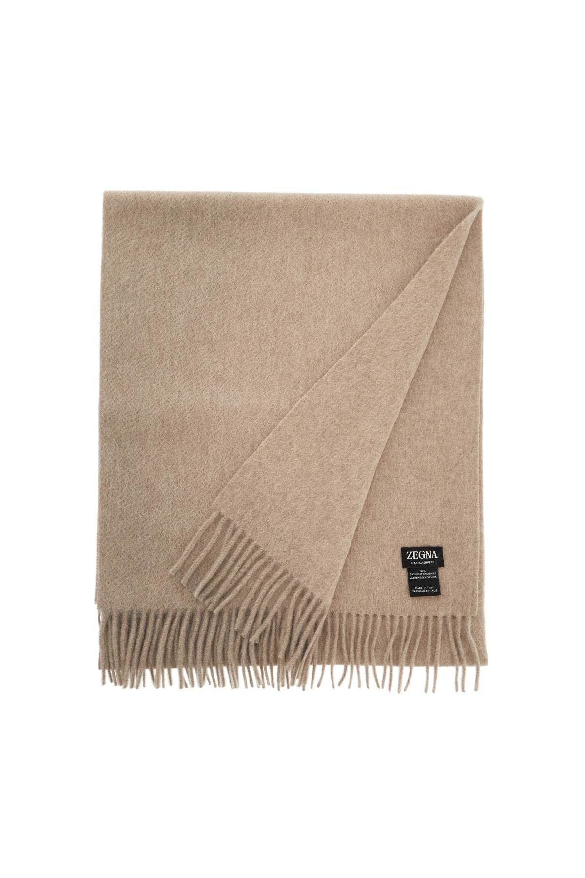Zegna scarf made of Oasis cashmere, embellished with the Zegna 232 Road Brand Mark in tone-on-tone leather and decorated with fringe ends