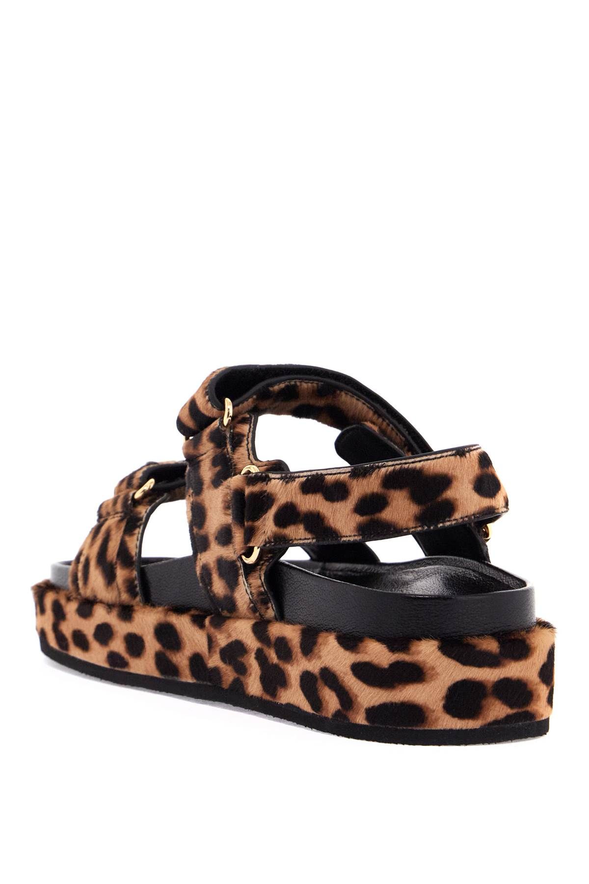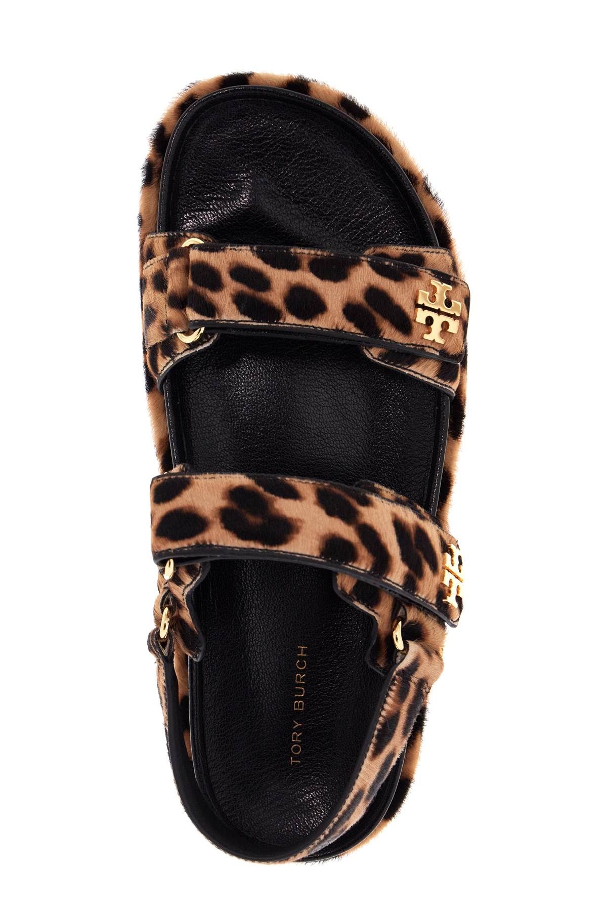 The Kira sport sandals by Tory Burch are made of animal print pony hair with adjustable straps and velcro closure, embellished with the iconic double T monogram. The leather insole features a gold lettering logo, while the sole is made of rubber for added comfort and durability.