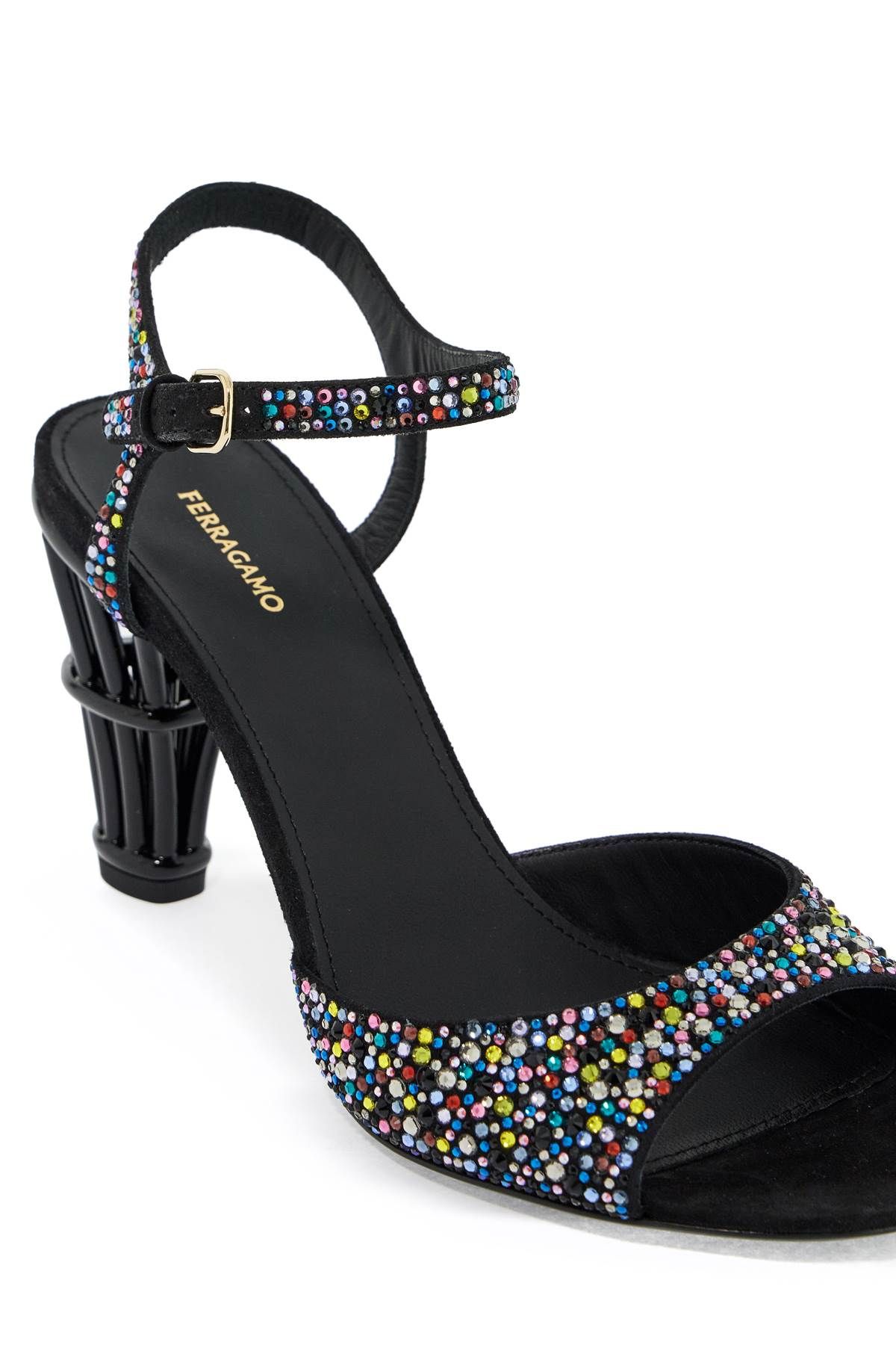 FERRAGAMo sandals made of suede leather and embellished with multicolored crystals all-over. Adjustable ankle strap, almond toe, leather insole and characteristic curved cage heel with glossy finish. Fit: C.