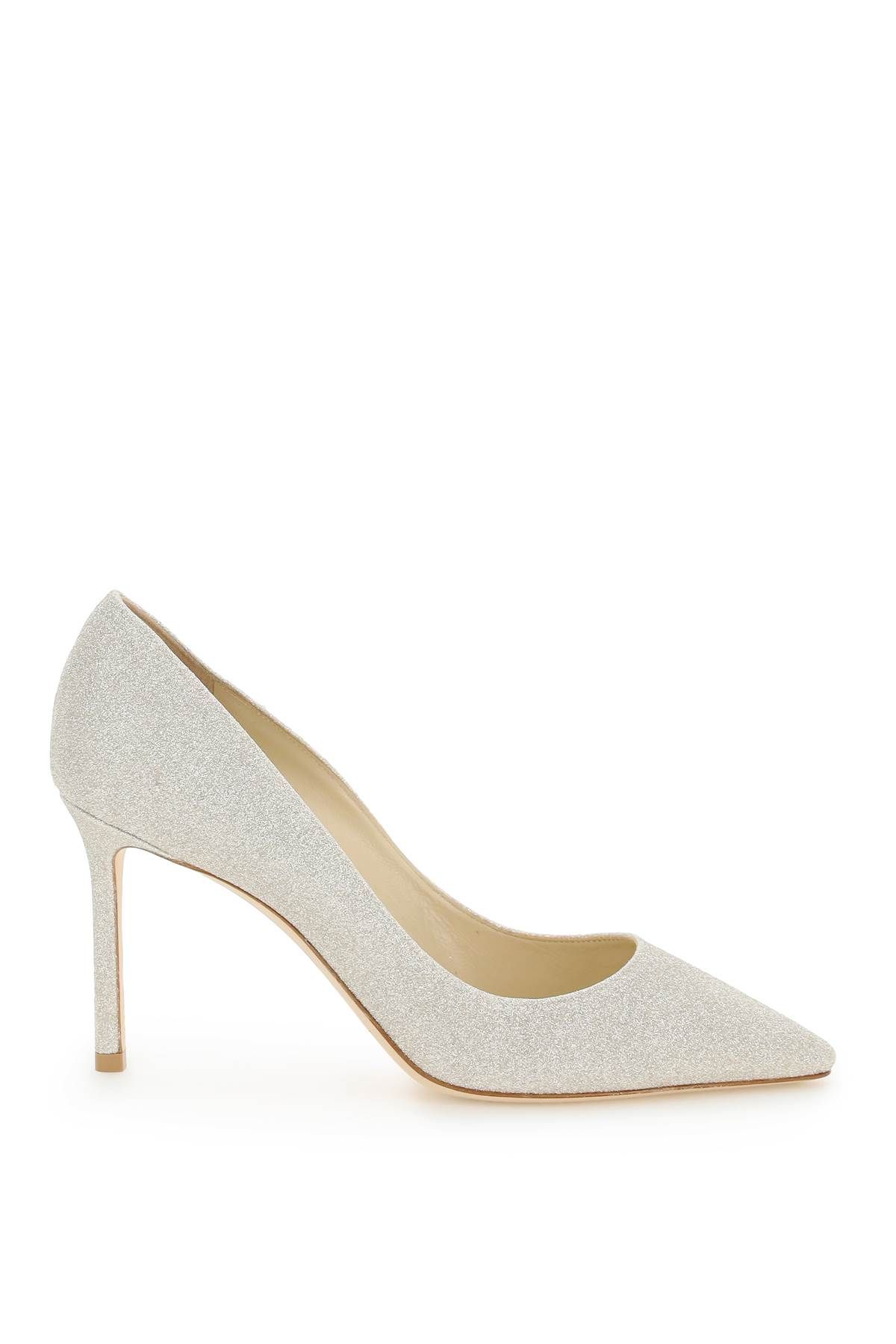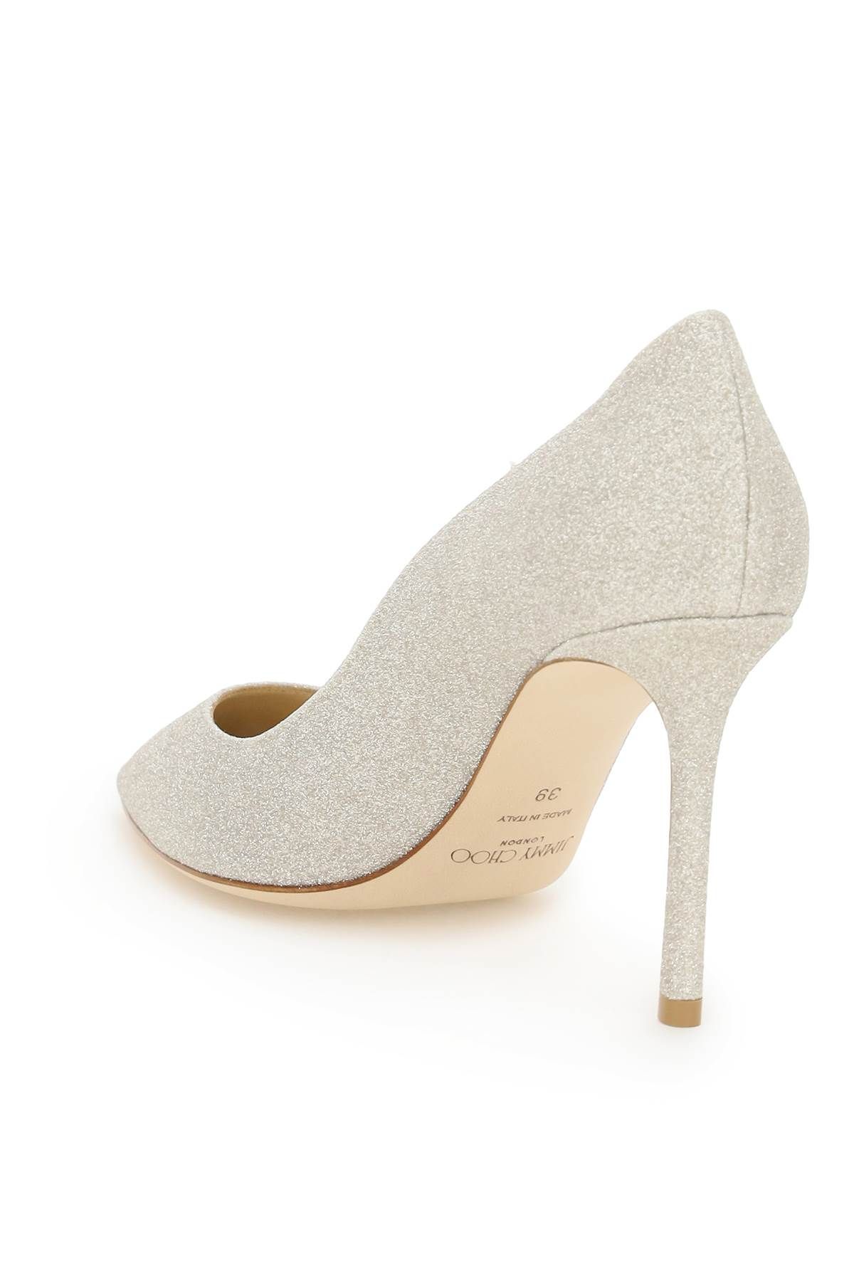 Romy 85 pumps by Jimmy Choo characterized by the upper covered by dusty glitter