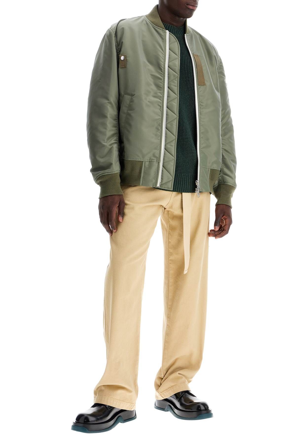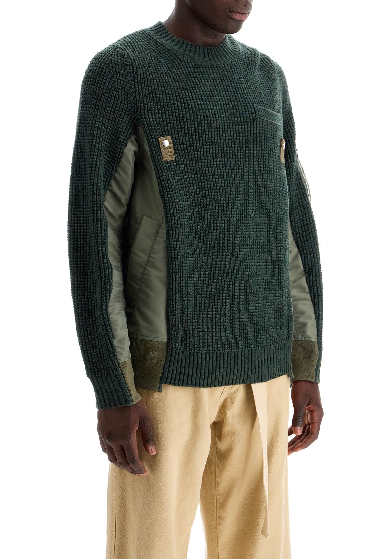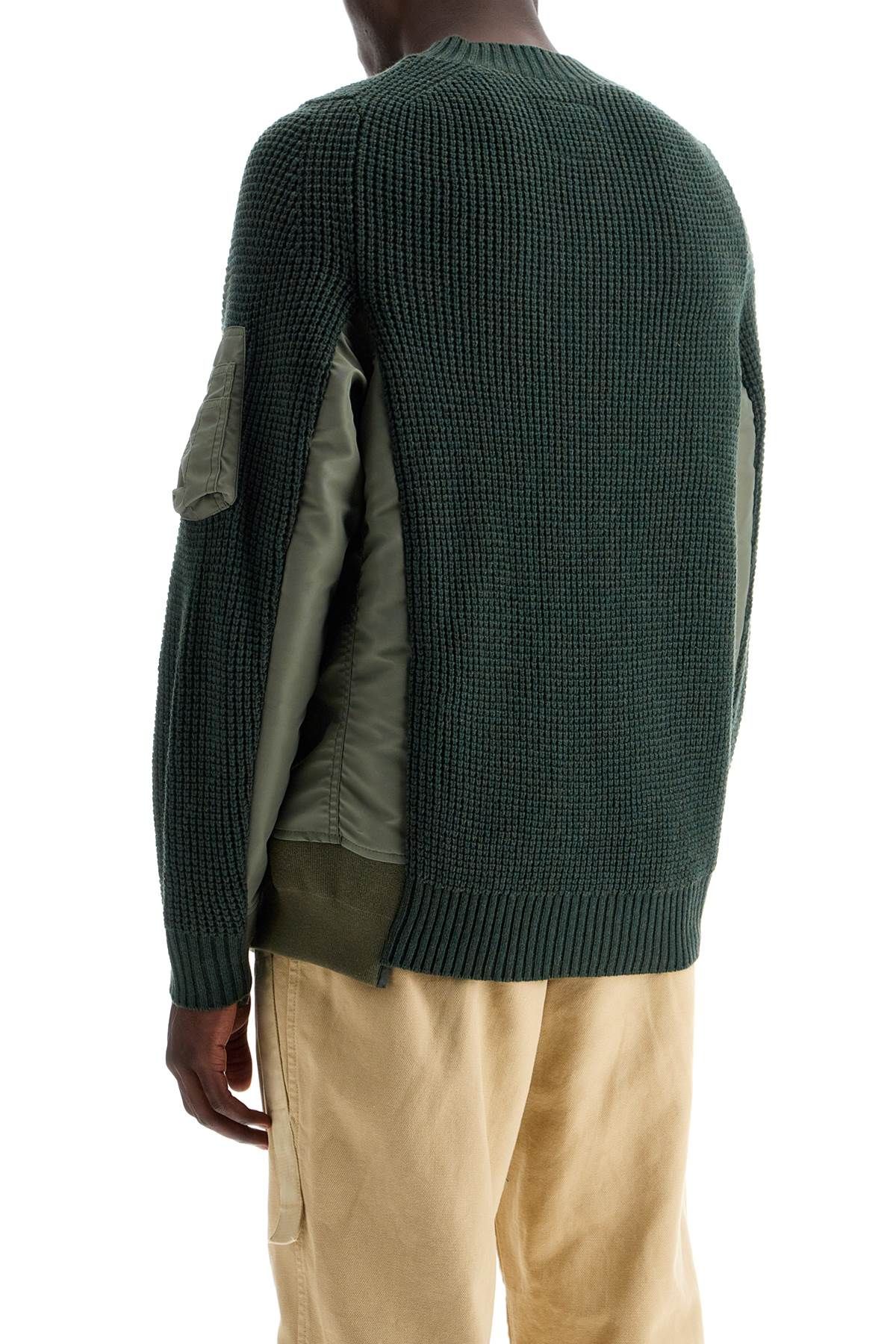 The Sacai crew neck pullover is made with a layered construction, crafted from pure wool knit with contrasting nylon lining and complete with patch pockets. It features a chest pocket, flat ribbed edges, and a utility pocket on the left sleeve. The model is 177 cm tall and wears size 3 Sacai.