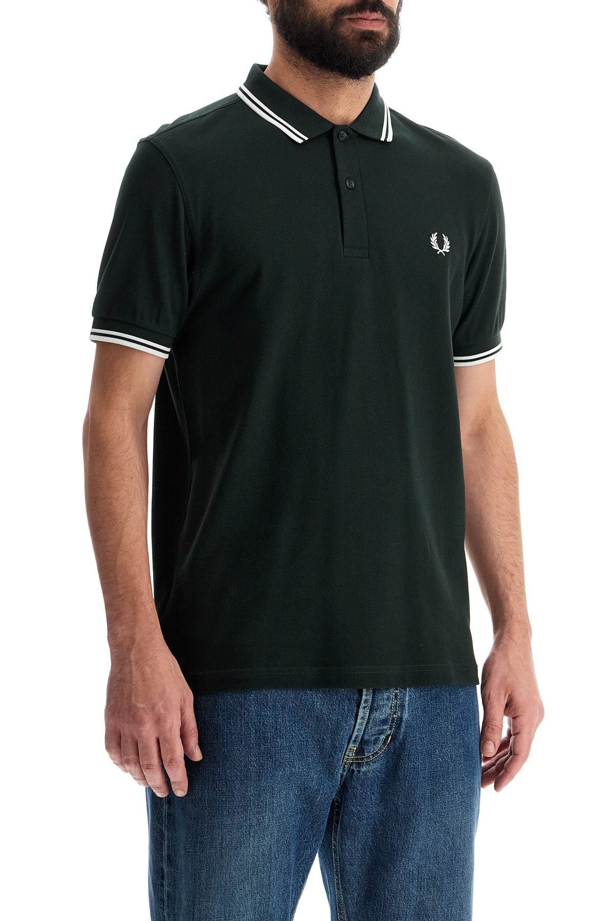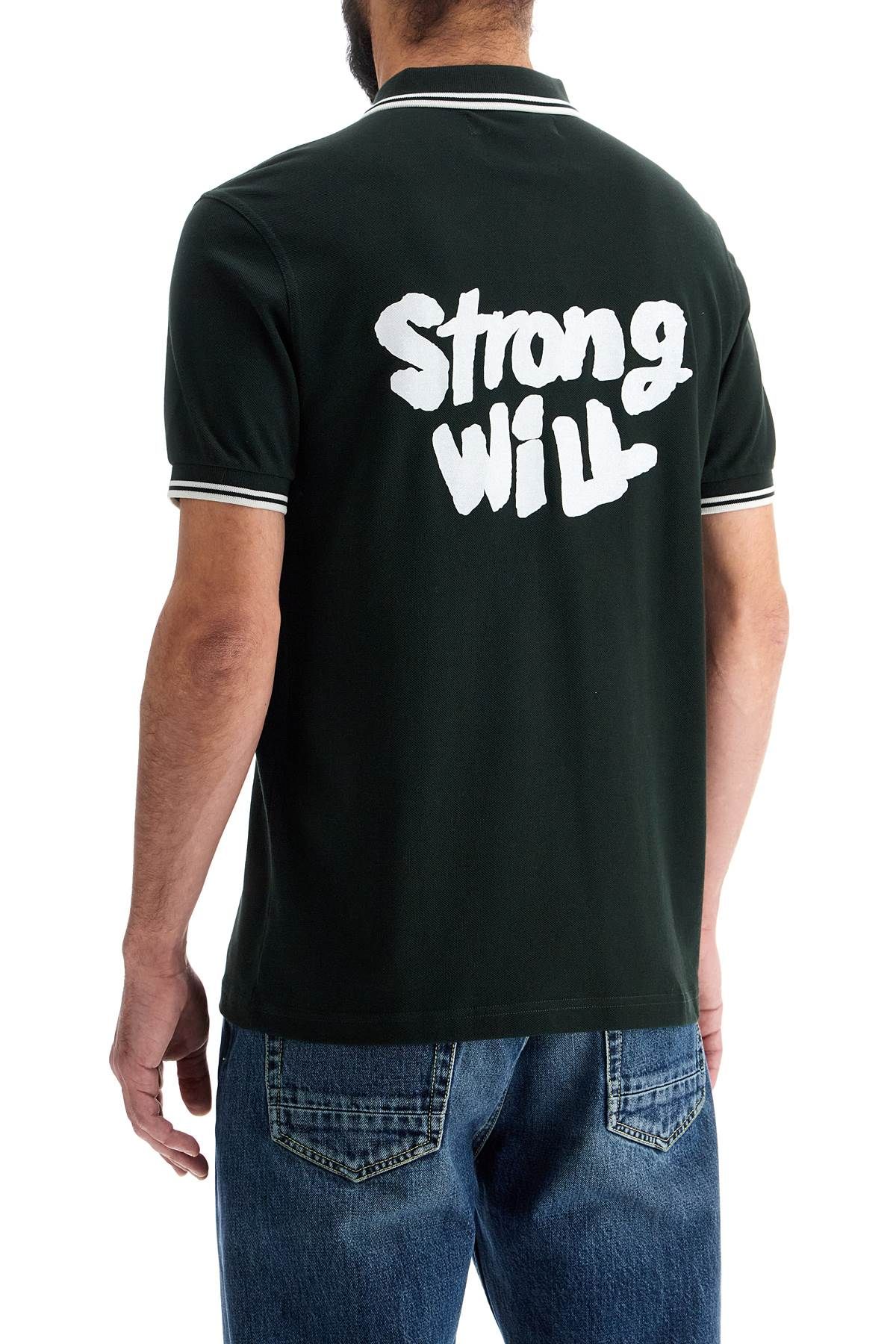 The Comme Des GarA§ons Shirt x Fred Perry polo is made of cotton piquAⓒ with contrasting embroidery on the chest and STRONG WILL print on the back. It features a classic collar, ribbed cuffs, and a regular fit. The model is 182 cm tall and wears size M.