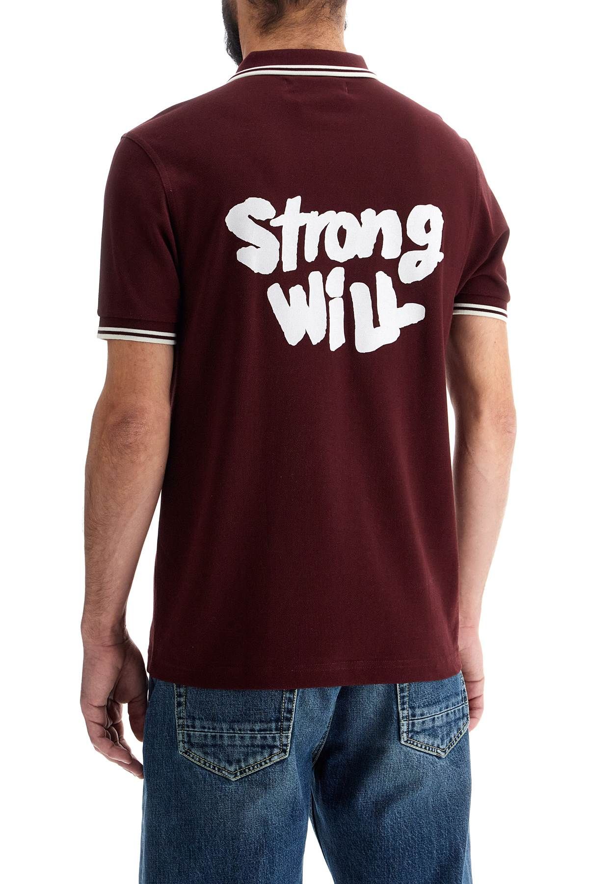 The Comme Des GarA§ons Shirt x Fred Perry polo is made of cotton piquAⓒ with contrasting embroidery on the chest and STRONG WILL print on the back. It features a classic collar, ribbed cuffs, and a regular fit. The model is 182 cm tall and wears size M.