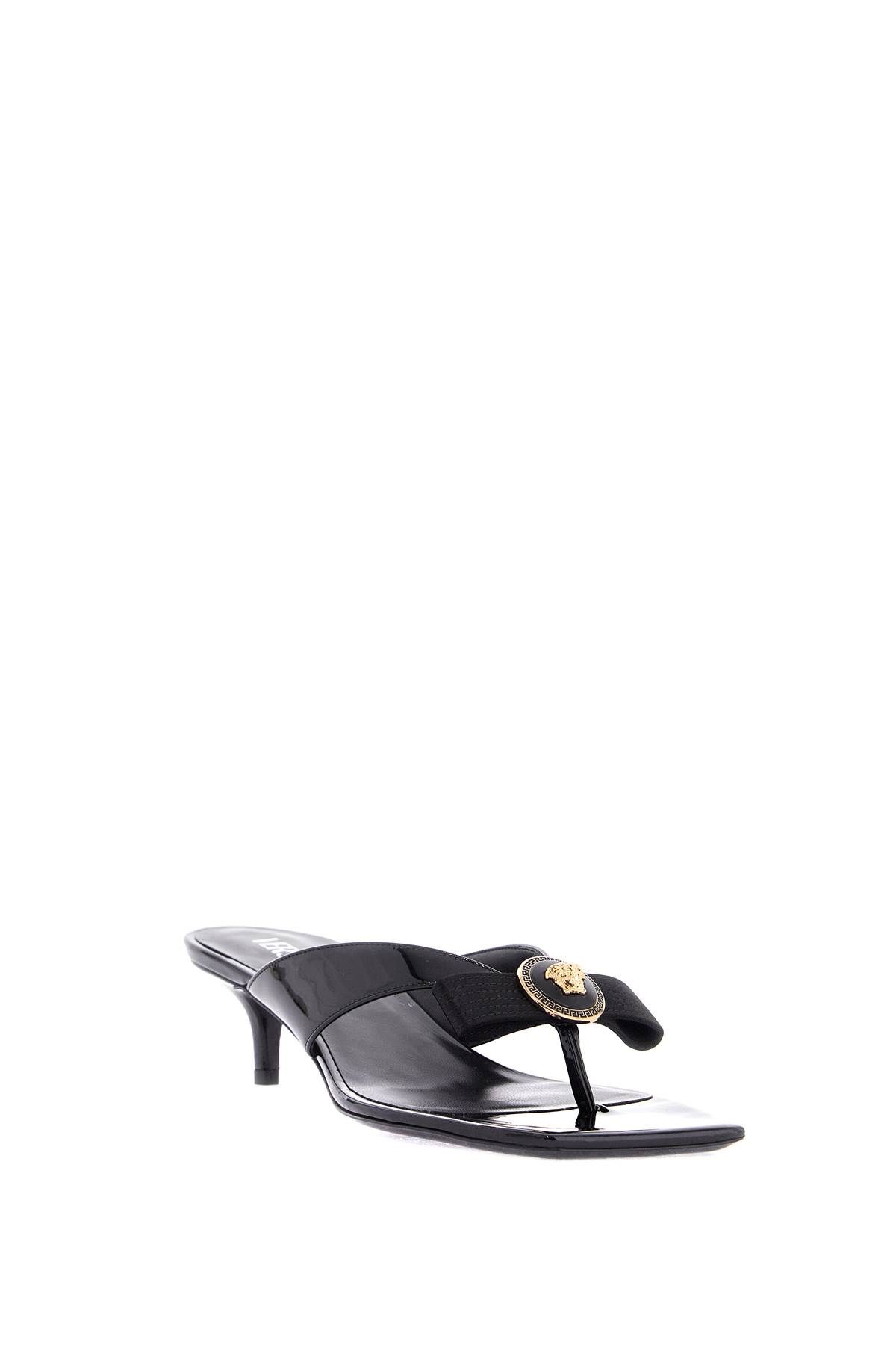 Versace thong mules made of patent leather and featuring the satin "Gianni ribbon" with enameled Medusa detail on the front. Covered kitten heel, leather footbed and leather sole.