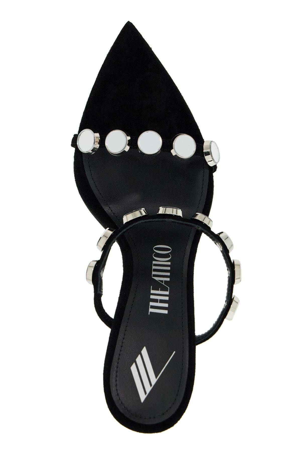The Venus mules by The Attico are made of suede leather with a pointed design, featuring two bands adorned with circular mirrors