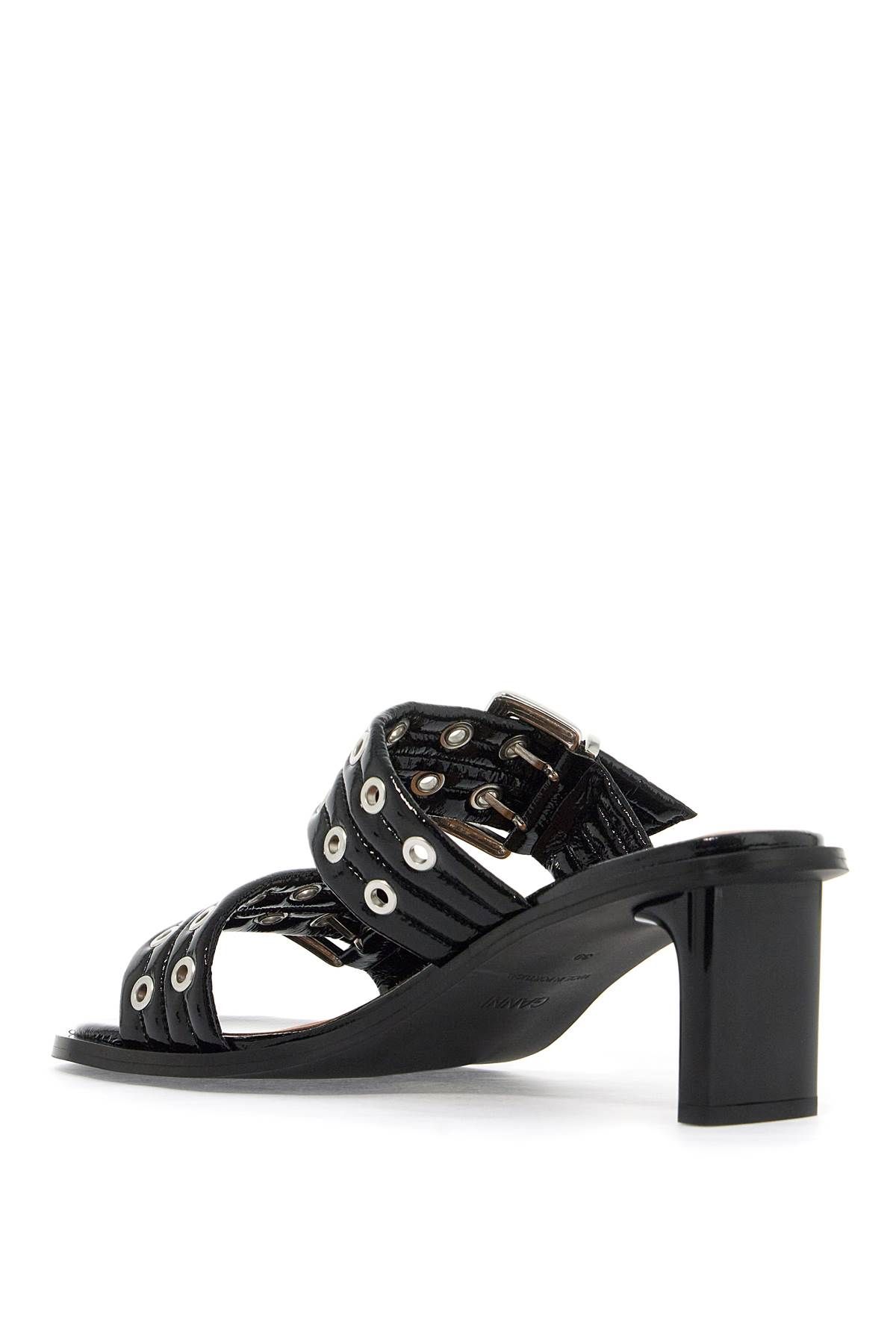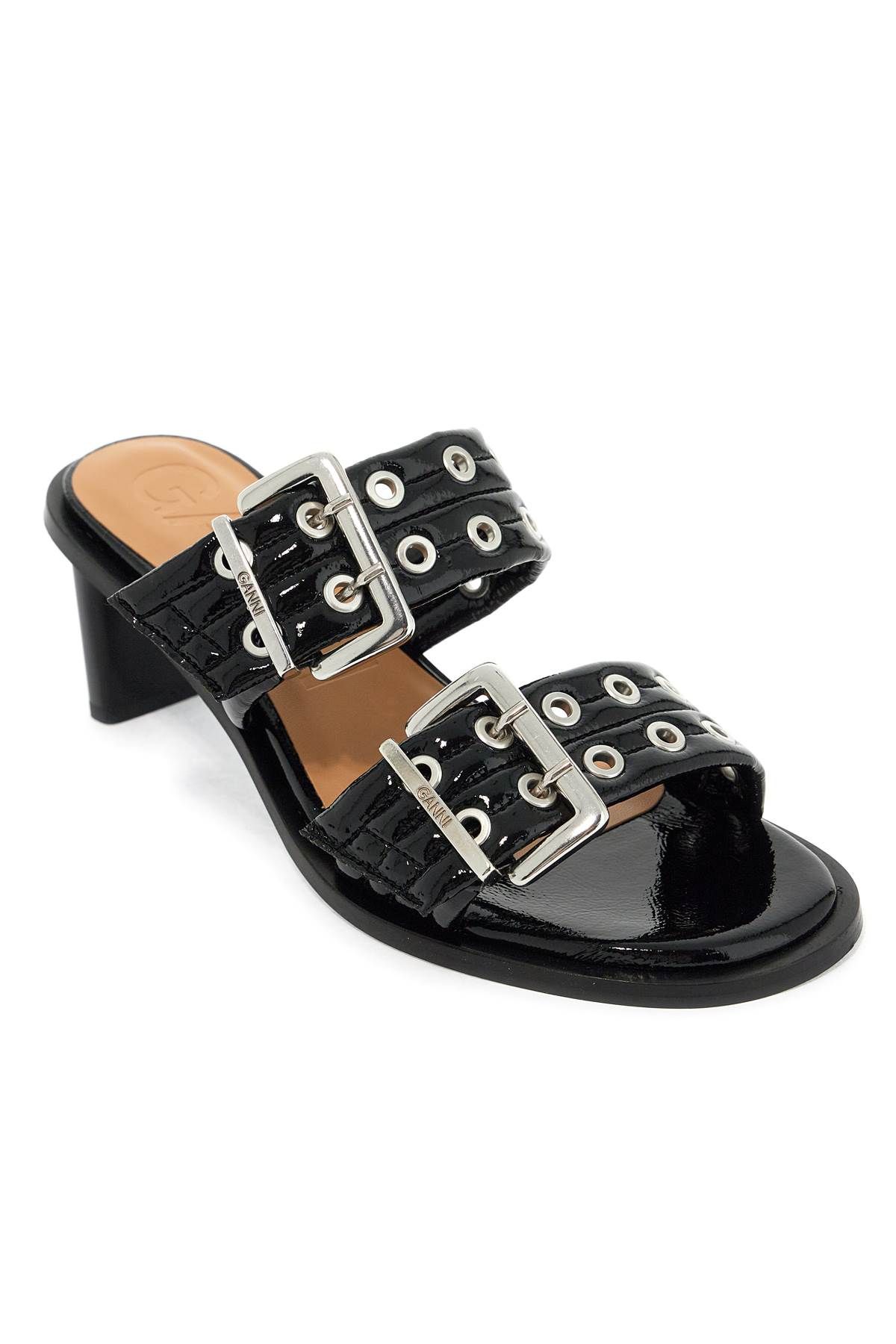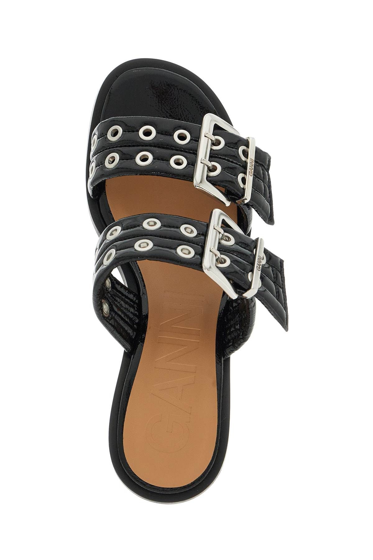 These GANNI mules are made of glossy eco-leather with wide quilted adjustable straps, adorned with large feminine buckles and eyelets along the entire length