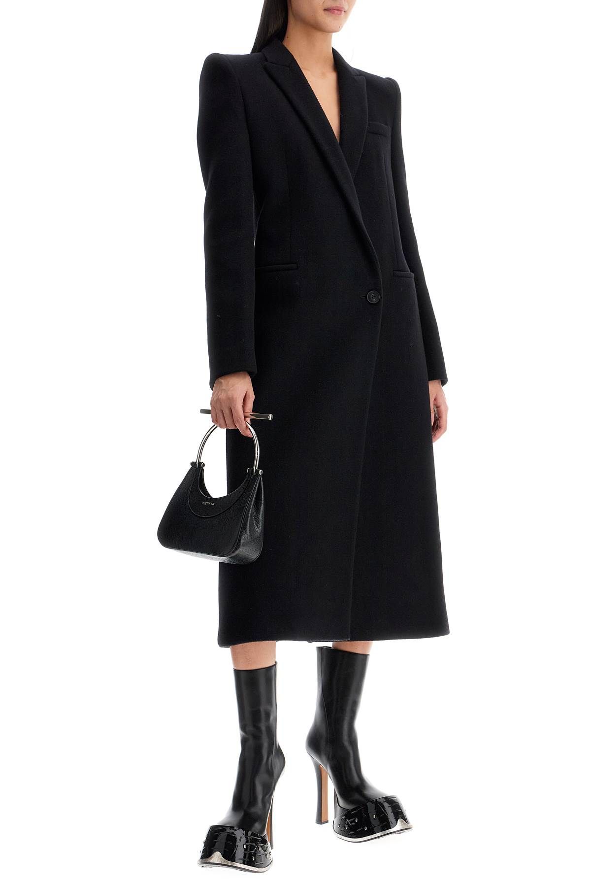 The Alexander McQueen mini bag is made of full-grain leather and features a soft yet structured design with side pleats and a large circular metal handle, complete with a branded horizontal cross-bar. It has a magnetic closure, a nappa interior with an open pocket, and an additional chain strap for a crossbody look. The metallic elements have a silver finish.