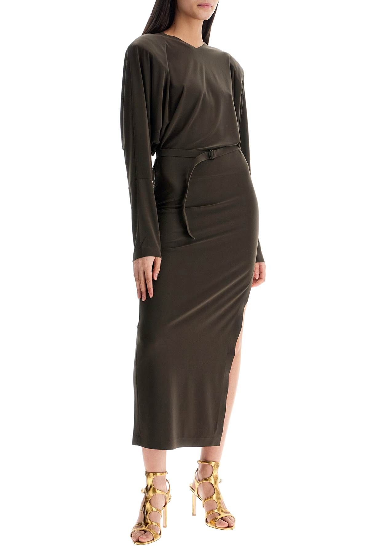 Brown Long Dress by NORMA KAMALI embodies timeless elegance. Innovative fabric, V-neckline, long sleeves, and side slit. Perfect for special occasions, combining comfort and sophisticated style.