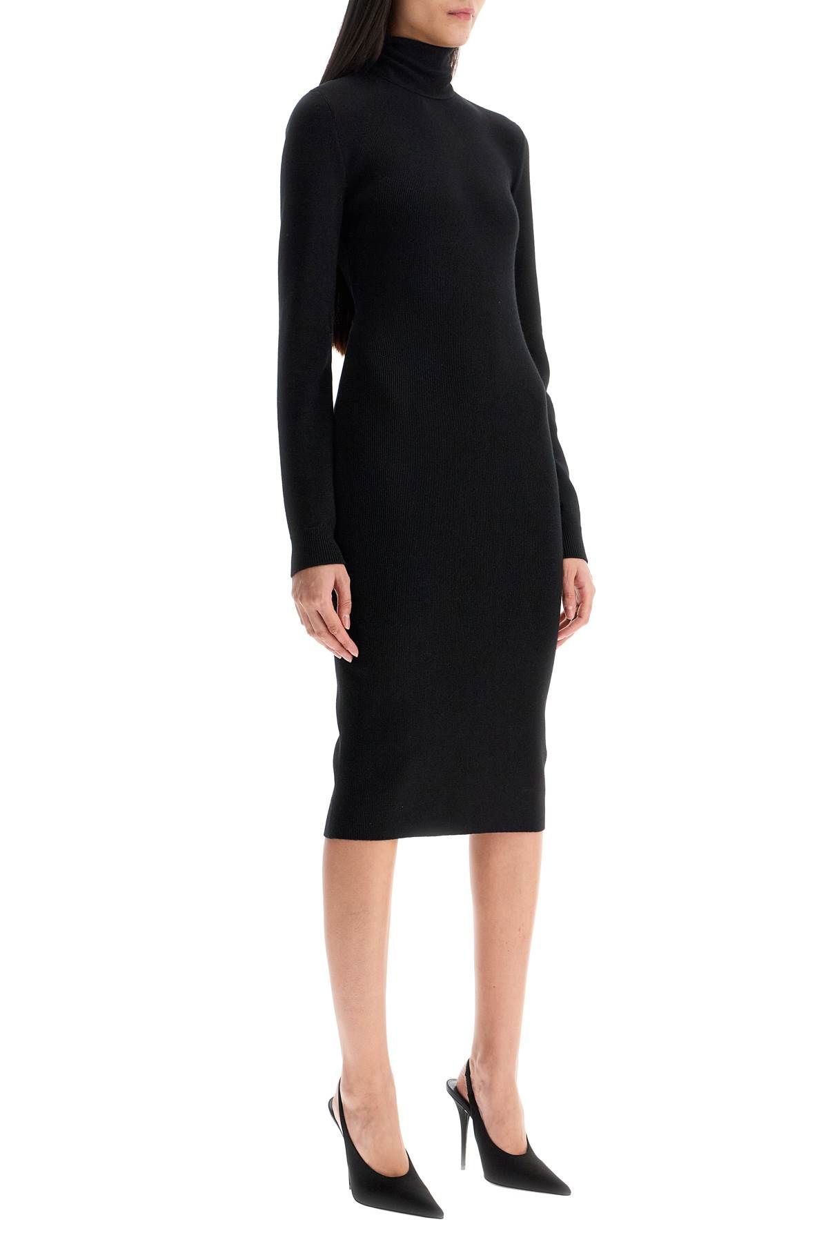 This midi dress by Givenchy is made of a blend of wool and cashmere, featuring a high collar and an open back with laces that create a cut-out effect. The ribbed edges and slim fit add to its overall style. The model is 177 cm tall and wears a size S.