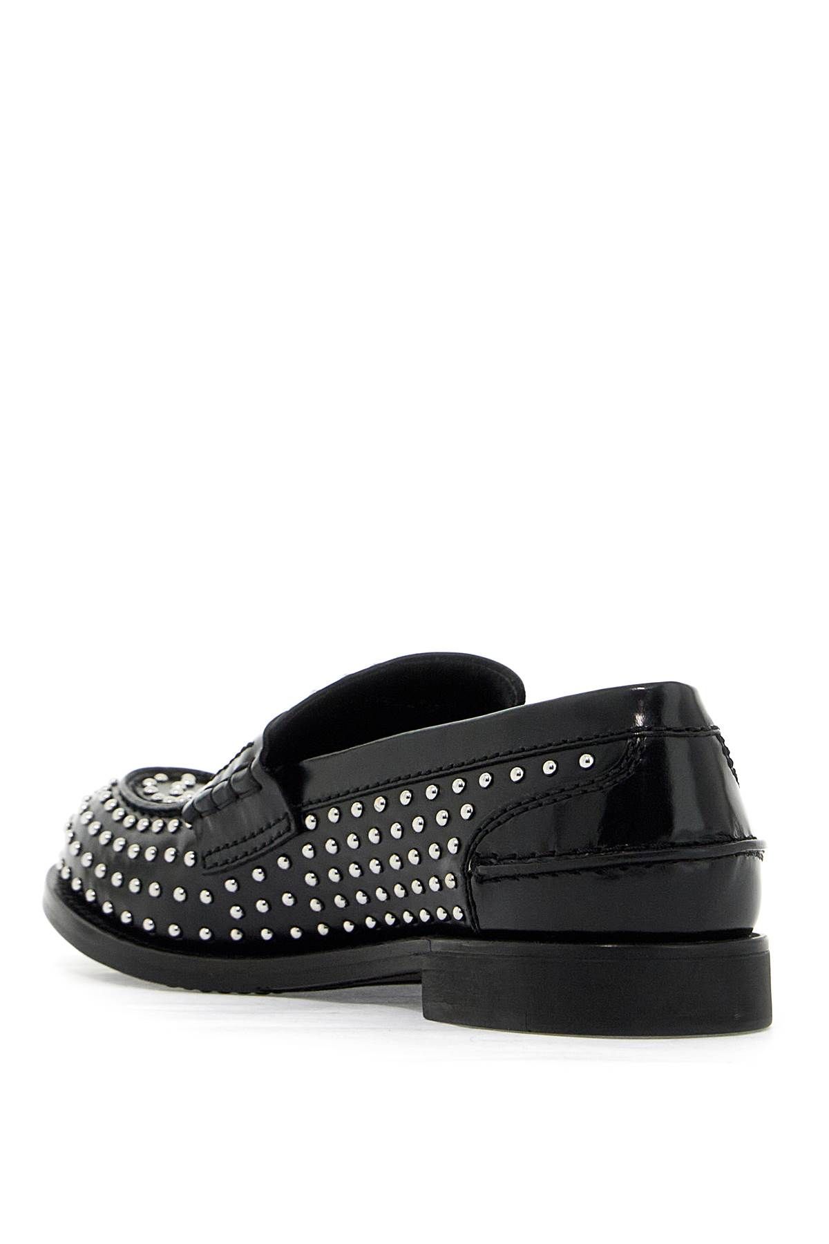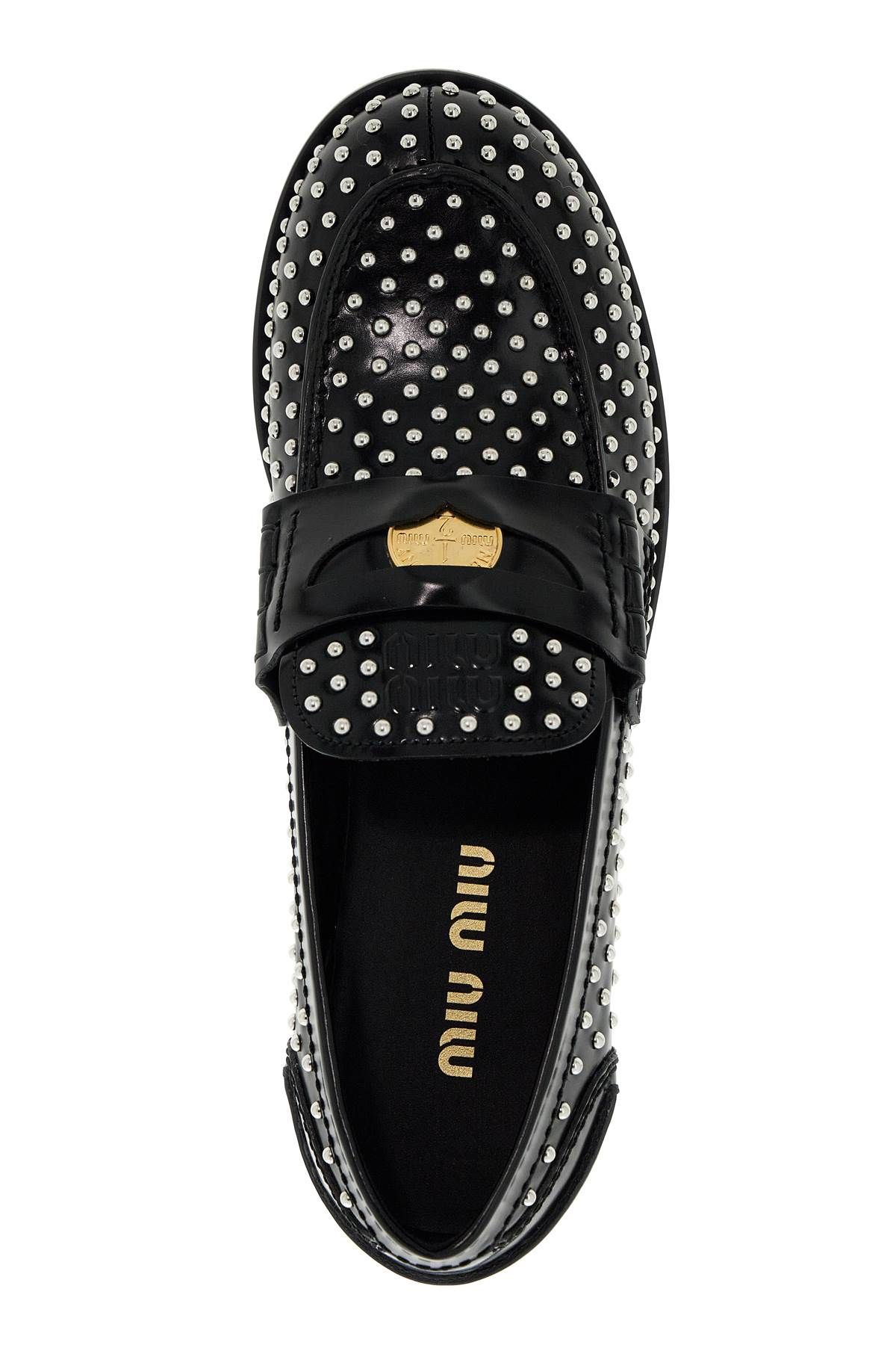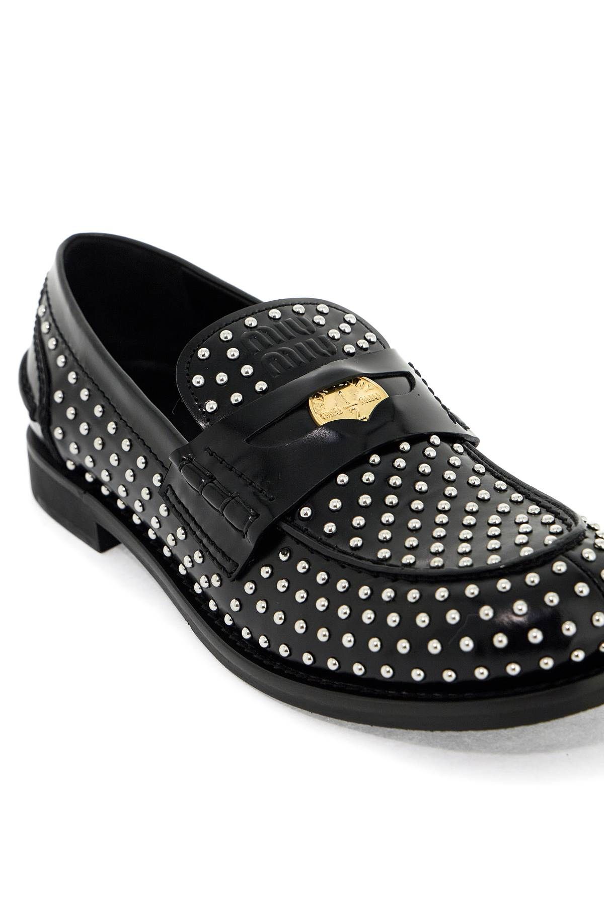Miu Miu penny loafers in brushed leather, embellished with all-over silver-tone studs and characterized by the gold-finished metal logoed coin inserted in the penny bar and by the embossed lettering logo on the tongue