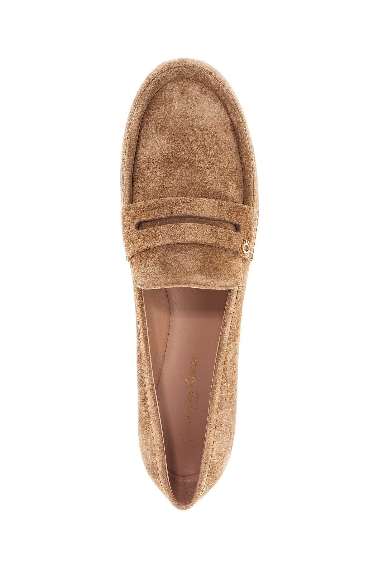 The Giorgia moccasins by Gianvito Rossi are made of suede leather with a rounded toe and embellished with a golden metal Ribbon detail on the vamp. The interior is lined in leather and the sole is made of rubber.