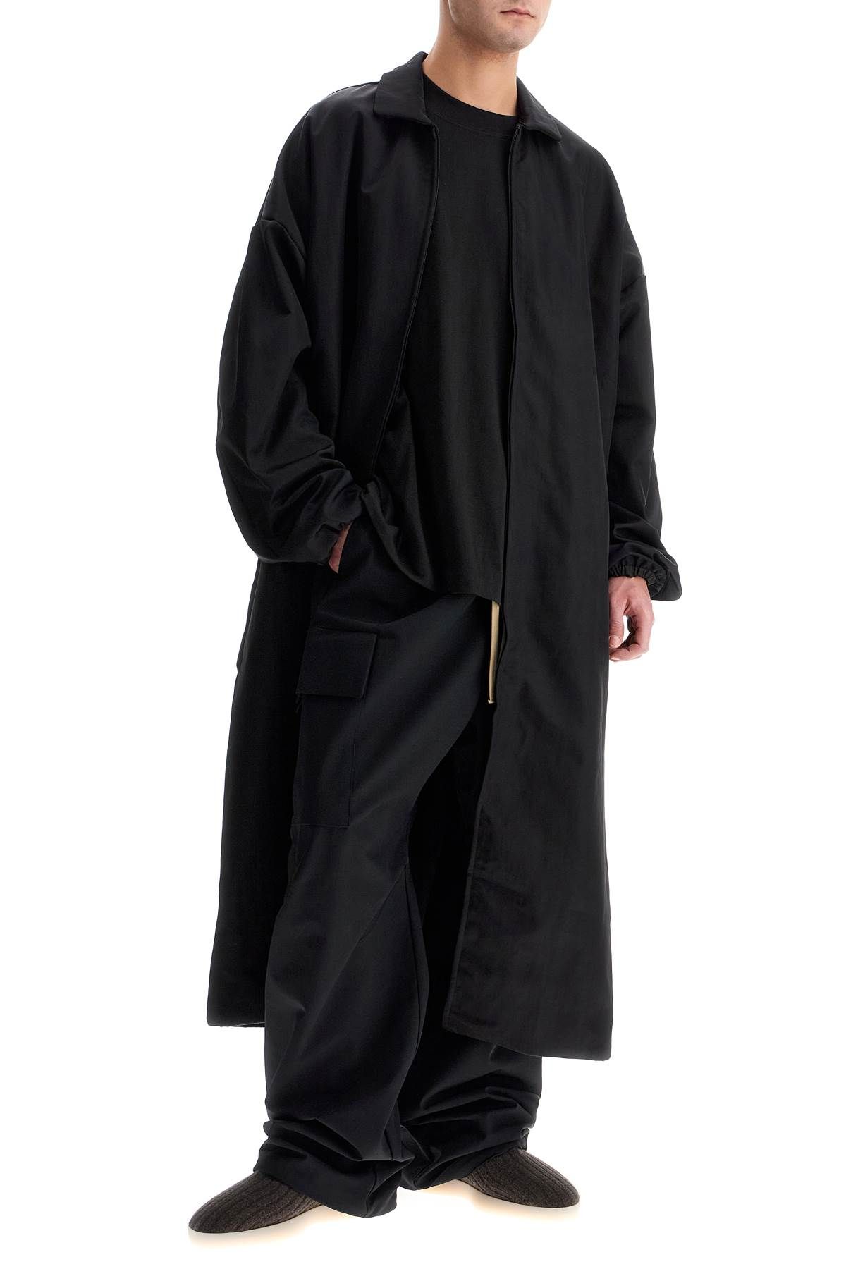 The Fear Of God Essentials long jacket is made of crinkled nylon twill and features an embroidered logo patch on the back. It has a spread collar, two-way zip closure, and elasticized cuffs. The interior is lined with perforated technical fabric. The fit is oversized. The model is 182 cm tall and wears a size M.