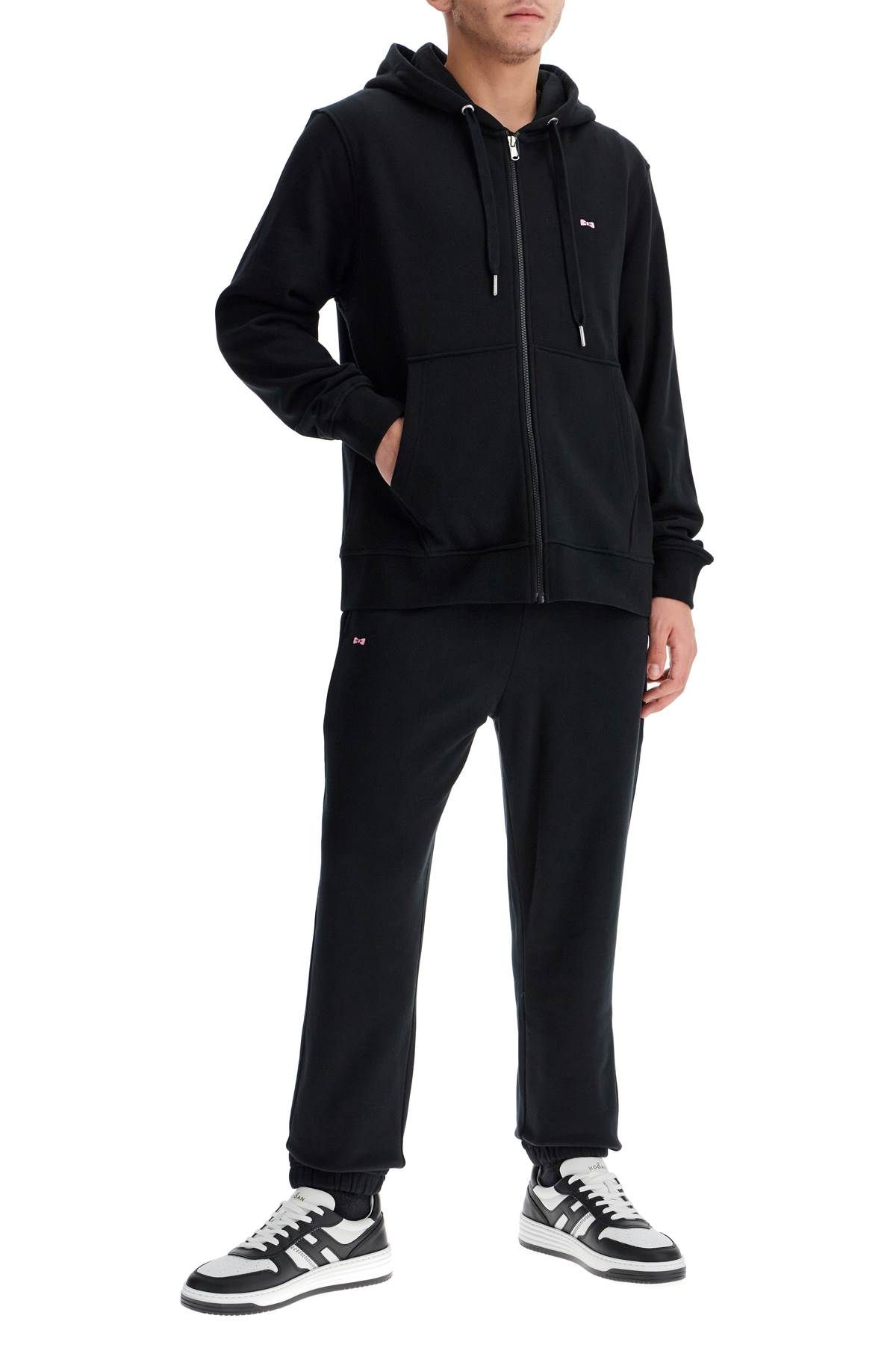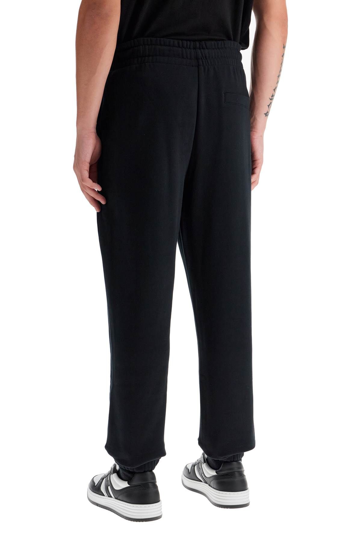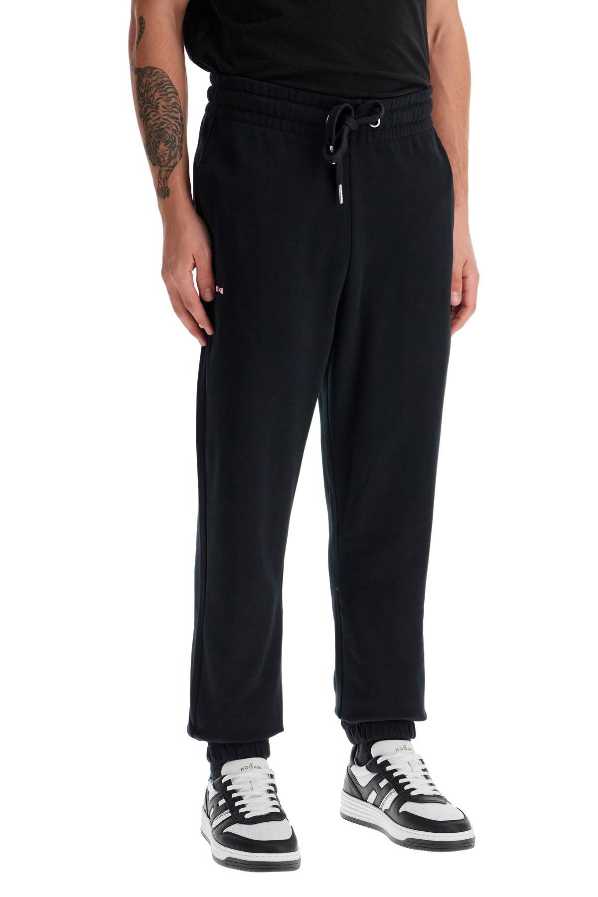 Eden Park joggers made of brushed cotton jersey, decorated with a small logo patch on the right leg. They feature an elasticated waistband with drawstring, French pockets and elasticated ankles. The fit is regular. The model is 182 cm tall and wears size M.