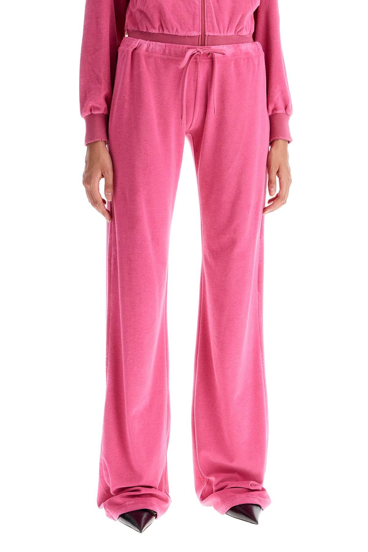 Balenciaga joggers made of technical cotton velvet with a used effect, featuring a straight and relaxed fit with a low elasticated waist adjustable by drawstring. The model is 177 cm tall and wears a size S.