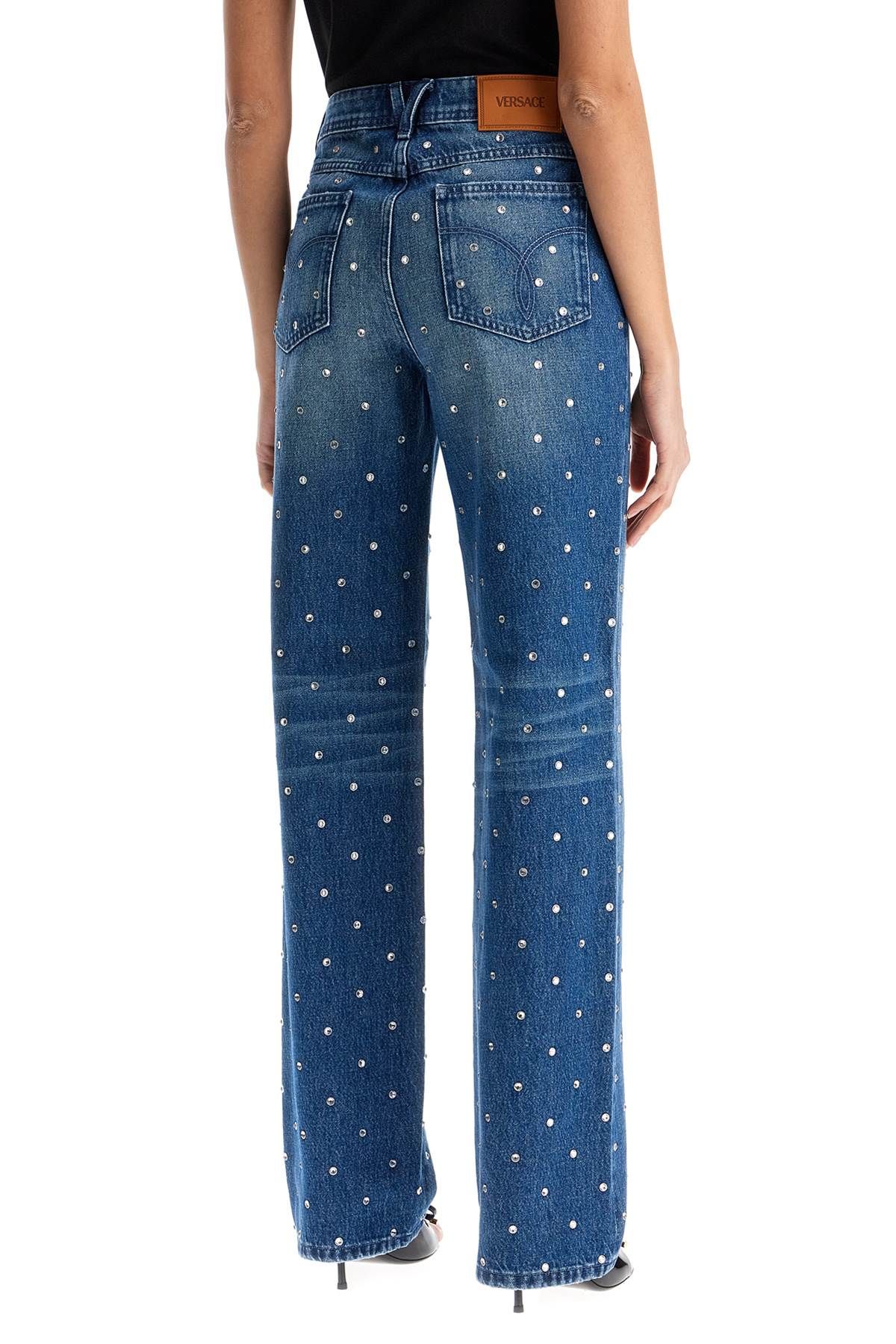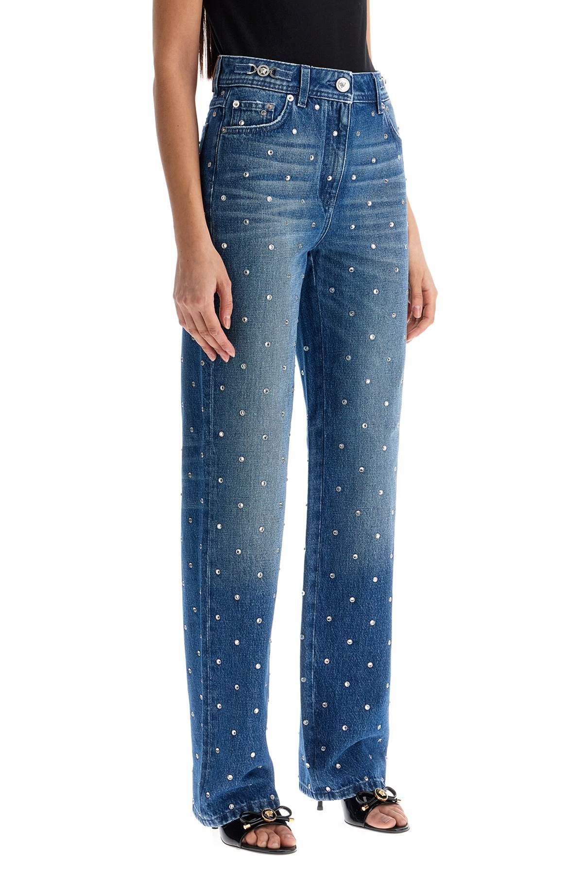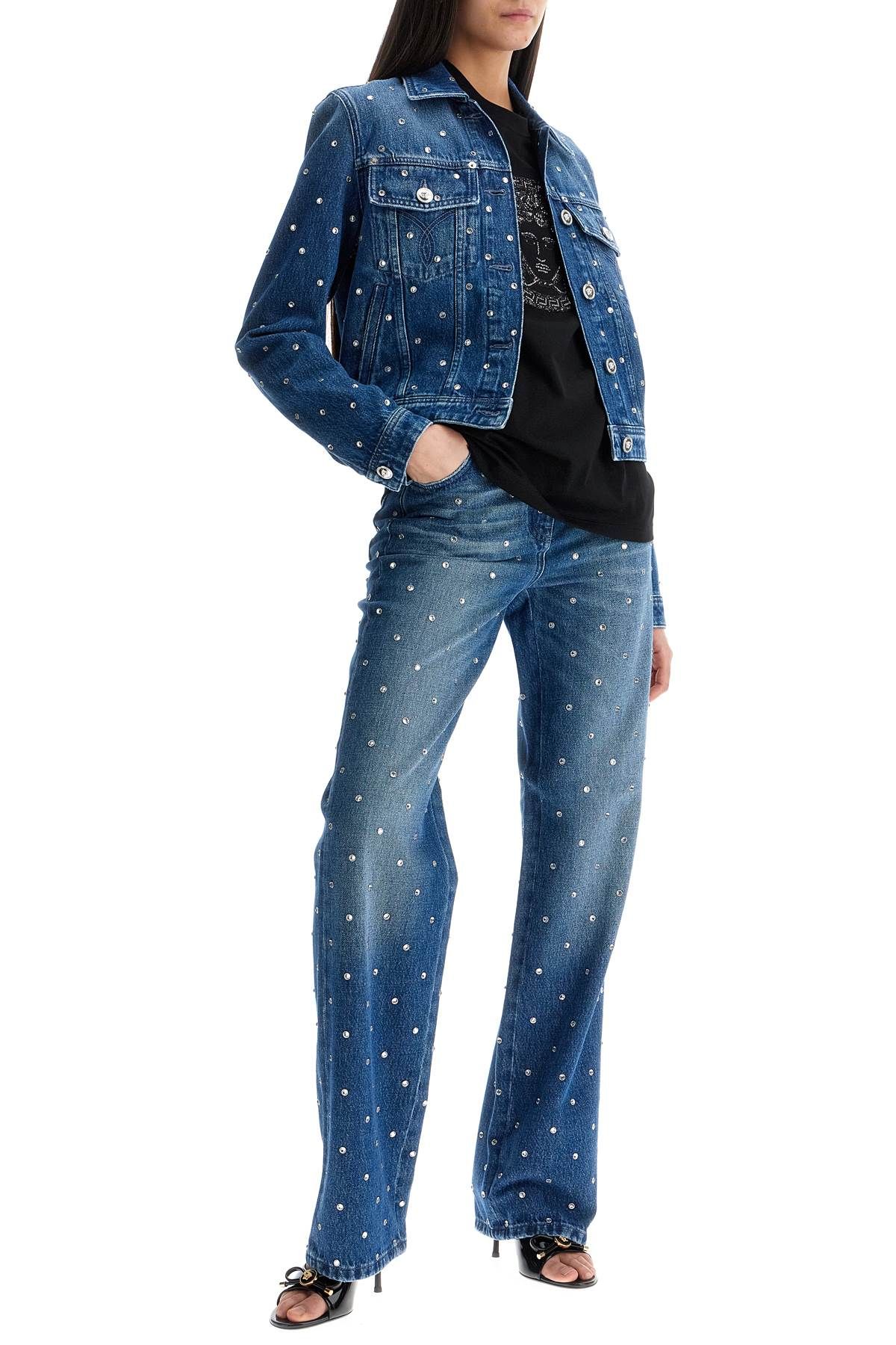 These Versace boyfriend jeans are characterized by studs with crystal appliques all over and metal Medusa '95 details on the waistband. Made of distressed denim with a classic five-pocket construction, they have a straight and comfortable fit with a medium rise, complete with belt loops and a hidden zip closure and Medusa button. The model is 177 cm tall and wears size 26.