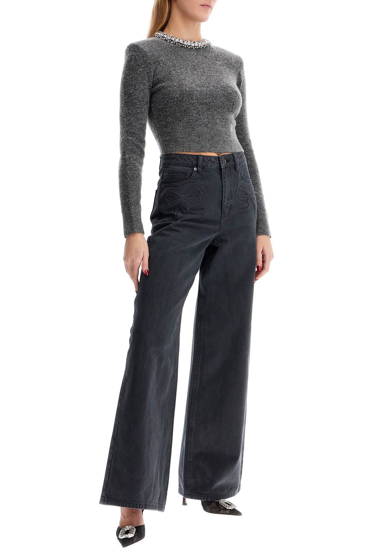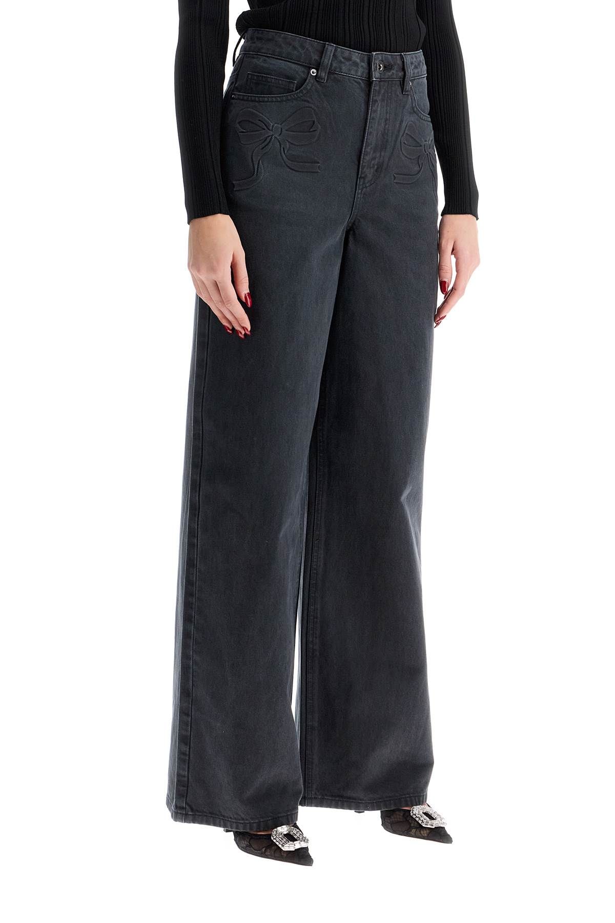 These five-pocket jeans by Self-Portrait are made of cotton denim and adorned with printed bows. They feature a mid-rise waist, hidden zip closure, and button fastening, as well as a relaxed fit with straight legs. The model is 177 cm tall and wears a size 26.