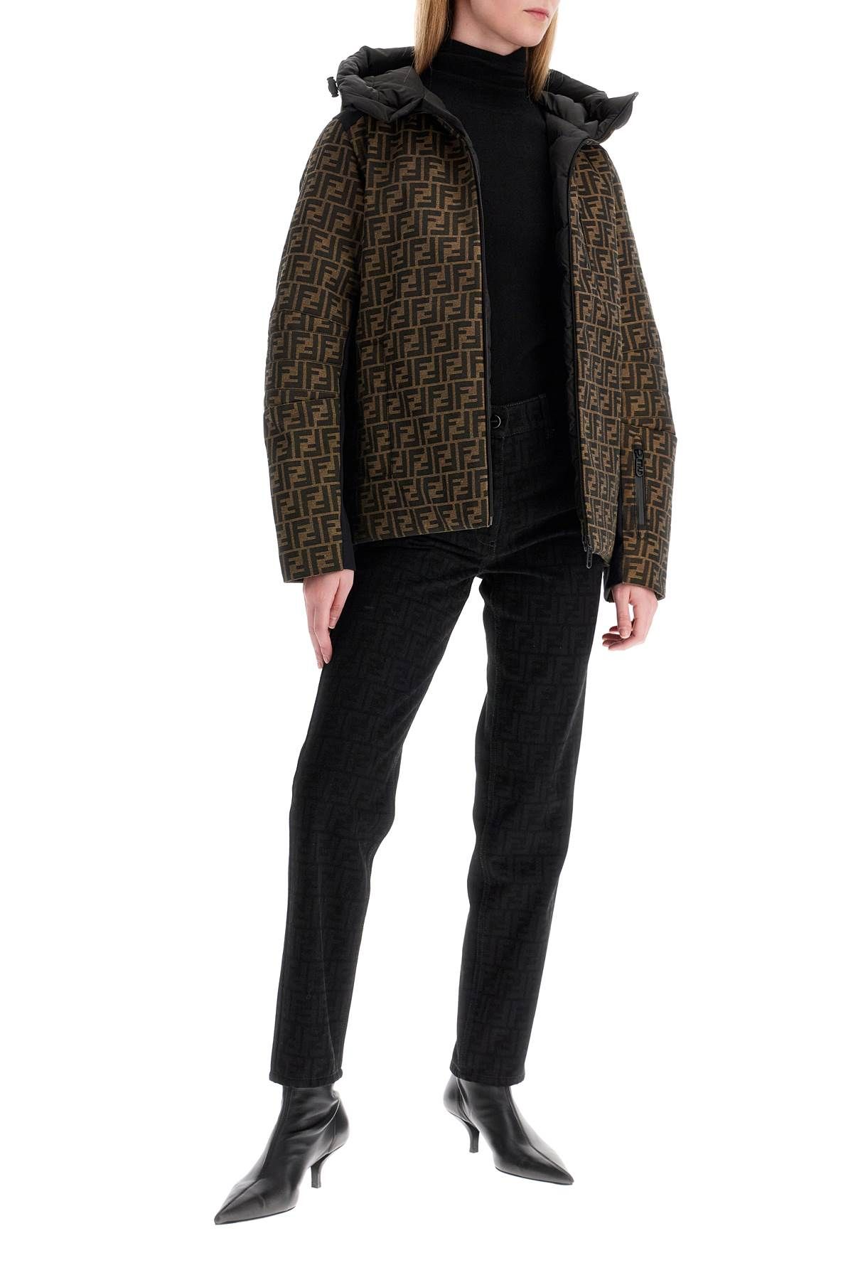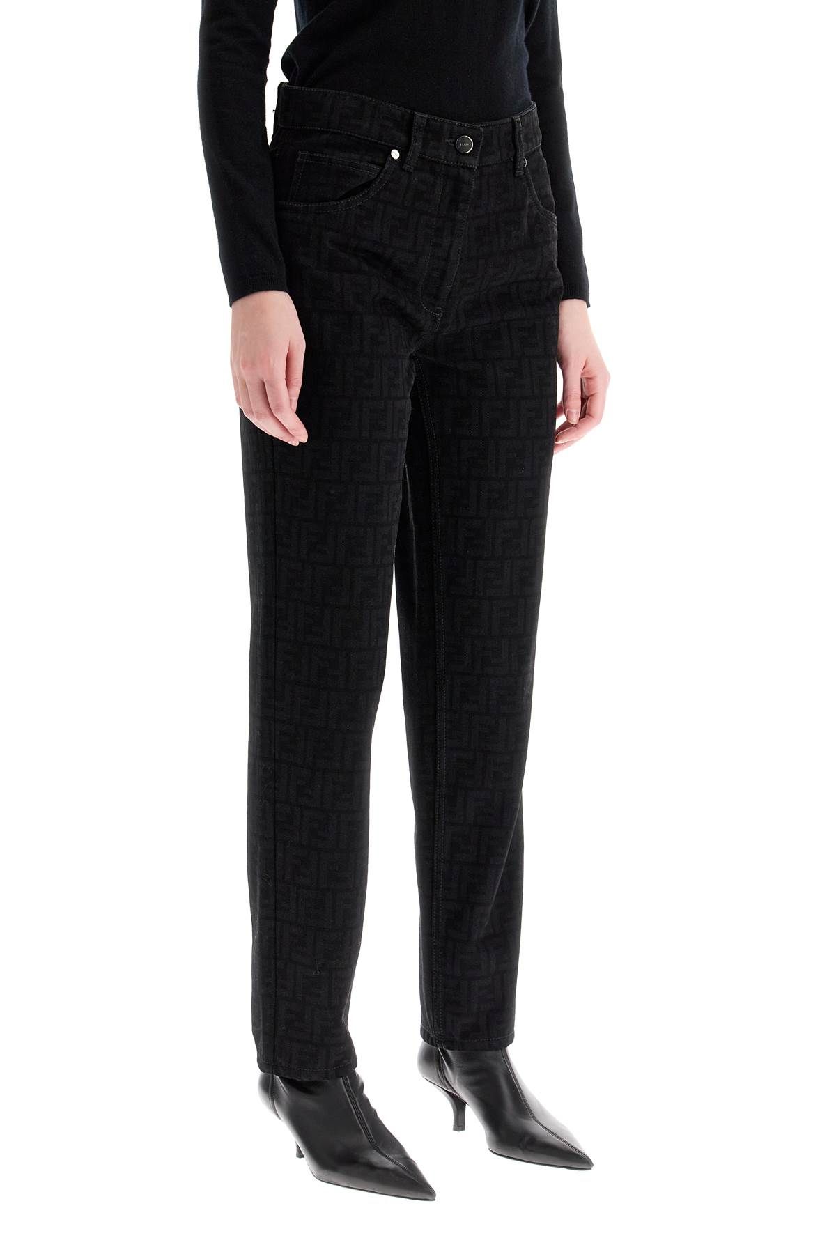 These Fendi five-pocket jeans are made of denim with an all-over FF laser pattern and finished with a branded leather patch on the back