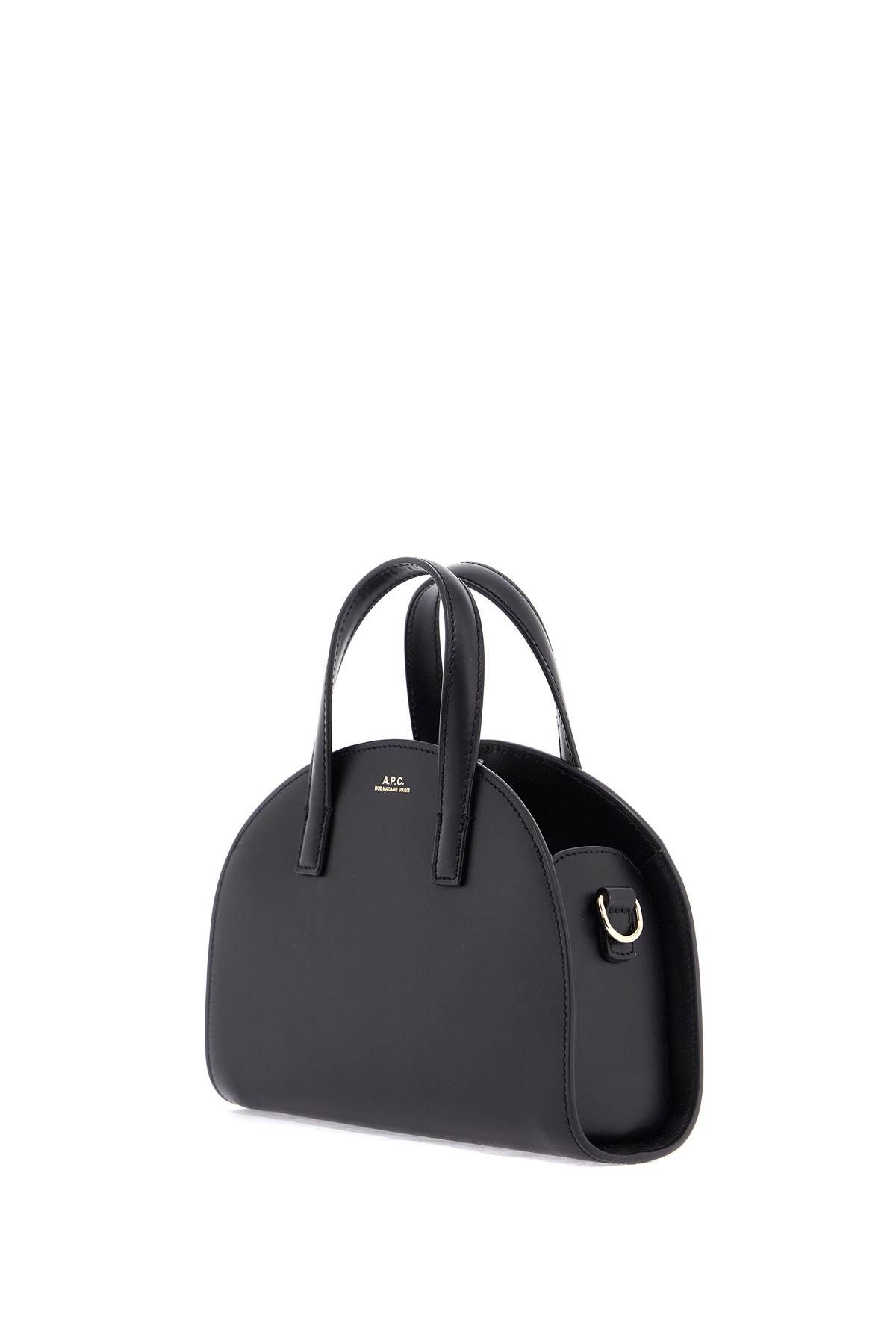 The A.P.C. Demi-Lune tote bag is made of smooth leather and features a rigid half-moon silhouette. It has double handles, a small gold printed logo, magnetic closure, and a fabric interior with an open pocket and a zippered pocket. It also comes with an adjustable and removable shoulder strap. The metal hardware has a platinum finish.