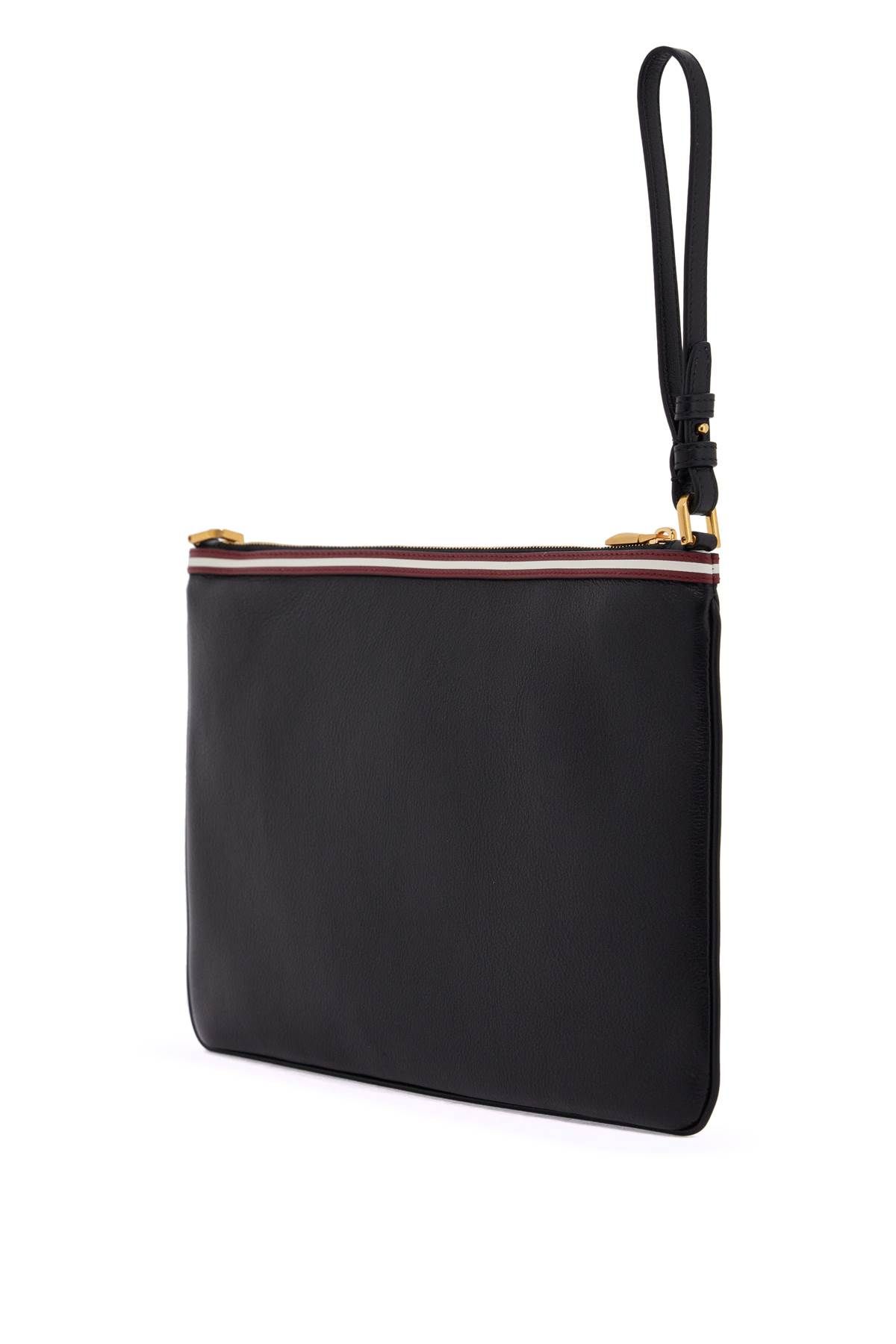 The Bally pouch is made of hammered leather, decorated with a golden logo lettering and outlined by the classic Bally Ribbon
