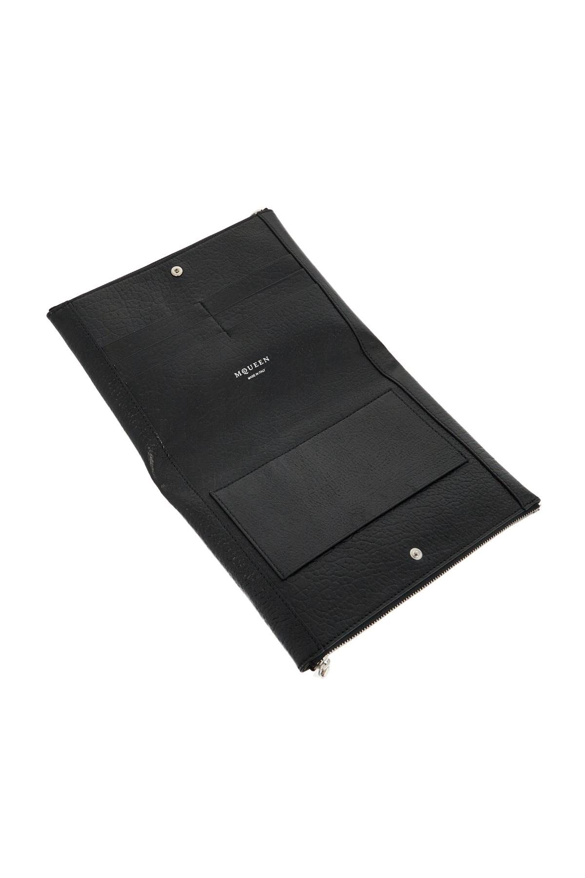 The Alexander Mcqueen Cross-bar Pouch is made of soft hammered leather, finished with a metal logo lettering on the front and featuring a book-style design. The model is closed by a snap button and opens to reveal a flat pocket and six credit card slots, divided into two compartments, both with zip closure, nappa lining and an open pocket inside. Metallic elements in silver finish complete the look.