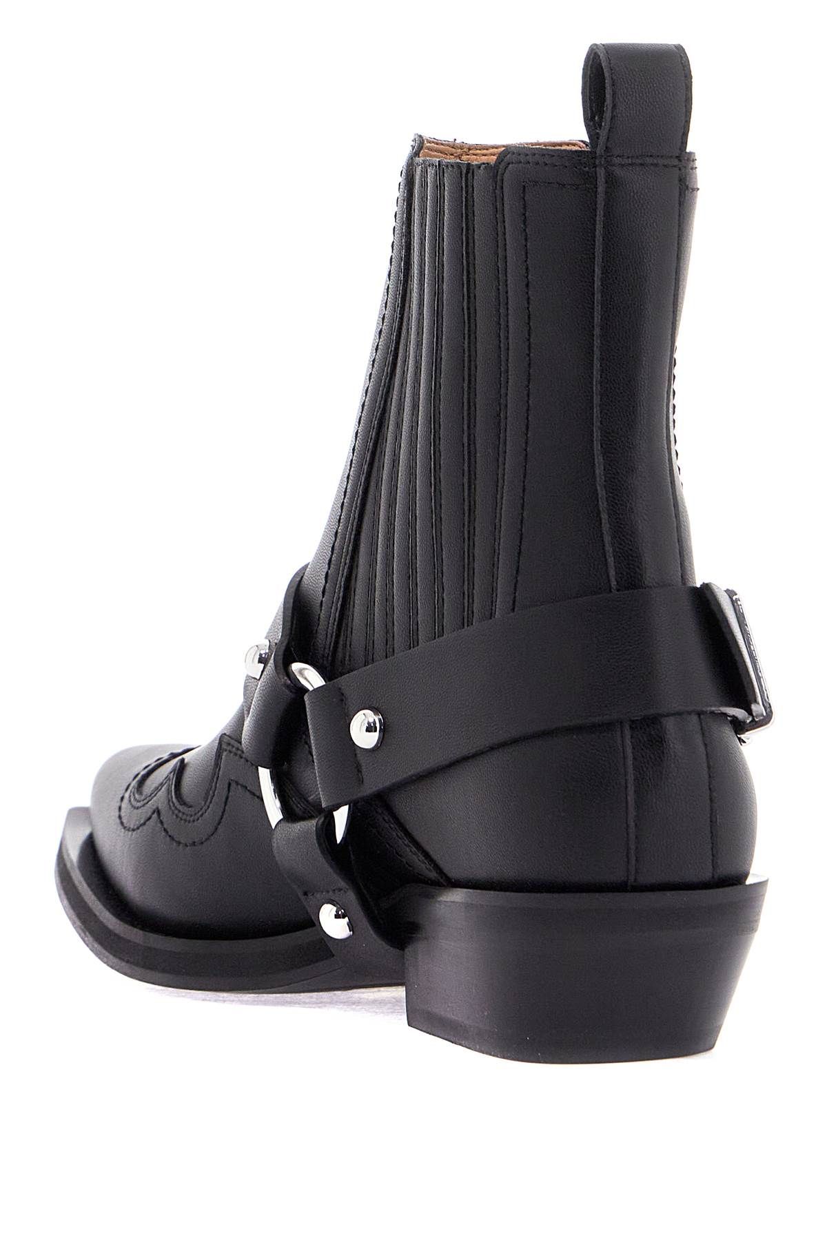 Ganni's Chelsea boots are made of recycled leather and feature a western-inspired design with classic buckles and silver metal logo lettering