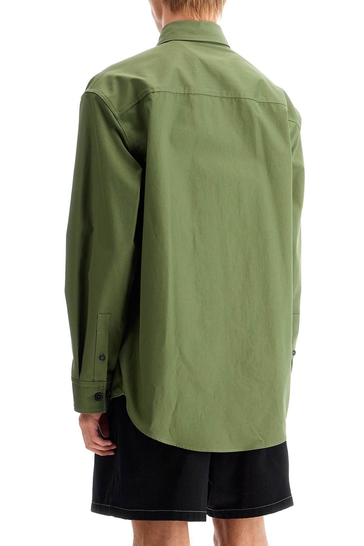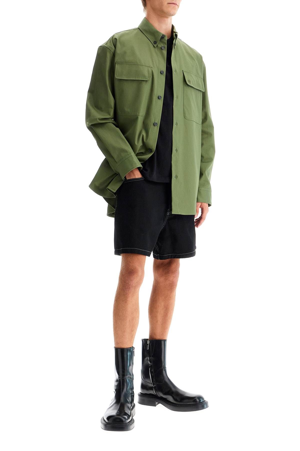 The Off-White Overshirt is made of pure cotton gabardine with a minimal design featuring a button-down collar and French placket. It has applied pockets with flaps and hidden buttons, including one detailed with tonal logo embroidery. The shirt also has a rounded hem, back yoke, and adjustable cuffs. Its boxy fit adds to its modern aesthetic. The model is 187 cm tall and wears an IT size 48.