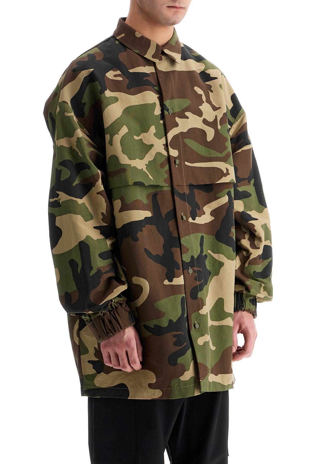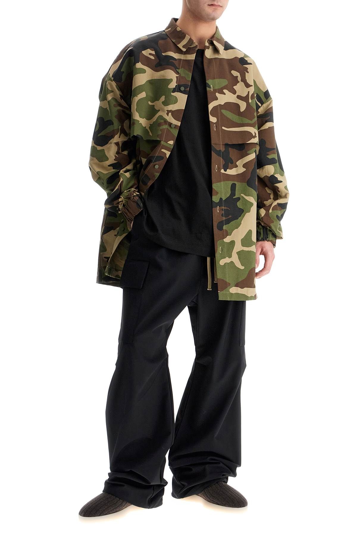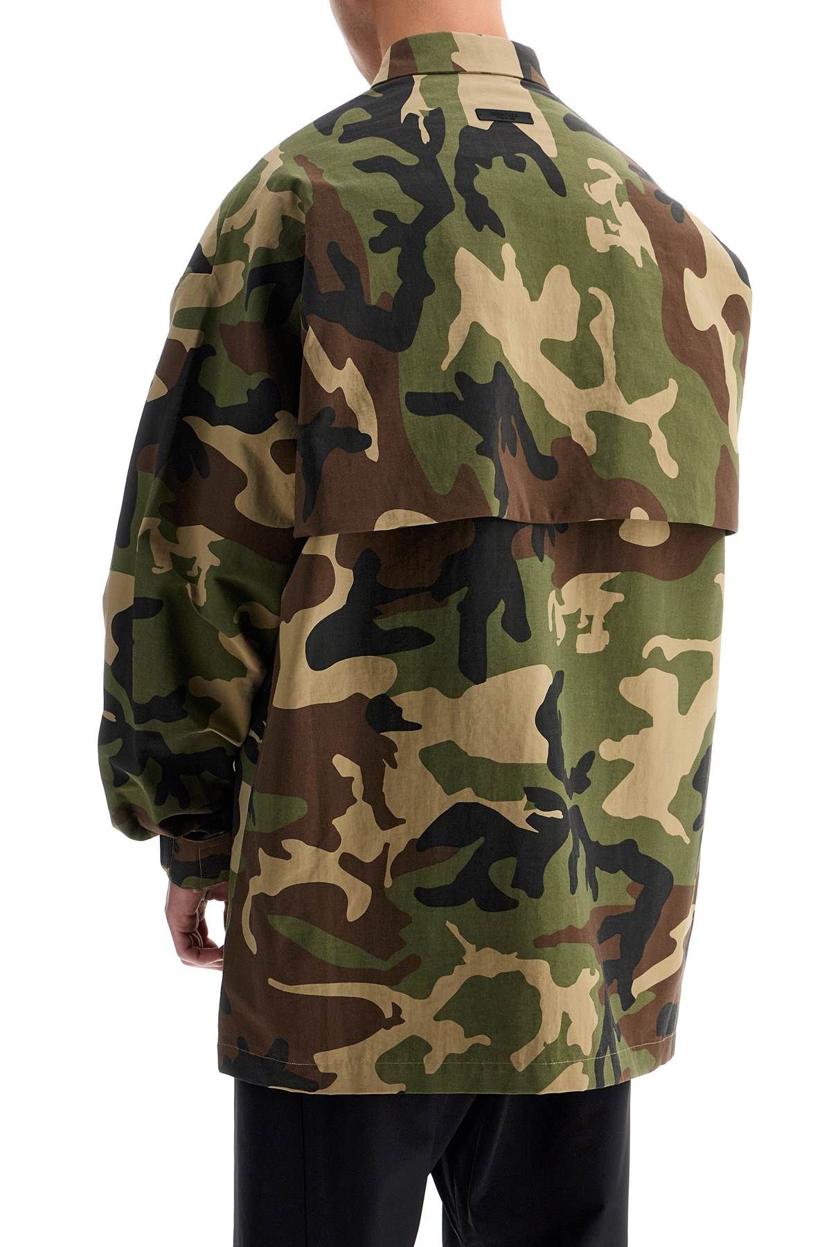 The Fear Of God Essentials Overshirt is made of recycled nylon blend in a camouflage pattern