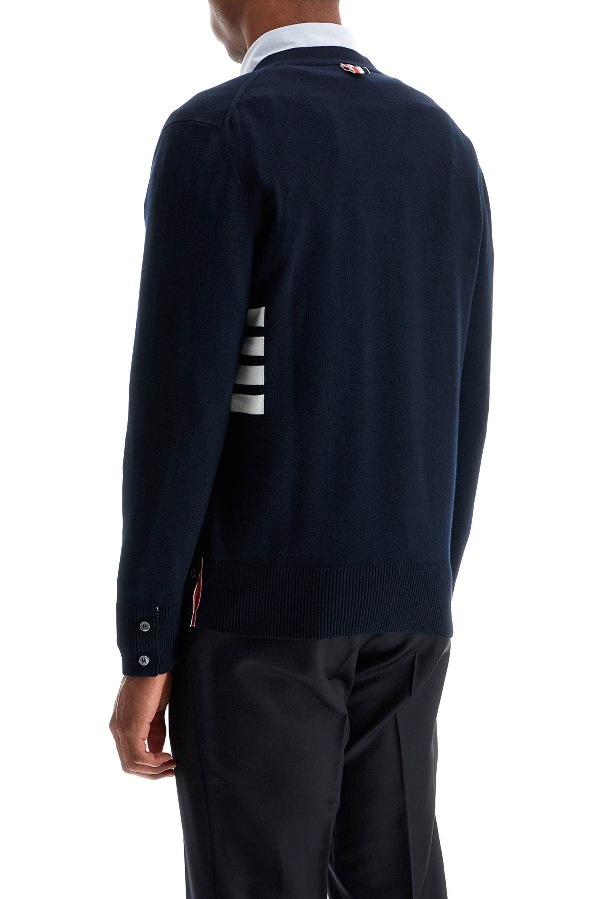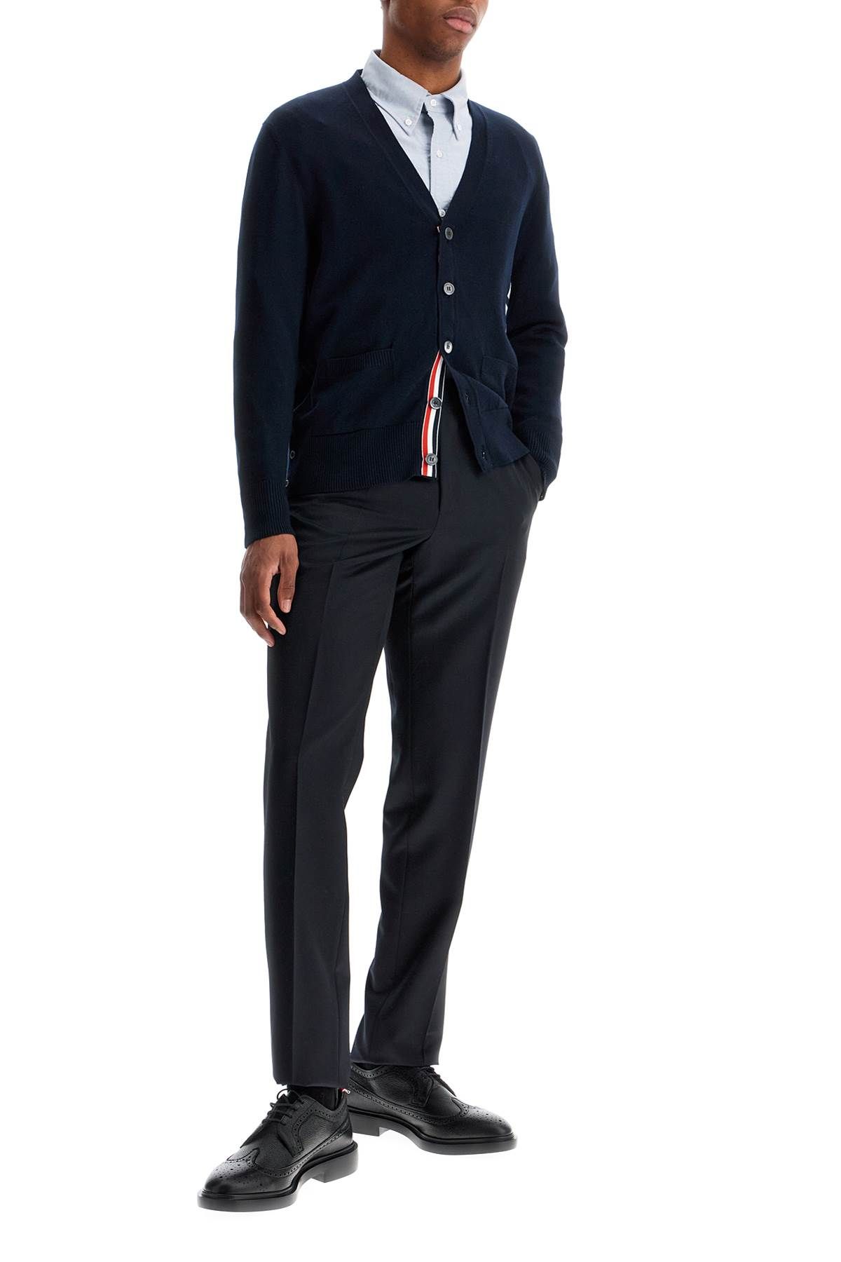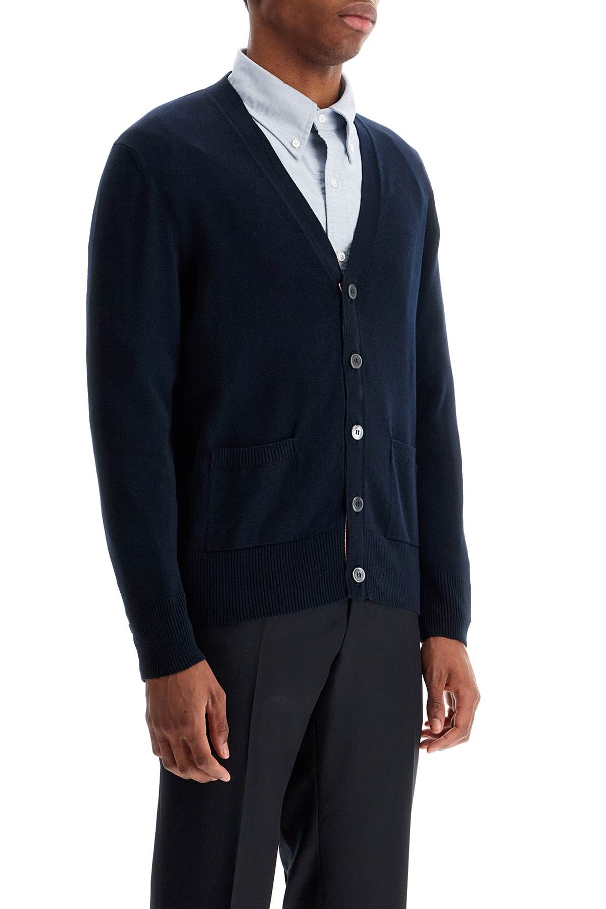 This Thom Browne cardigan is made of pure cotton yarn and features the classic 4-bar detail on the side, as well as tricolor grosgrain finishes. It has a V-neckline, button closure, front slit pockets, closed side slits with buttons, and ribbed edges. Regular fit. The model is 182 cm tall and wears size 2 Thom Browne.