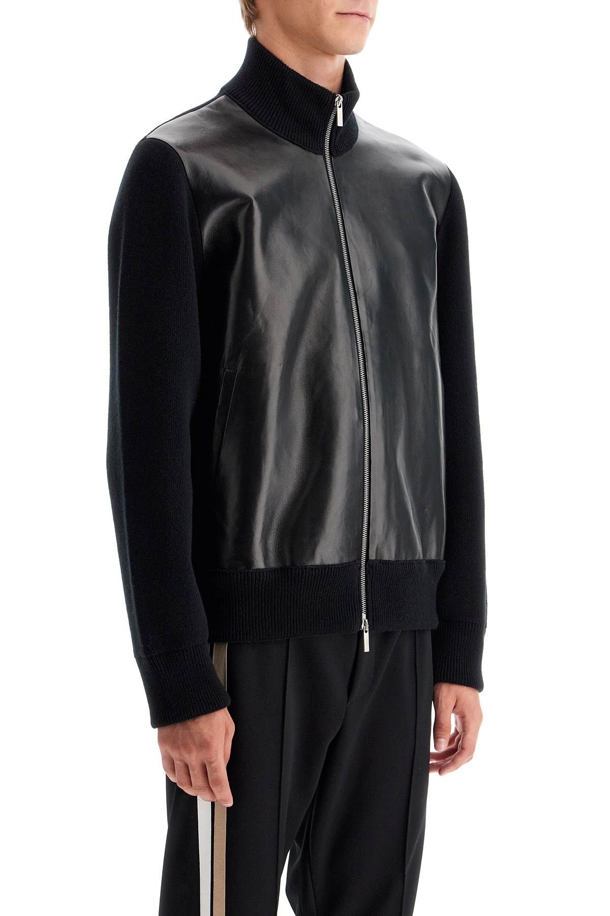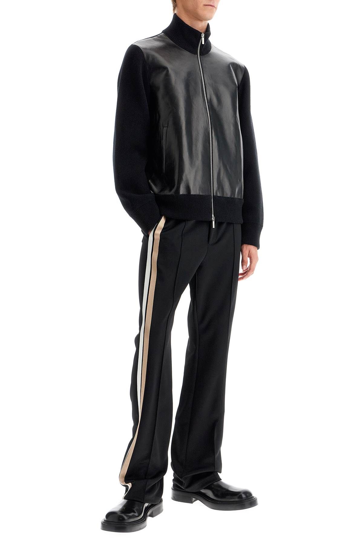 This high-neck cardigan by Ferragamo is made of pure virgin wool with a front panel covered in tone-on-tone lamb leather. It features side welt pockets and a double-slider zip closure, and is finished with ribbed edges for a regular fit. The model is 187 cm tall and wears size L.