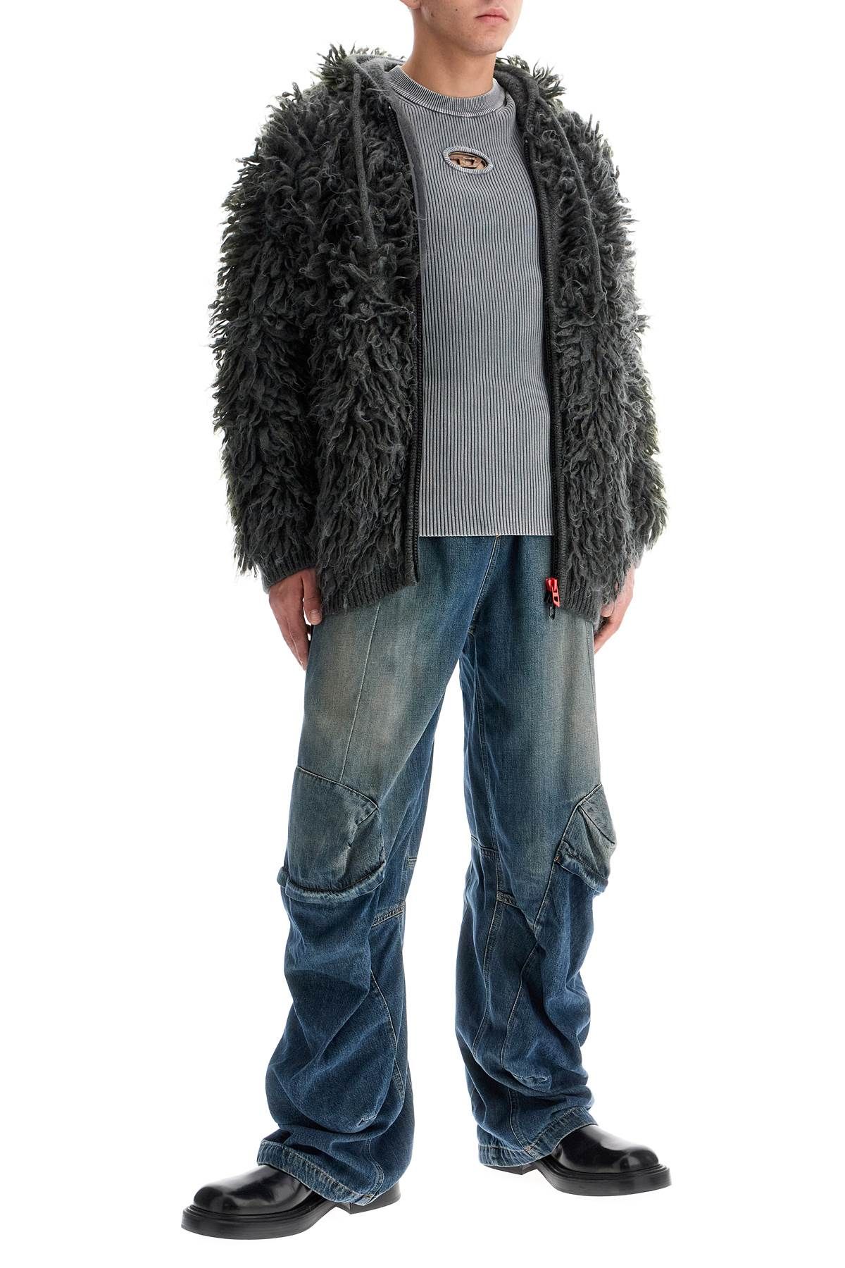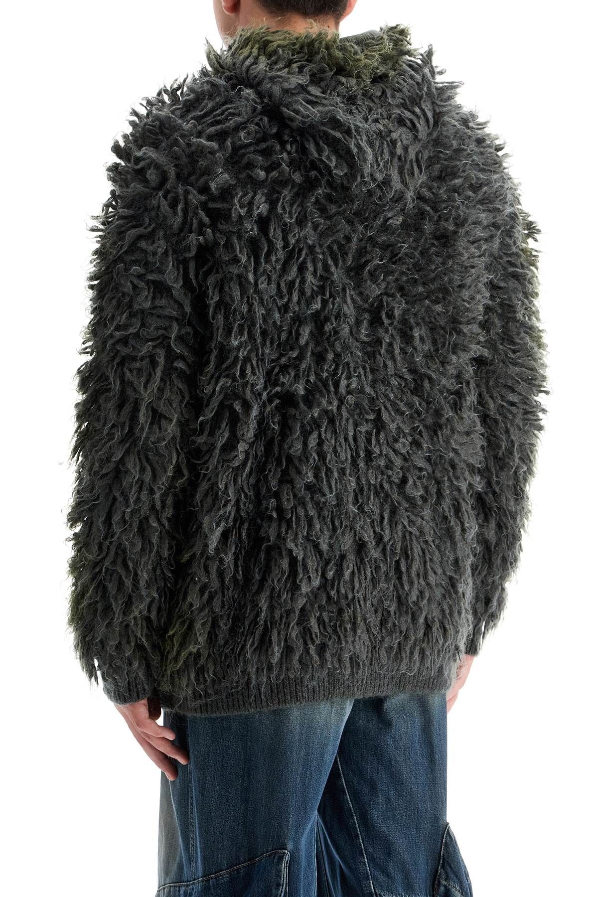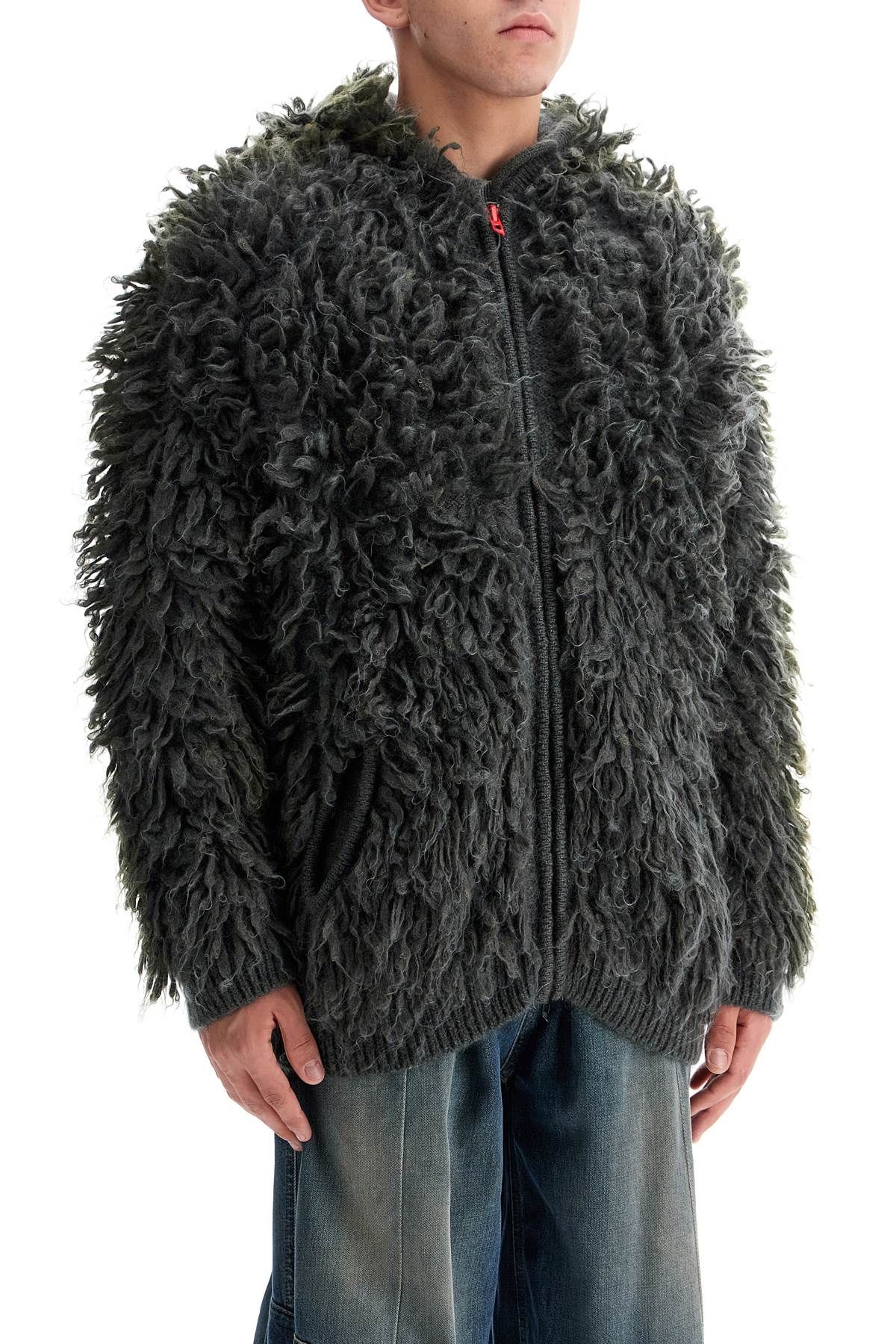 This Diesel cardigan with hood is made of a blend of mohair and boucle wool, featuring a mix of recycled and responsibly sourced fibers for a three-dimensional look completed by a sprayed color veil