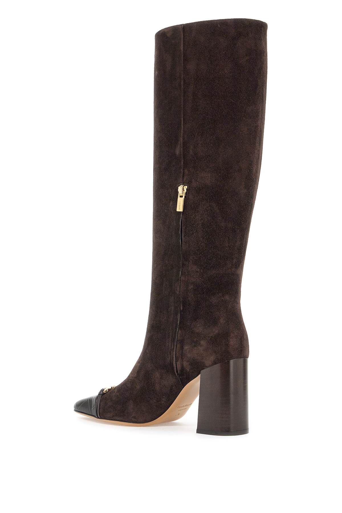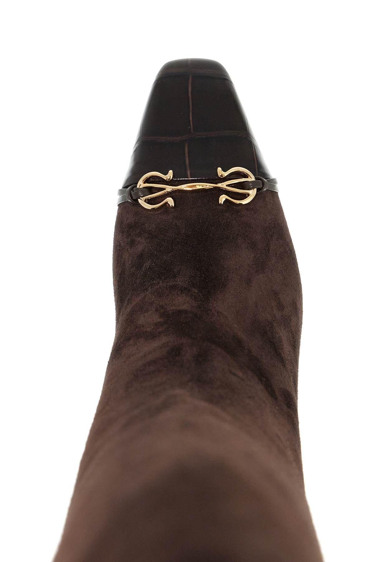 FERRAGAMO boots made of suede leather, decorated with a golden metal Gancini element and detailed by the square toe in embossed crocodile leather